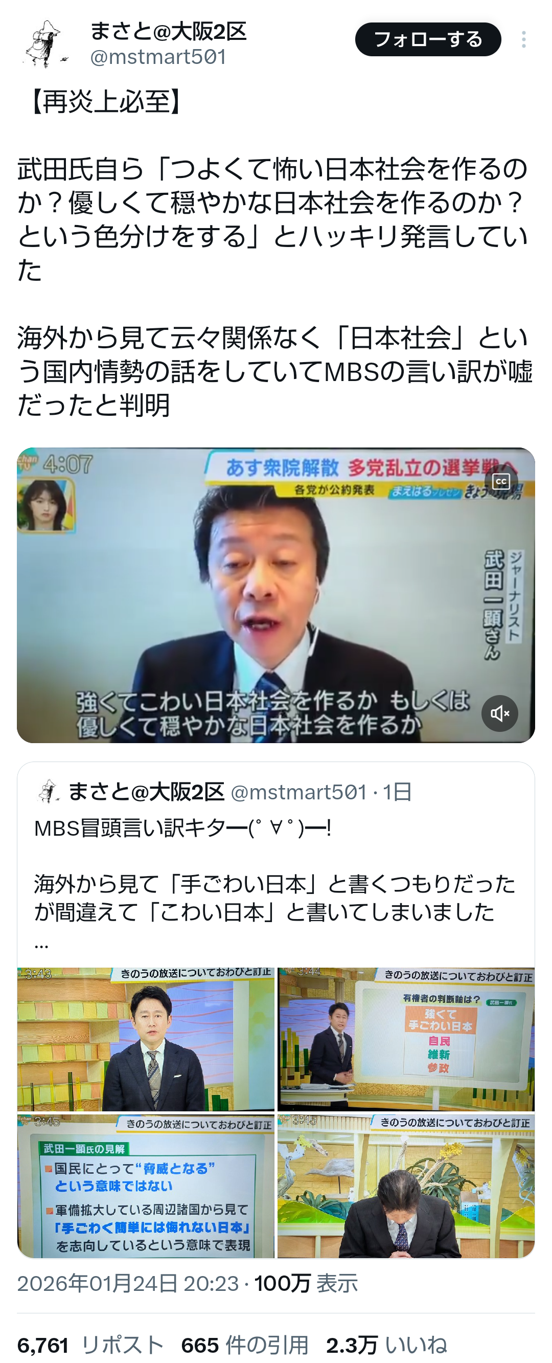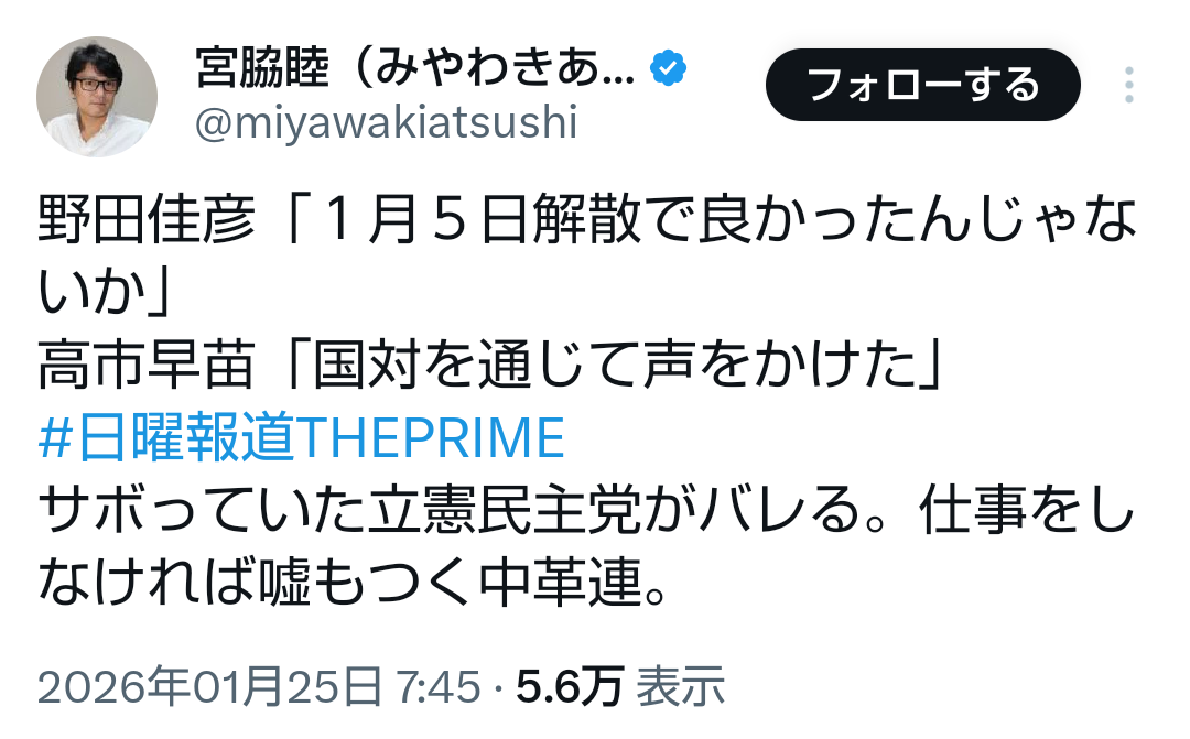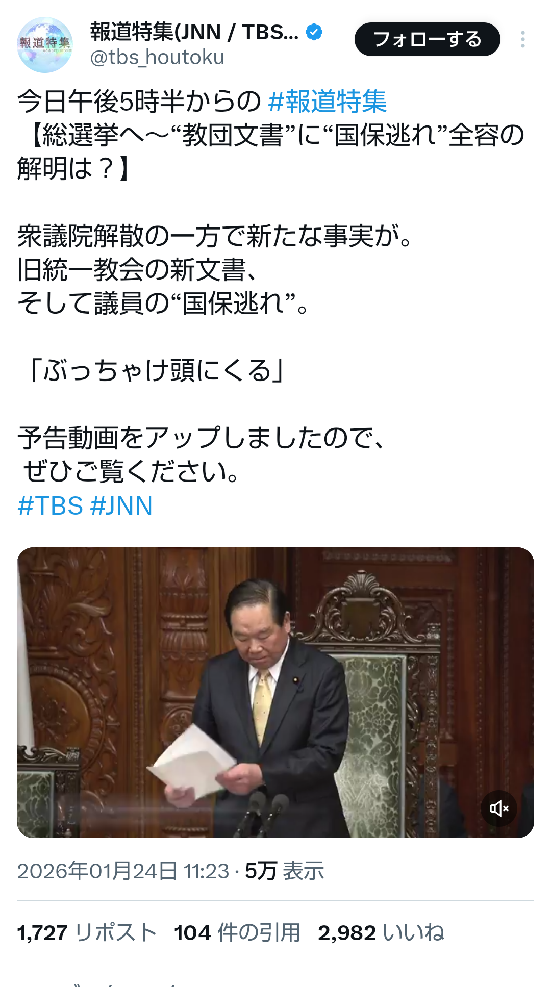 | … | 24無題Name名無し 26/01/22(木)11:30:51No.773222そうだねx3>こんばんは、きょう放送した特集@【「総理のクーデター」物価高や給食費より追及逃れ優先か なぜいま解散?高市総理が憧れる“安倍流”の影】が動画とテキストで公開されました。ぜひご覧ください。 |