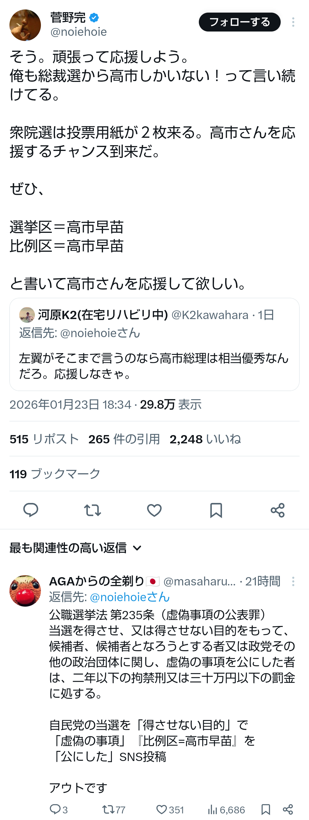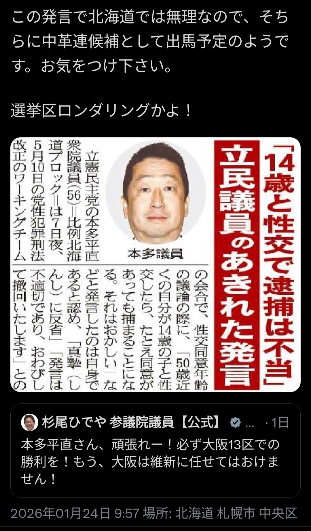 | … | 93無題Name名無し 26/01/22(木)13:05:41No.773291+過去に公明と創価攻撃してたヨシフを小選挙区で応援できないので小選挙区アウトみたいな噂が… |