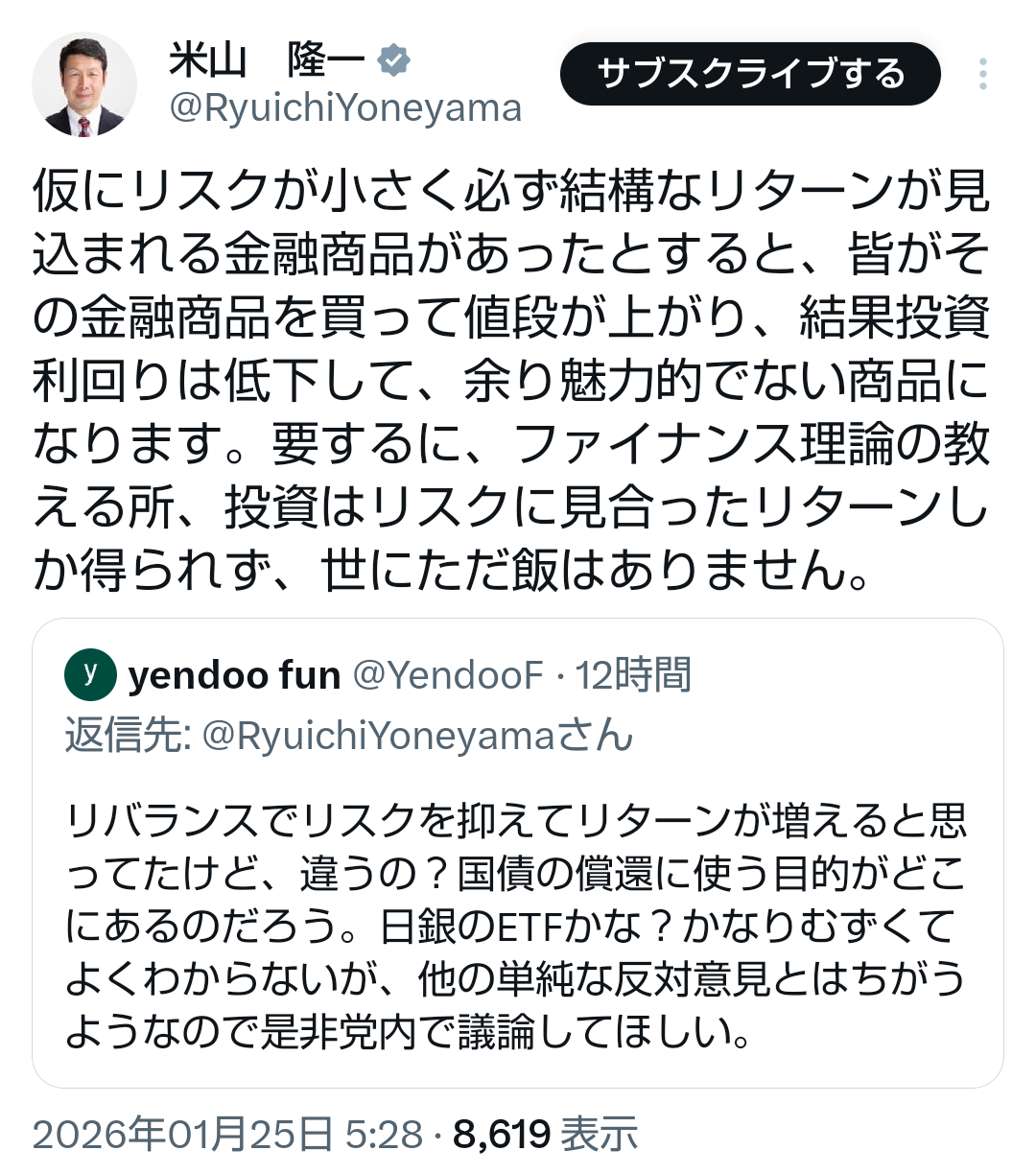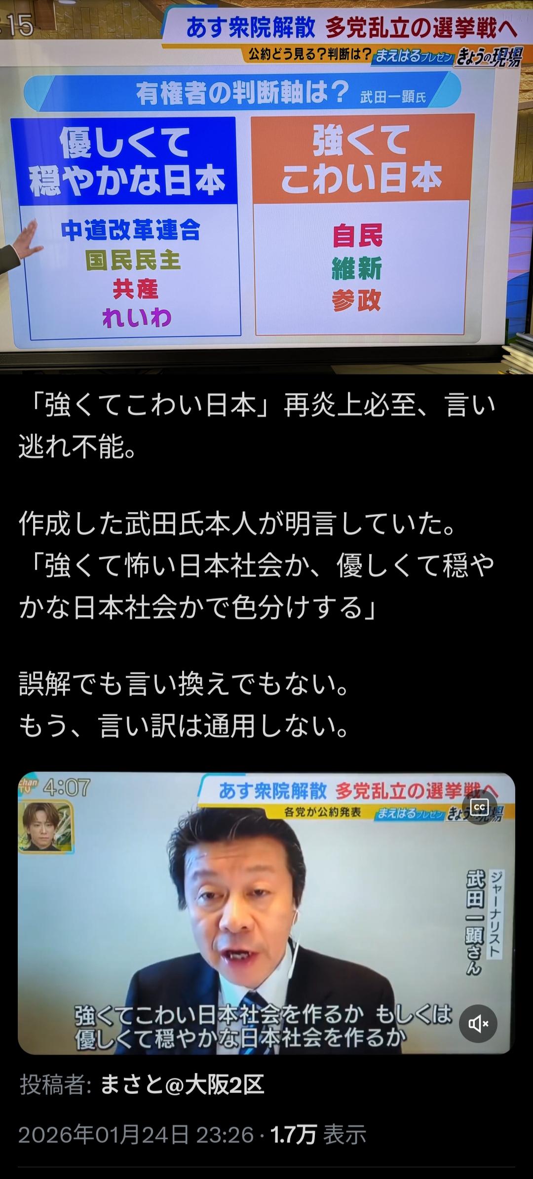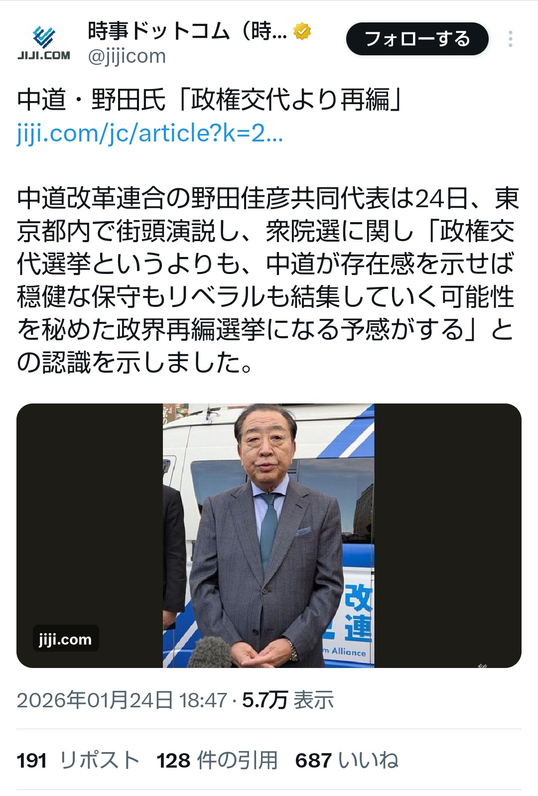 | … | 39無題Name名無し 26/01/22(木)11:45:14No.773237+>すっかり有頂天の安住は政権選択選挙とまで言い出してるんだよな |