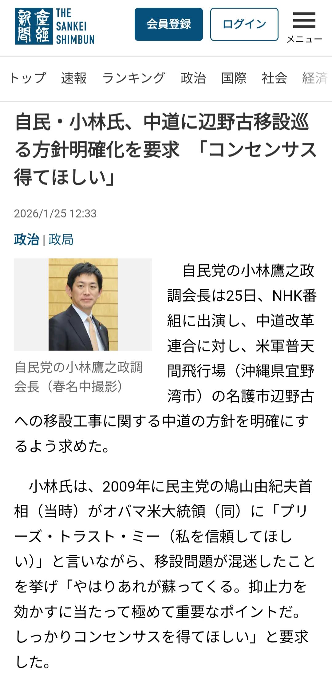 | … | 972無題Name名無し 26/01/25(日)21:09:14No.774280そうだねx3>名護市長選、渡具知武豊氏の3選確実…「辺野古」推進の自民が支援 |