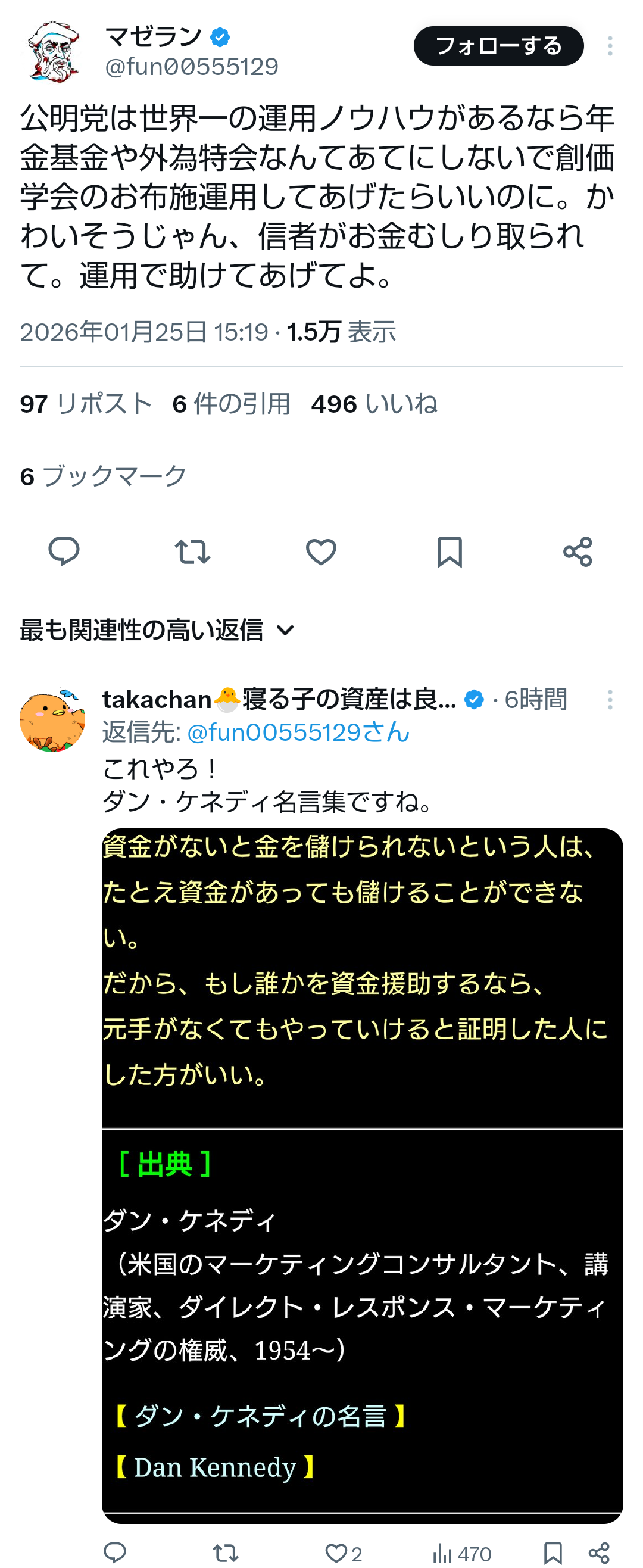 | … | 976無題Name名無し 26/01/25(日)22:18:31No.774287そうだねx2 1769347111251.png-(773287 B) >公明党は世界一の運用ノウハウがあるなら年金基金や外為特会なんてあてにしないで創価学会のお布施運用してあげたらいいのに。かわいそうじゃん、信者がお金むしり取られて。運用で助けてあげてよ。 |