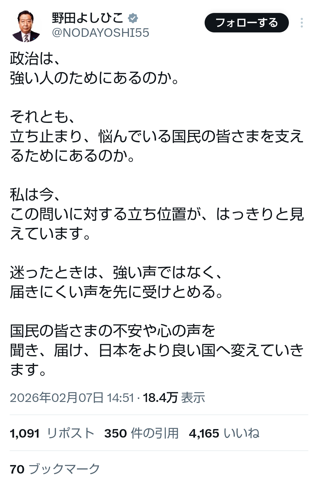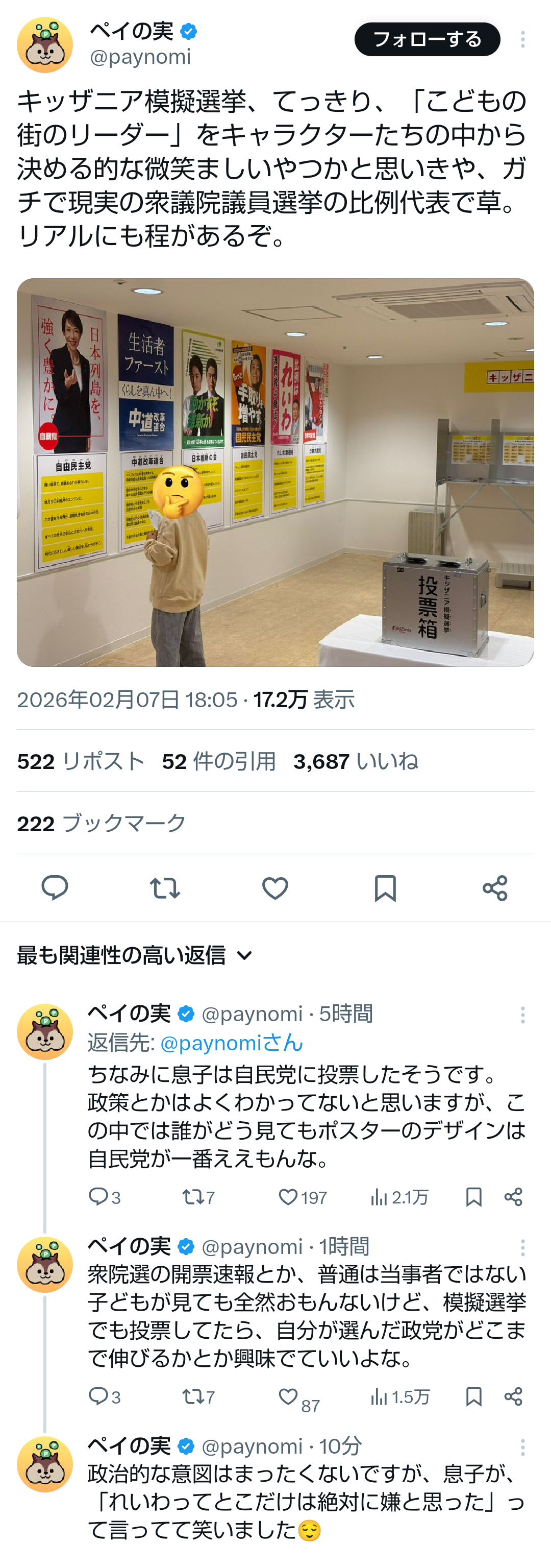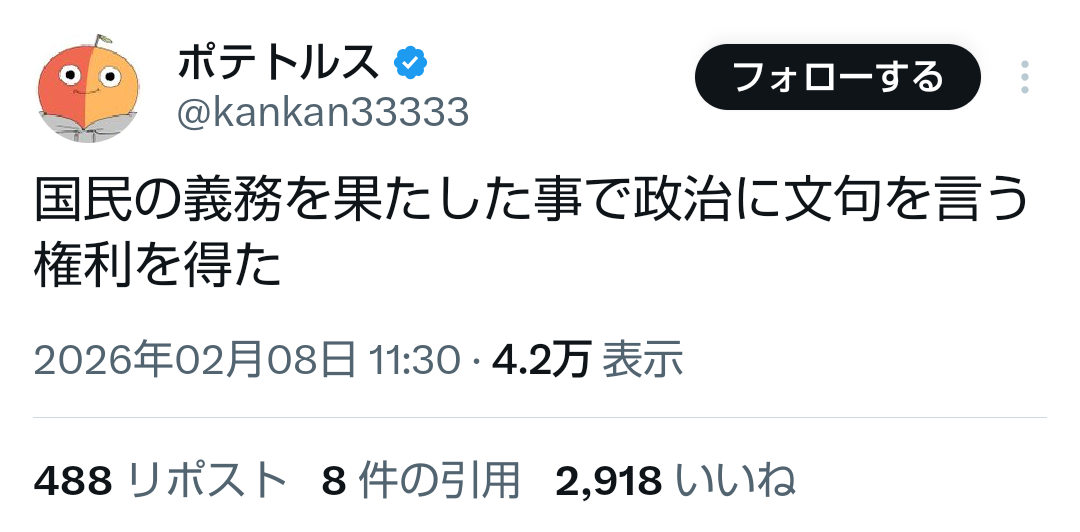 | … | 316無題Name名無し 26/02/08(日)18:06:18No.778453+投票は権利じゃないのか |