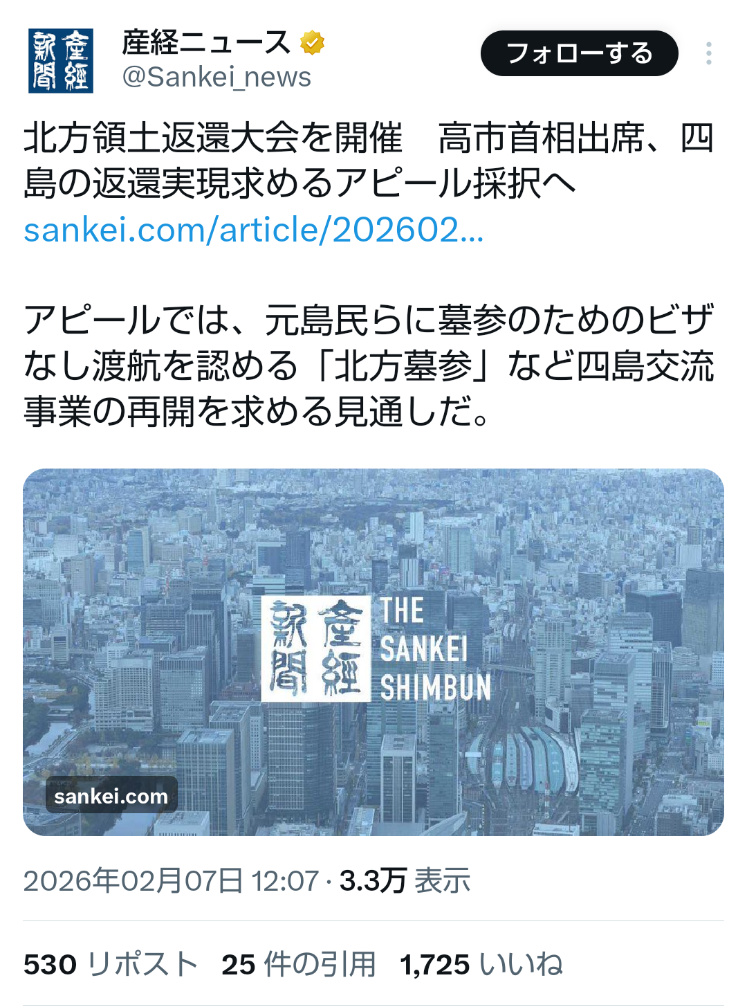 | … | 8無題Name名無し 26/02/07(土)17:18:35No.778080+ 1770452315733.png-(1020576 B) >北方領土返還大会を開催 高市首相出席、四島の返還実現求めるアピール採択へ |