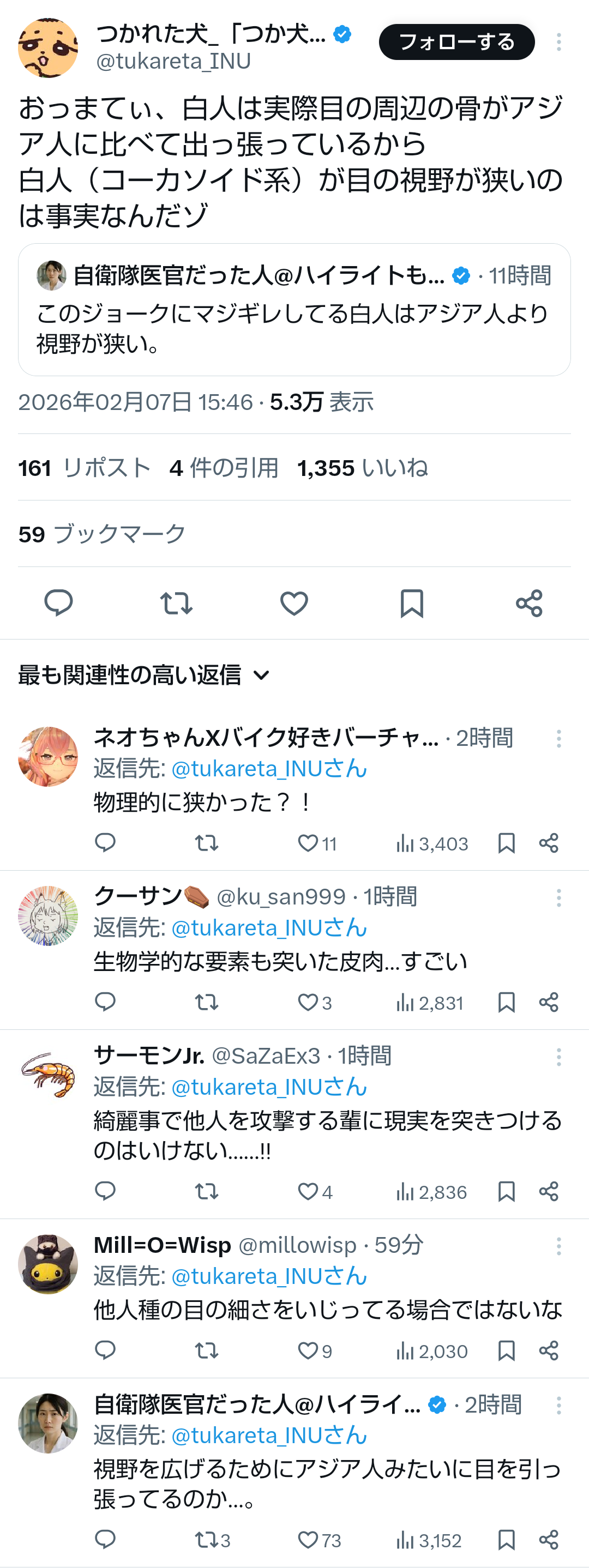 | … | 30無題Name名無し 26/02/07(土)18:40:31No.778114+ 1770457231988.png-(638086 B) >おっまてぃ、白人は実際目の周辺の骨がアジア人に比べて出っ張っているから |