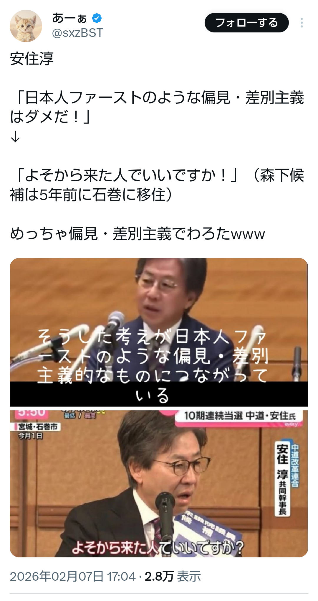 | … | 274無題Name名無し 26/02/08(日)15:29:15No.778400そうだねx1 1770532155824.png-(1270897 B) https://x.com/i/status/2020329572861112762 |