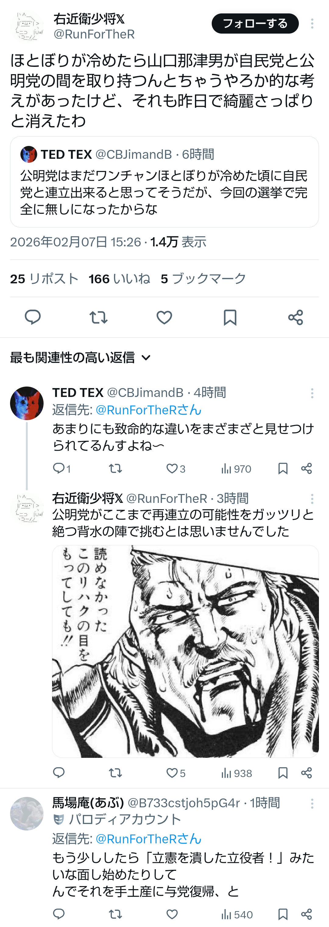 | … | 347無題Name名無し 26/02/08(日)19:03:20No.778484+>あれで自民党が公明党切れなくなったので最強の手だったと思ってるぞ |