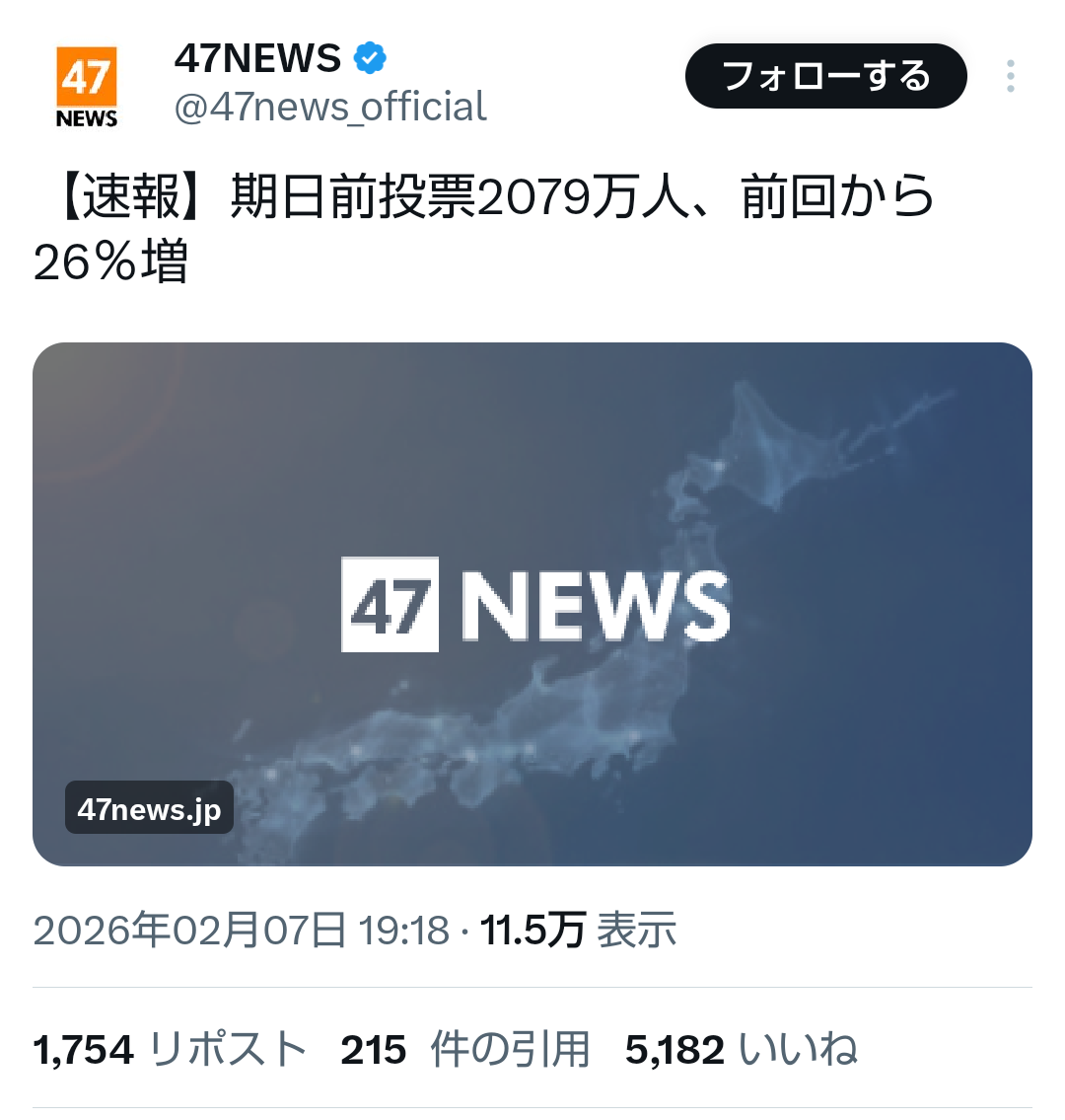 | … | 53無題Name名無し 26/02/07(土)20:48:31No.778144+ 1770464911719.png-(180604 B) >【速報】期日前投票2079万人、前回から26%増 |