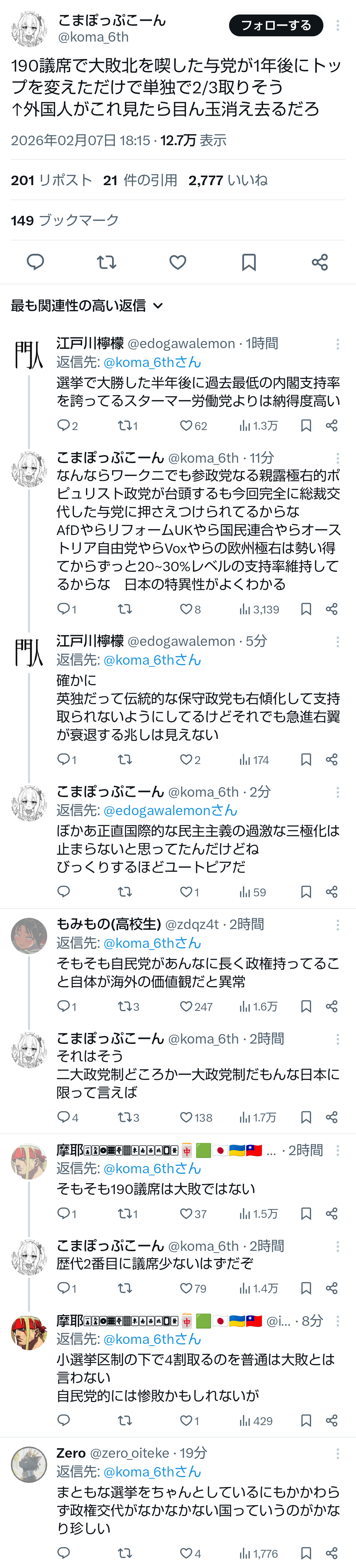 | … | 65無題Name名無し 26/02/07(土)21:26:24No.778159+>「海外だと大敗ではない」とか「民主的に選挙してるにも関わらず政権交代がほぼ無い国」とかそういえば日本は異常だなと思った |