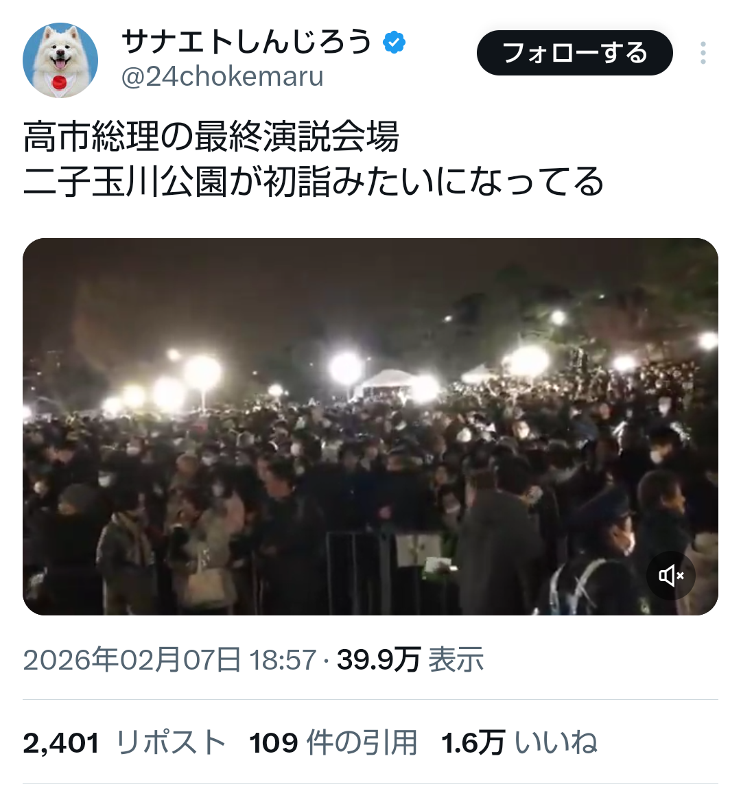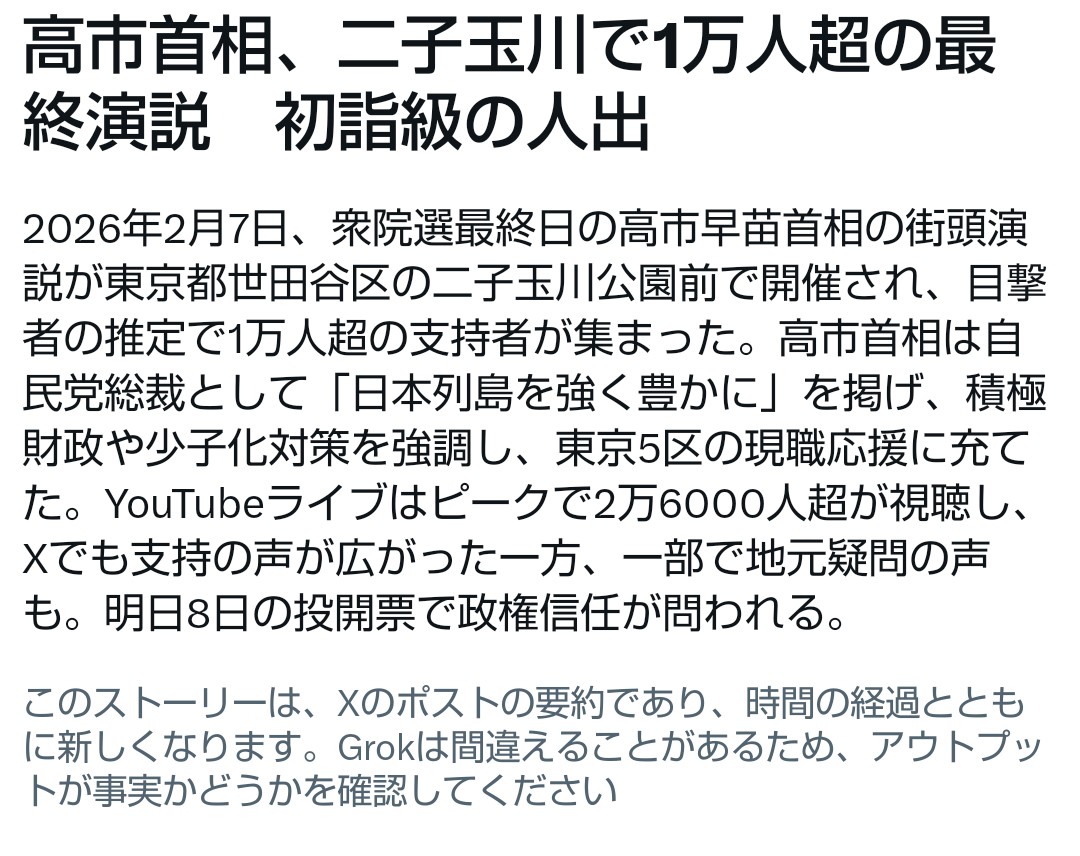 | … | 309無題Name名無し 26/02/08(日)17:56:44No.778446+当日の投票率が5%落ちるとプラマイゼロになるのでみんな行っててほしいなって |