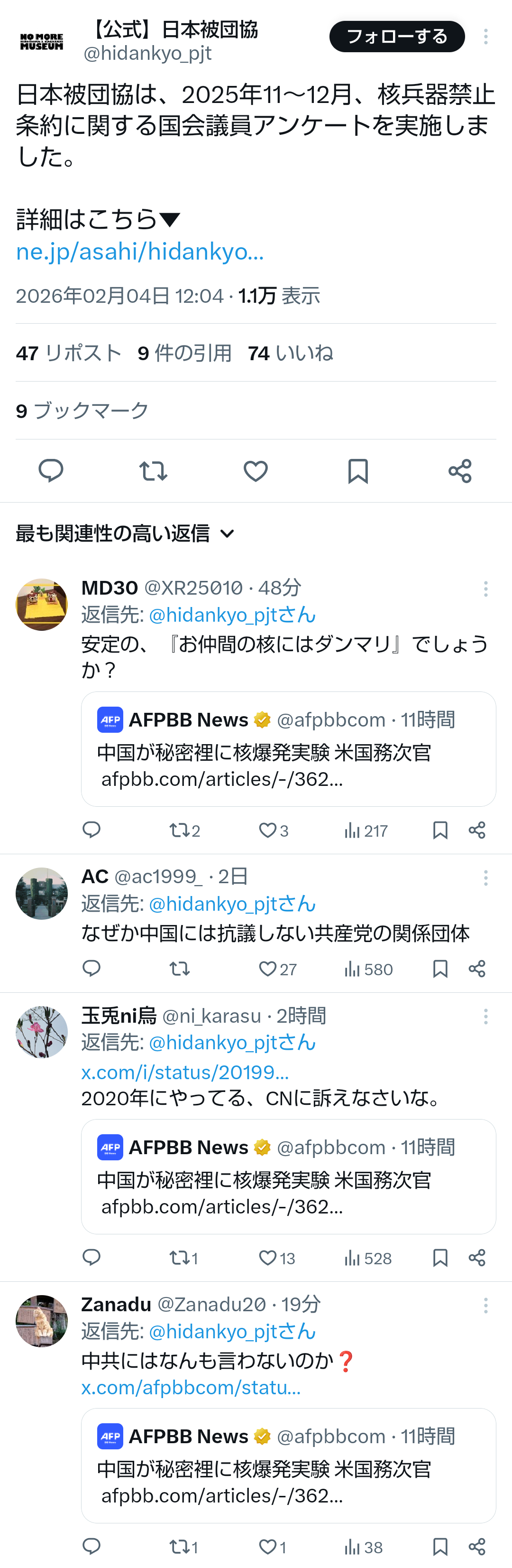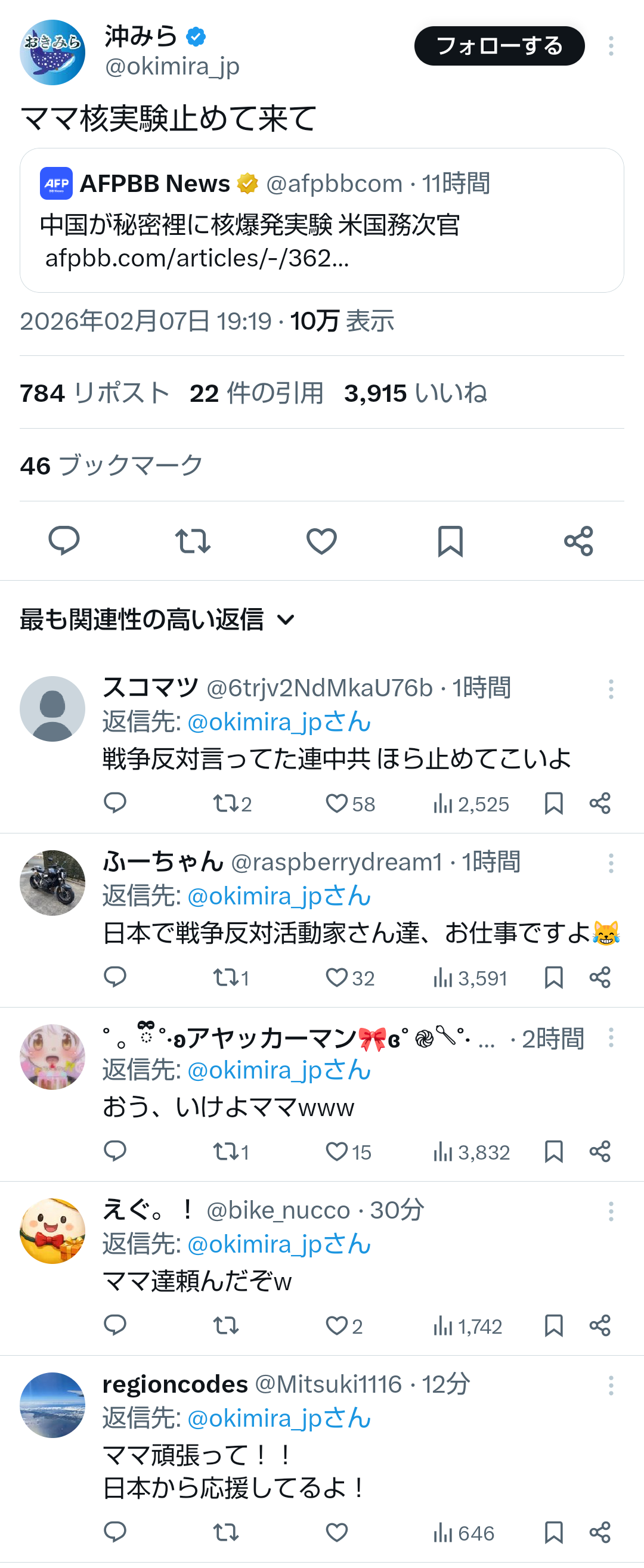 | … | 74無題Name名無し 26/02/07(土)22:31:46No.778181そうだねx4 1770471106704.png-(526880 B) >中国が秘密裡に核爆発実験 米国務次官 |