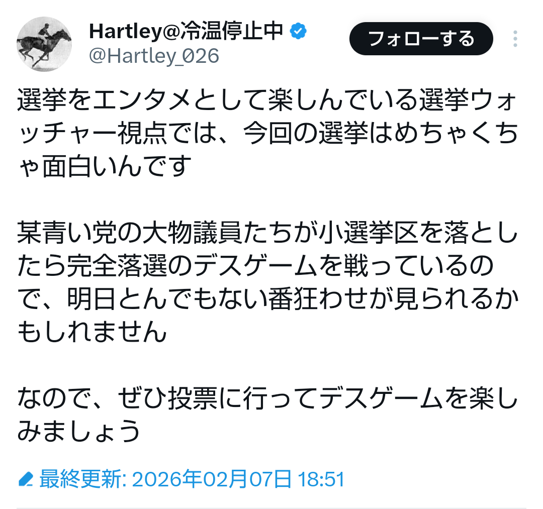 | … | 93無題Name名無し 26/02/07(土)23:33:51No.778200+ 1770474831882.png-(232950 B) >選挙をエンタメとして楽しんでいる選挙ウォッチャー視点では、今回の選挙はめちゃくちゃ面白いんです |