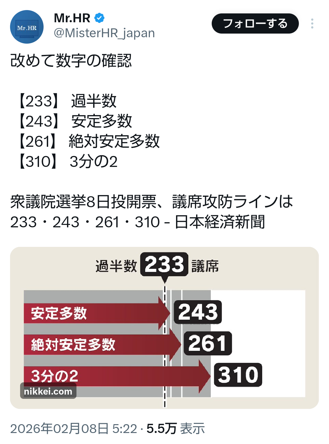 | … | 12無題Name名無し 26/02/07(土)17:45:20No.778096+>>一方その頃SNSでは自民と維新で計334議席だと縁起が悪いねという |