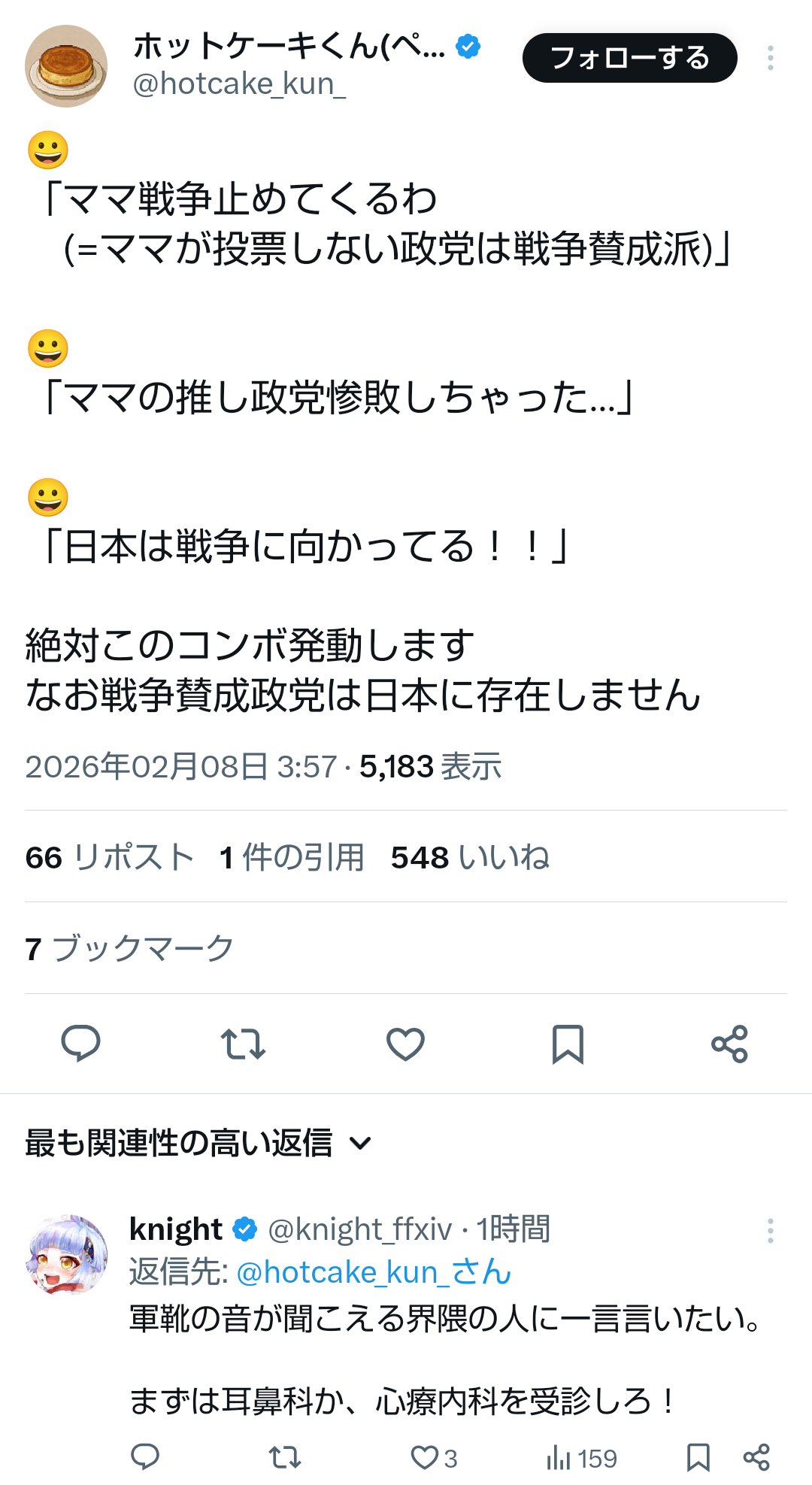| … | 278無題Name名無し 26/02/08(日)15:35:09No.778404+戦争が向こうから向かってきてるんだよ |