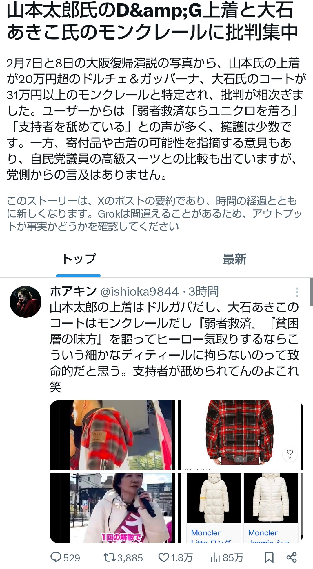 | … | 291無題Name名無し 26/02/08(日)16:33:15No.778421+まあ庶民派政治家気取るれいわ連中なら服装で叩かれても屁の河童でしょう・・・ |