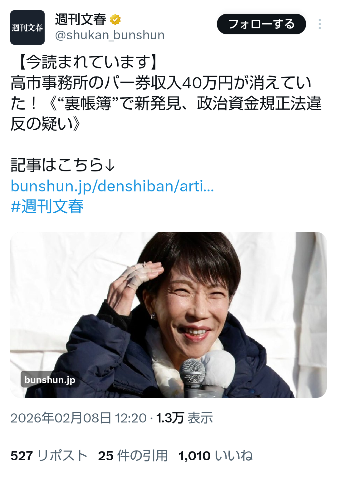 | … | 281無題Name名無し 26/02/08(日)16:07:08No.778407そうだねx1 1770534428621.png-(610231 B) >高市事務所のパー券収入40万円が消えていた!《“裏帳簿”で新発見、政治資金規正法違反の疑い》 |