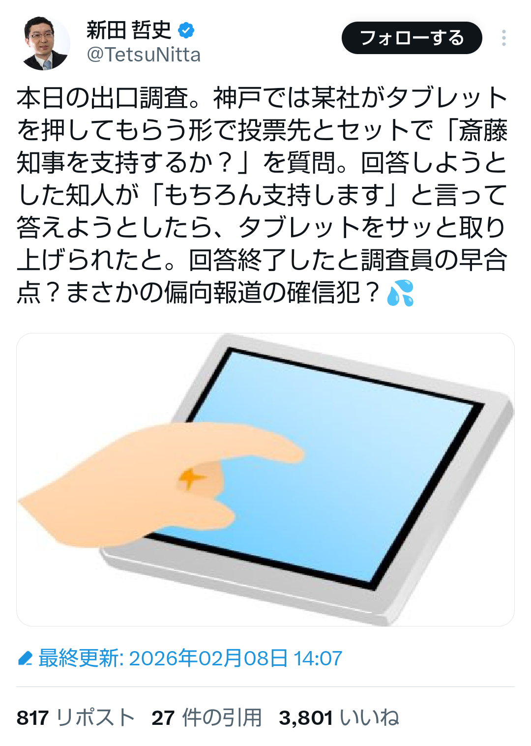 | … | 327無題Name名無し 26/02/08(日)18:31:33No.778464+ 1770543093457.png-(317319 B) >本日の出口調査。神戸では某社がタブレットを押してもらう形で投票先とセットで「斎藤知事を支持するか?」を質問。回答しようとした知人が「もちろん支持します」と言って答えようとしたら、タブレットをサッと取り上げられたと。回答終了したと調査員の早合点?まさかの偏向報道の確信犯? |