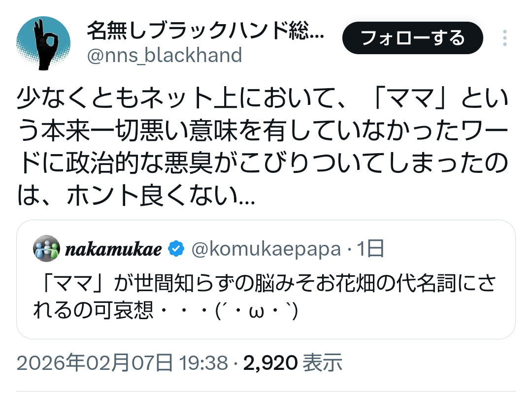 | … | 19無題Name名無し 26/02/07(土)18:09:08No.778103そうだねx3 1770455348208.png-(533922 B) >「ママ戦争止めてくるわ」が話題のようです。 |