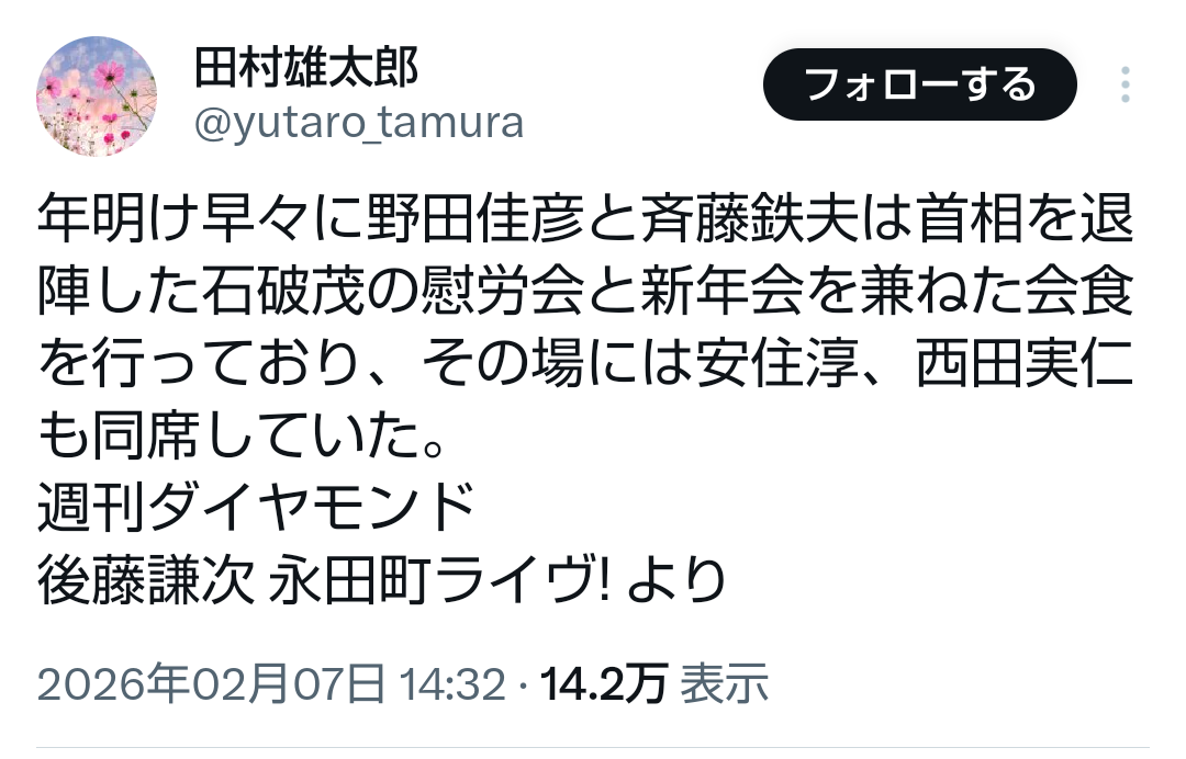 | … | 336無題Name名無し 26/02/08(日)18:58:12No.778473+>>年明け早々に野田佳彦と斉藤鉄夫は首相を退陣した石破茂の慰労会と新年会を兼ねた会食を行っており、その場には安住淳、西田実仁も同席していた。 |