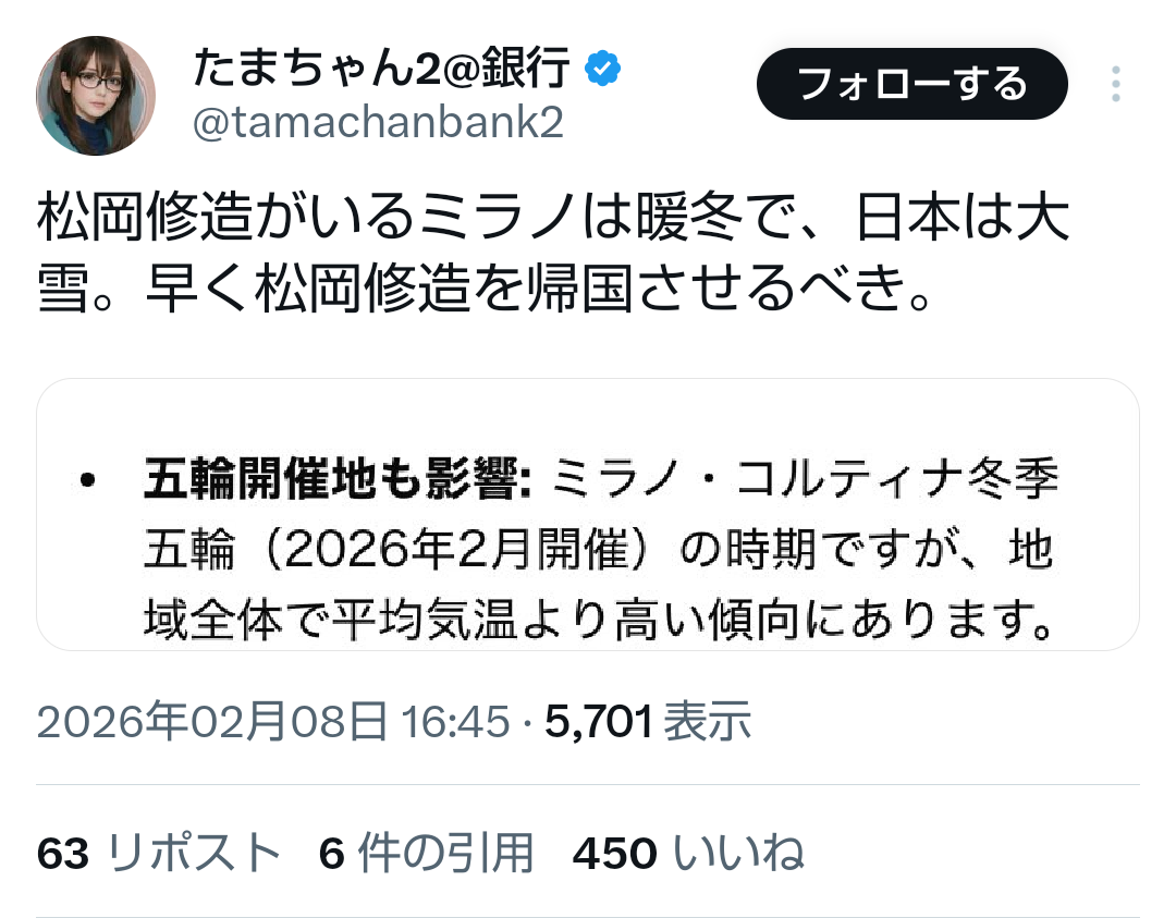 | … | 47無題Name名無し 26/02/07(土)19:55:15No.778137そうだねx4>https://x.com/i/status/2020047831915196678 |