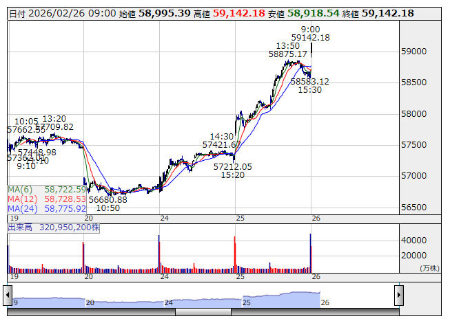 その後取引時間中としては初めて5万9000円台に乗せ、上げ幅は700円を超えた。