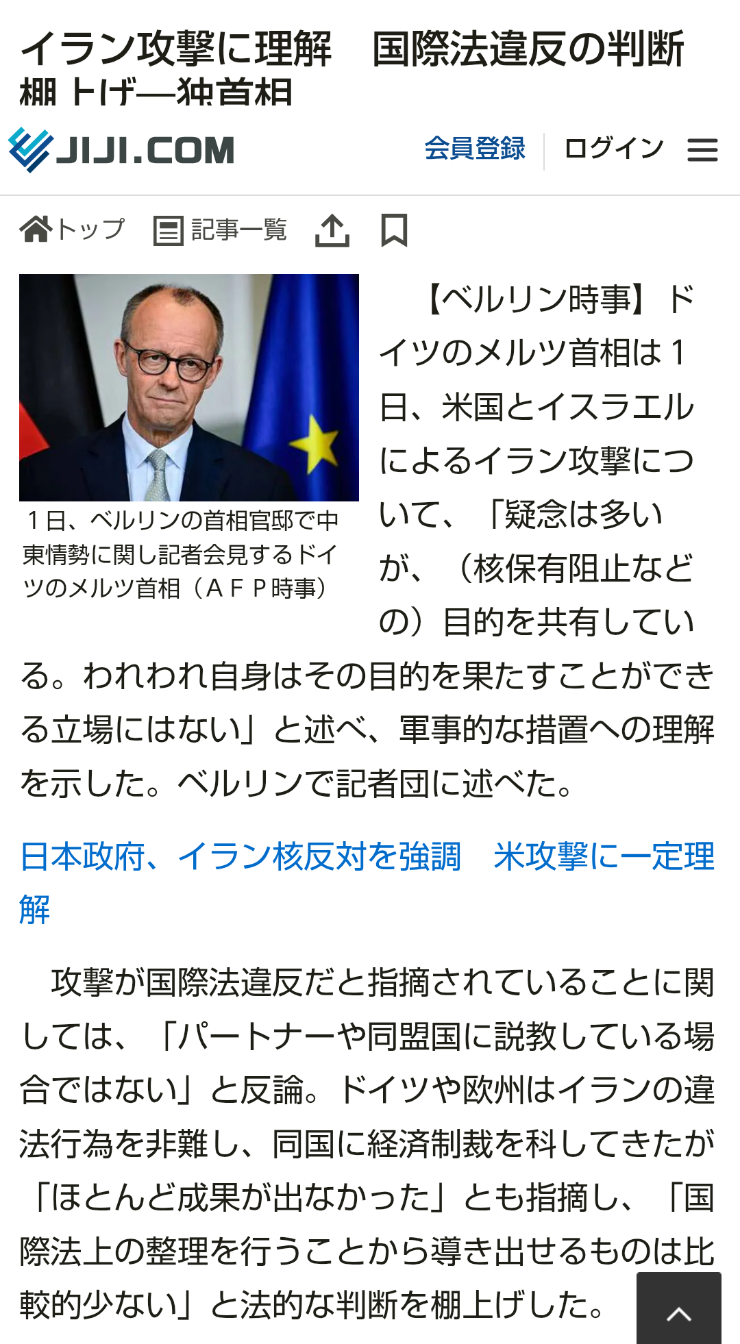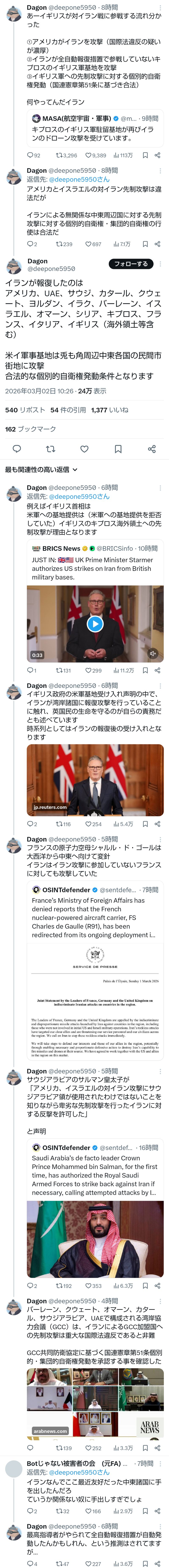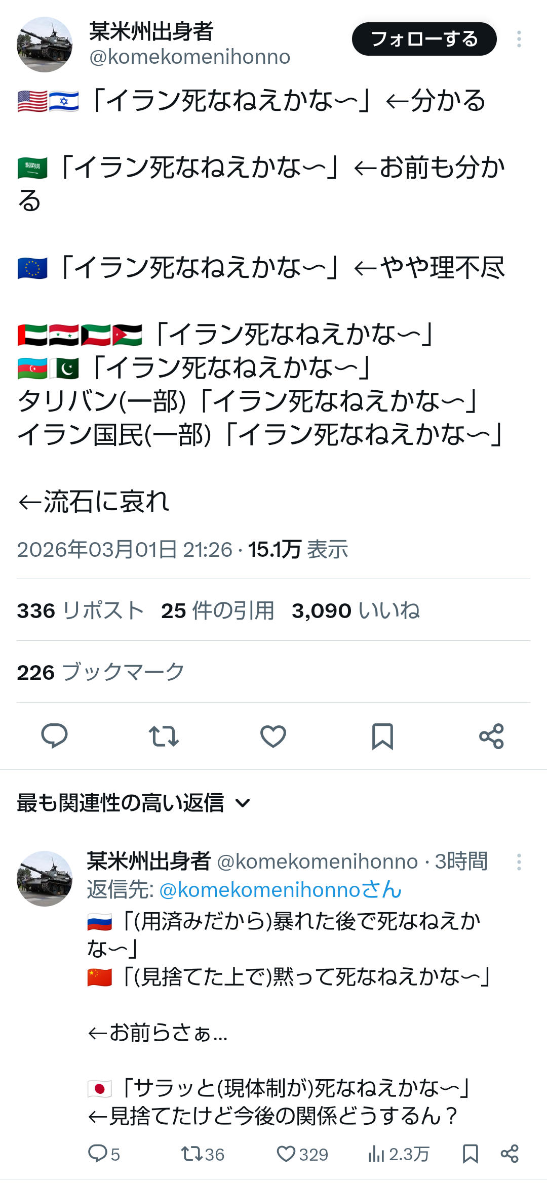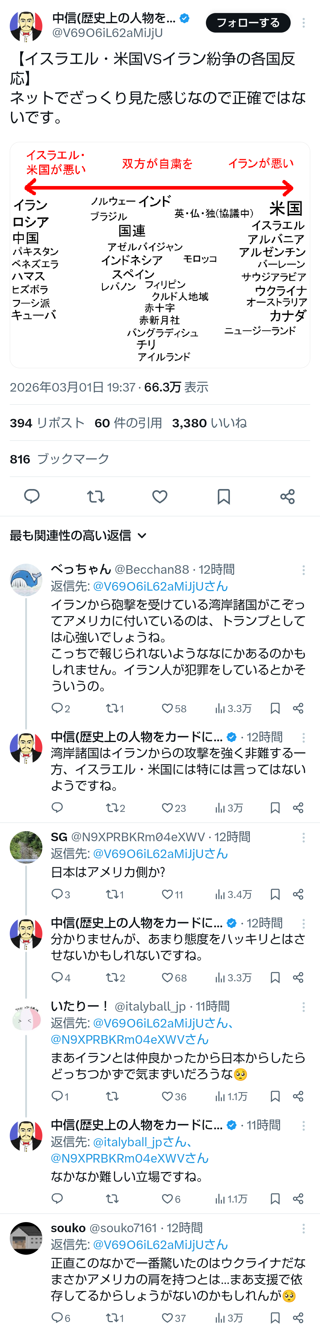 | … | 20無題Name名無し 26/03/01(日)13:10:59No.784171+ 1772338259680.jpg-(50323 B) >今回のイランへの攻撃、イランからの反撃についての各国の反応 |