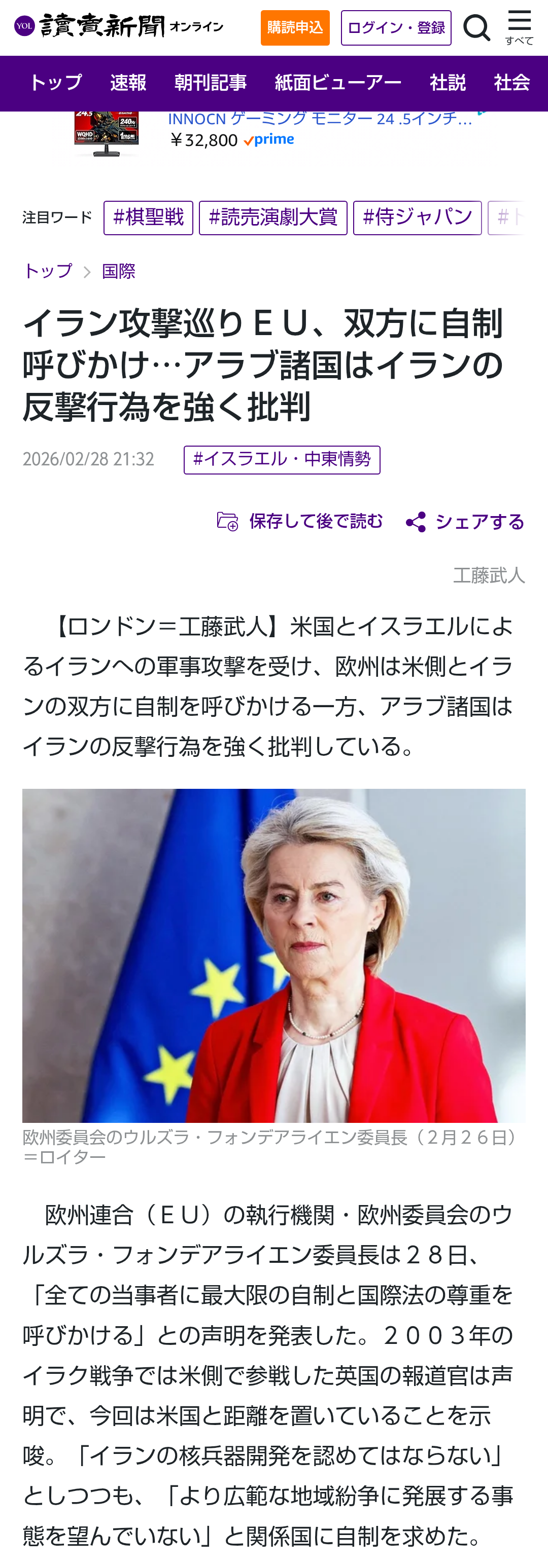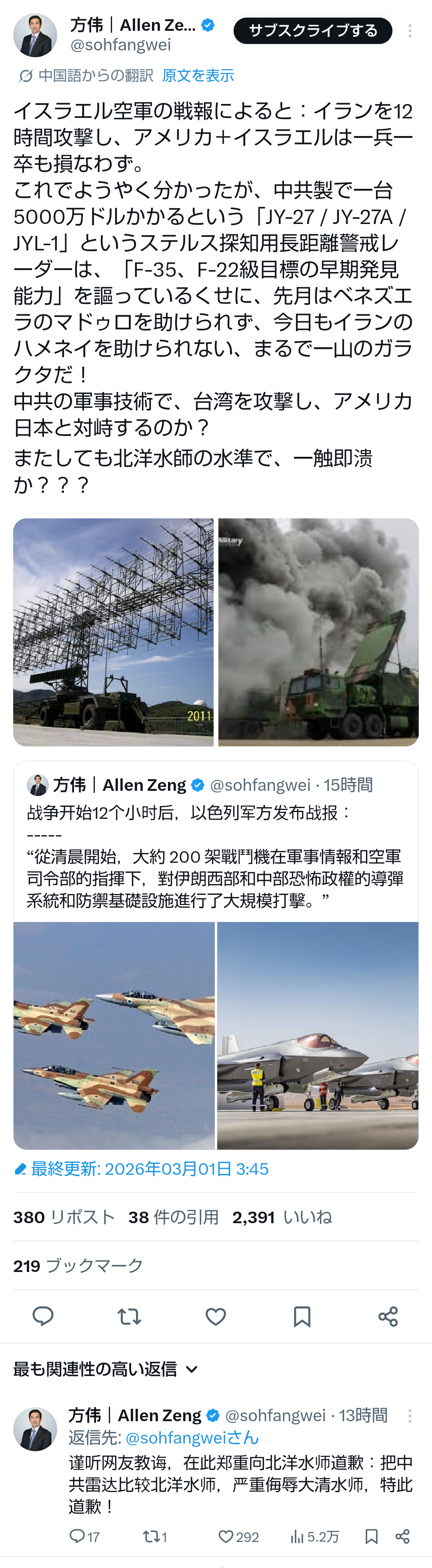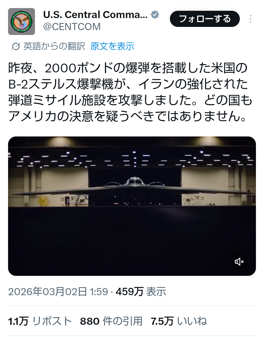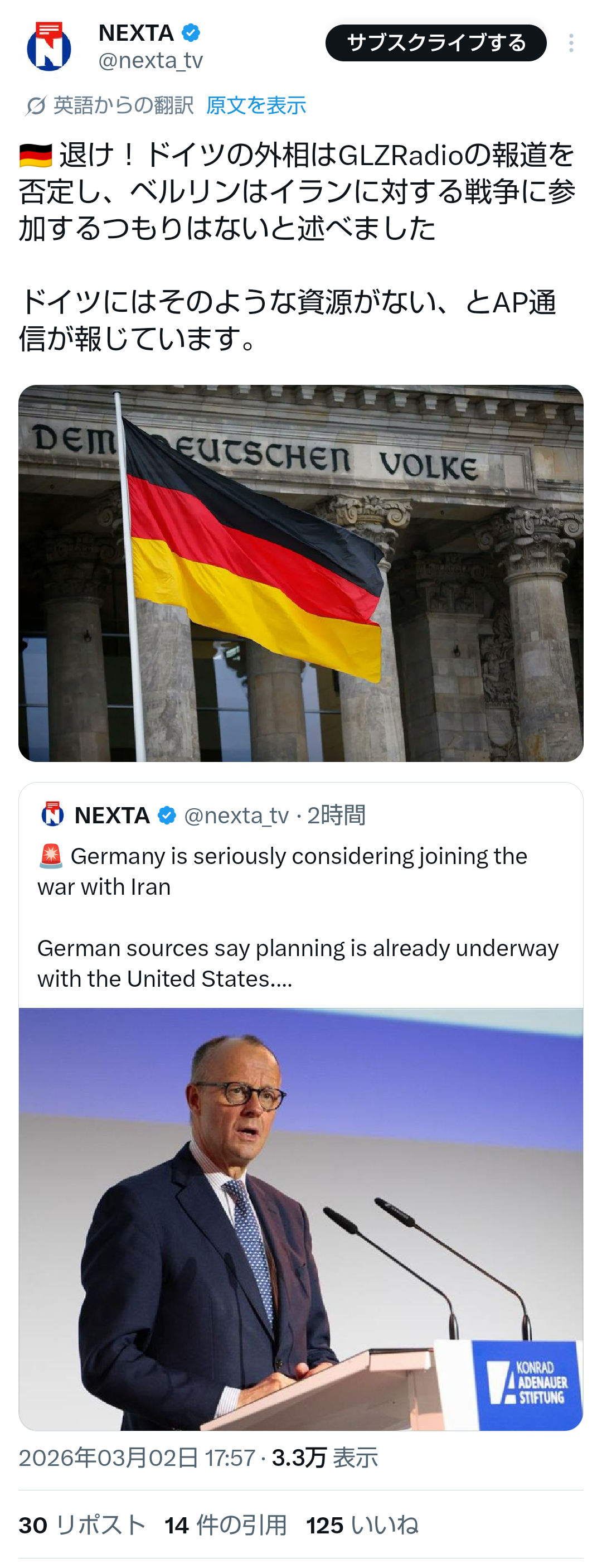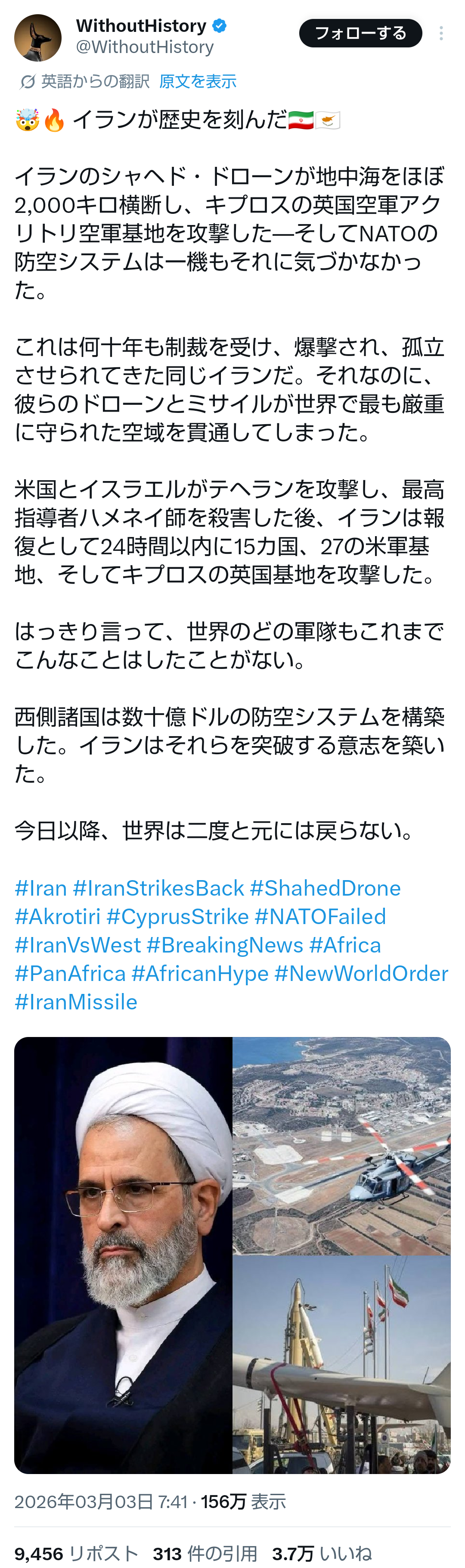 | … | 20無題Name名無し 26/03/01(日)13:10:59No.784171+ 1772338259680.jpg-(50323 B) >今回のイランへの攻撃、イランからの反撃についての各国の反応 |