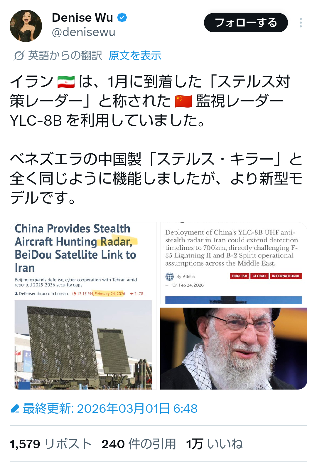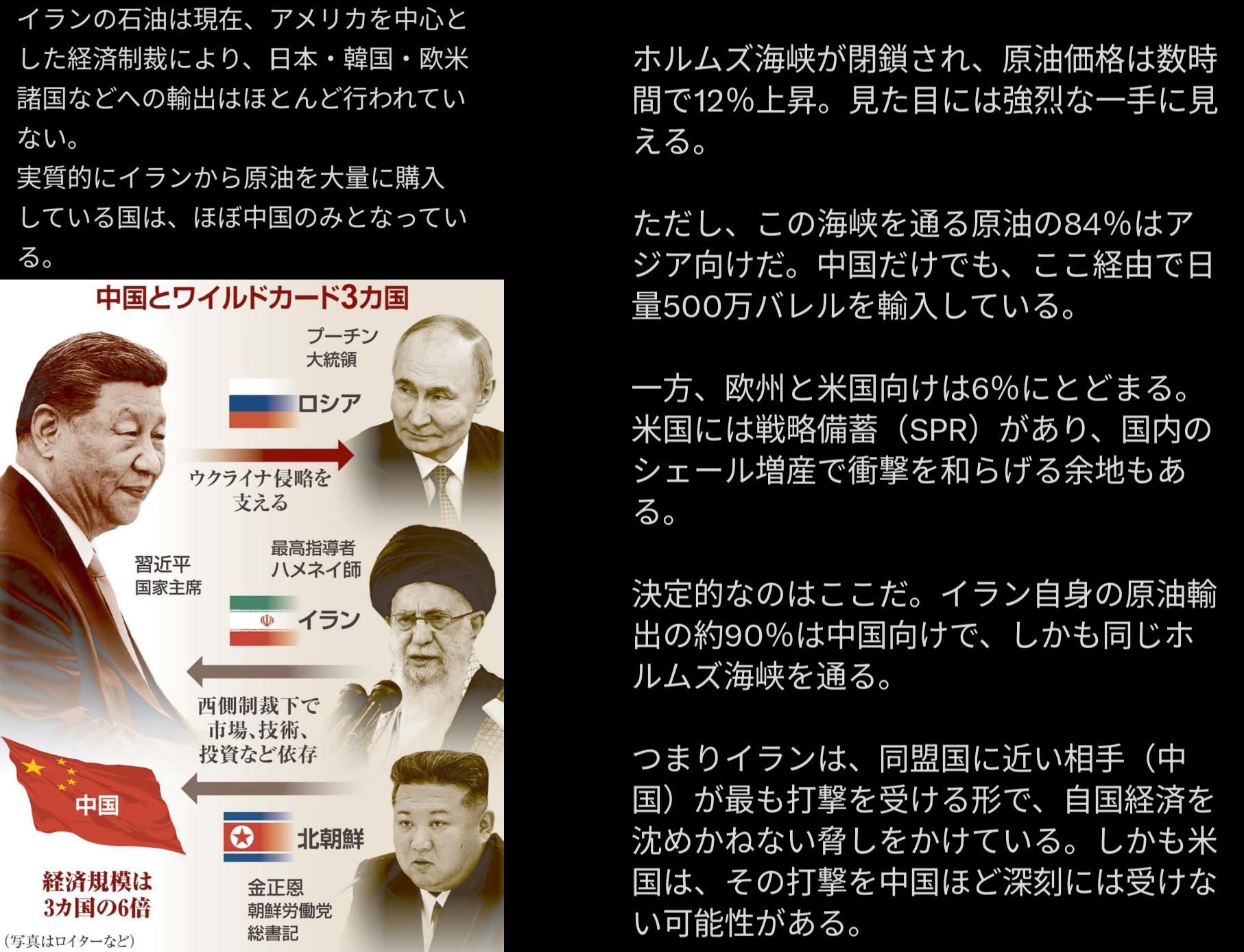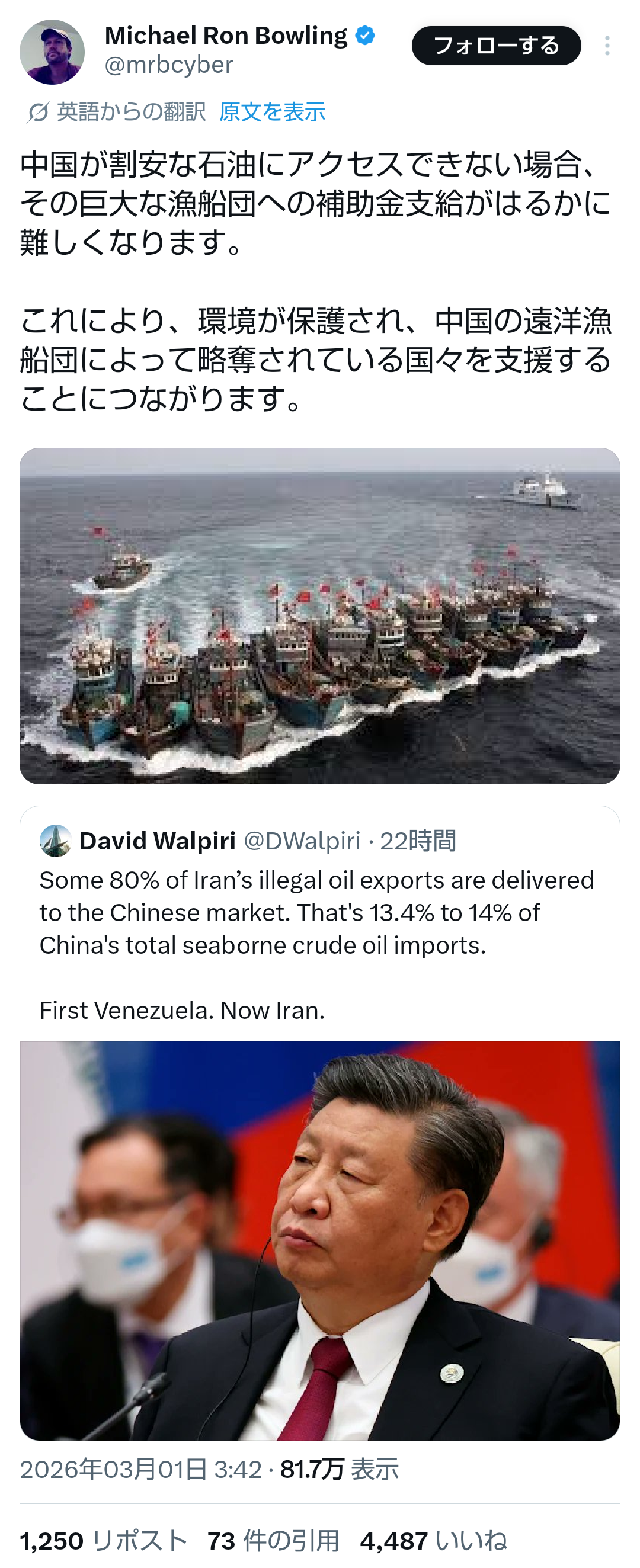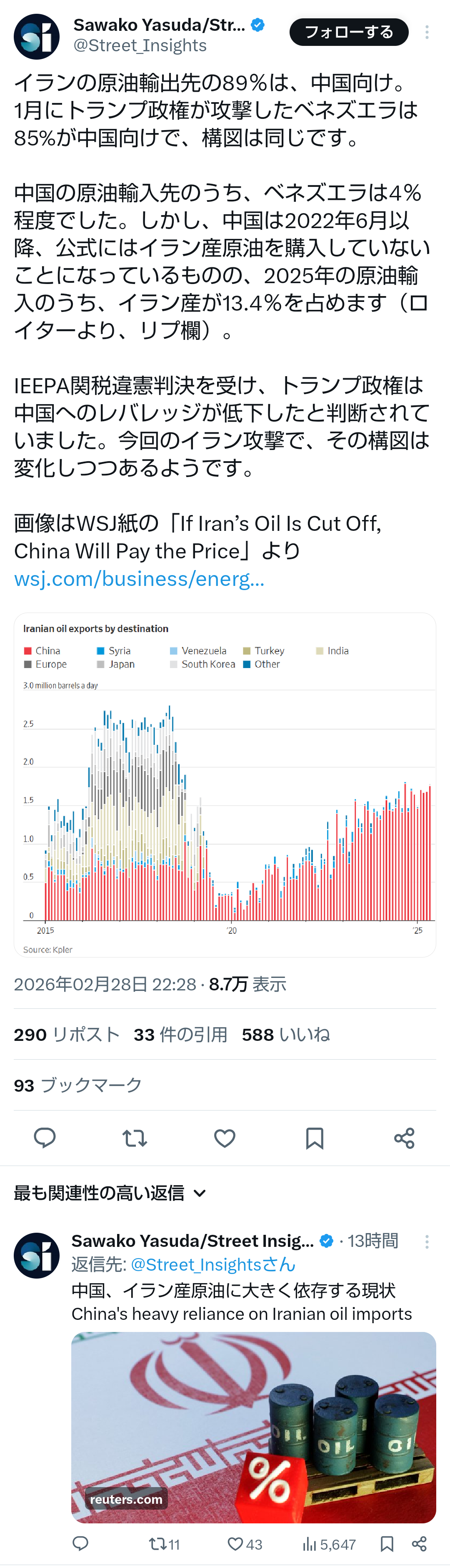 | … | 28無題Name名無し 26/03/01(日)13:28:57No.784179+>>イランの原油輸出先の89%は、中国向け。1月にトランプ政権が攻撃したベネズエラは85%が中国向けで、構図は同じです。 |