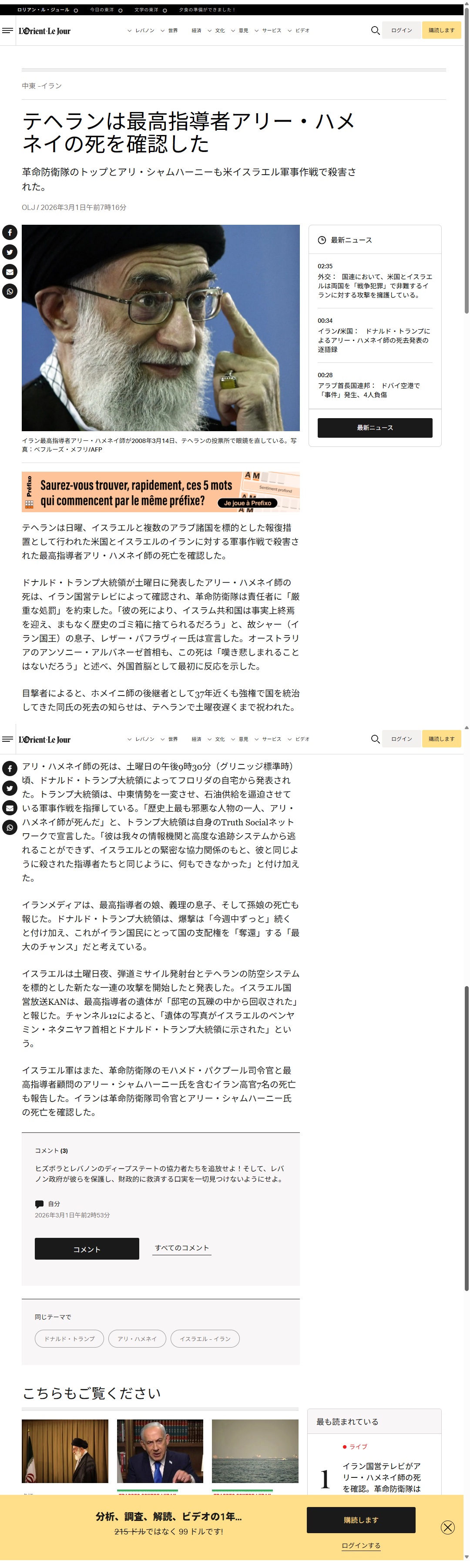 | … | 975無題Name名無し 26/03/05(木)13:07:28No.785302+>ハメネイ師殺害に諜報網を駆使、イラン国内の監視カメラに数年前から「侵入」…決行直前には通信基地局に妨害工作 |