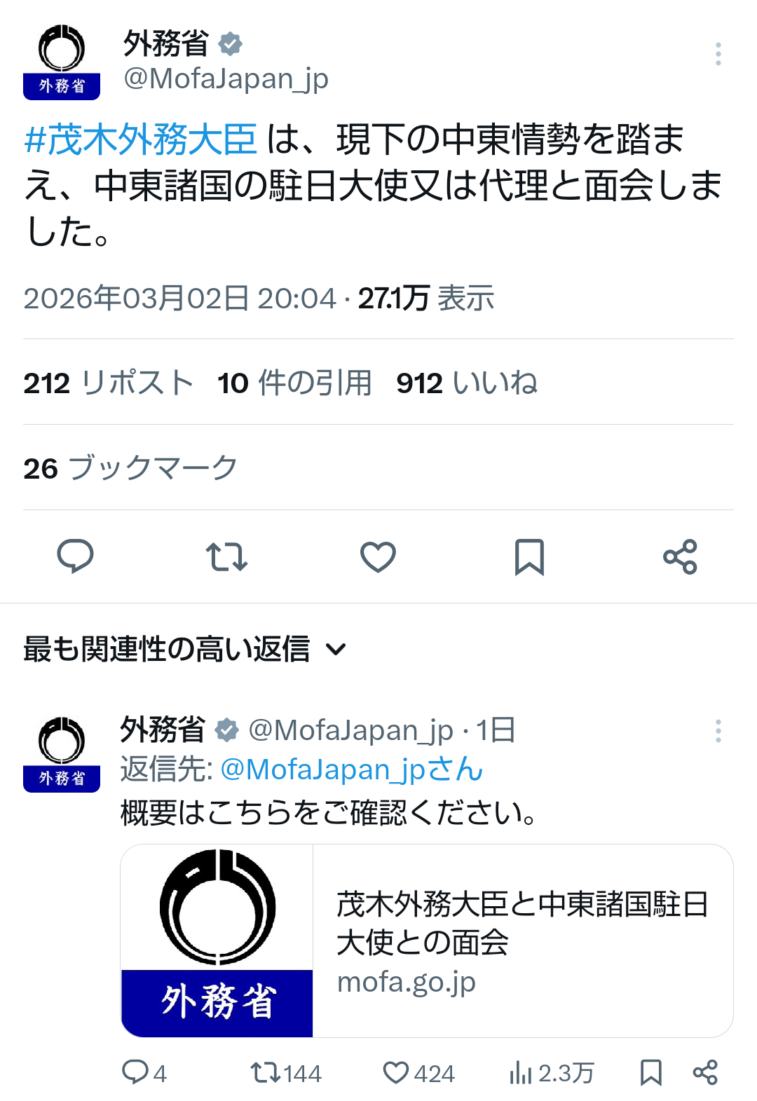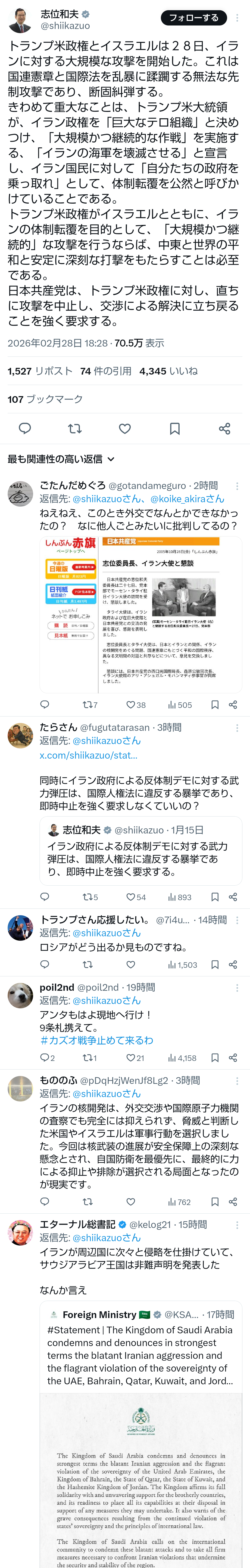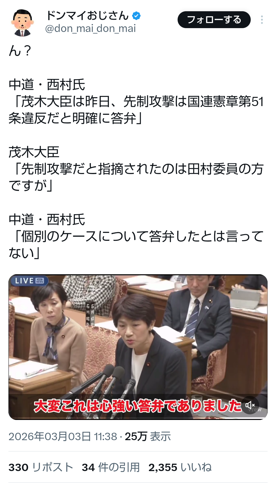 | … | 11無題Name名無し 26/03/01(日)12:57:50No.784162そうだねx4>トランプが先制した!アメリカ非難しろ!って野党が口揃えて言ってるけど |