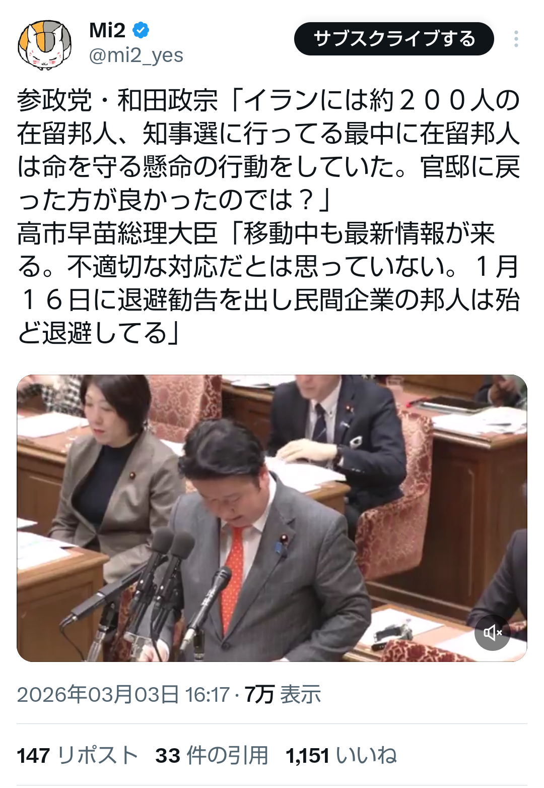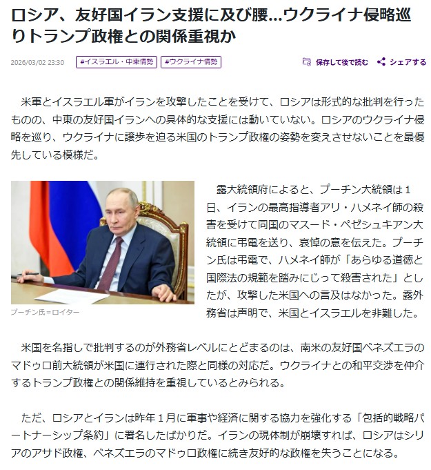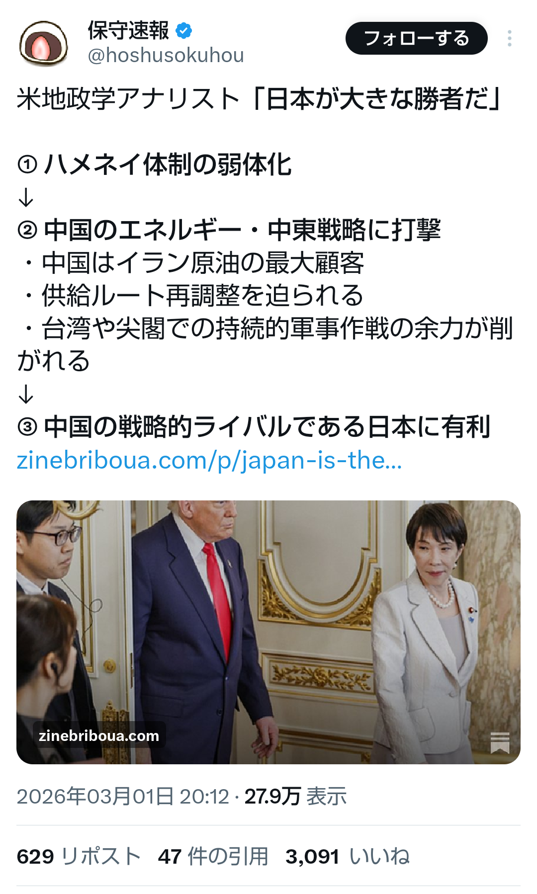 | … | 11無題Name名無し 26/03/01(日)12:57:50No.784162そうだねx4>トランプが先制した!アメリカ非難しろ!って野党が口揃えて言ってるけど |