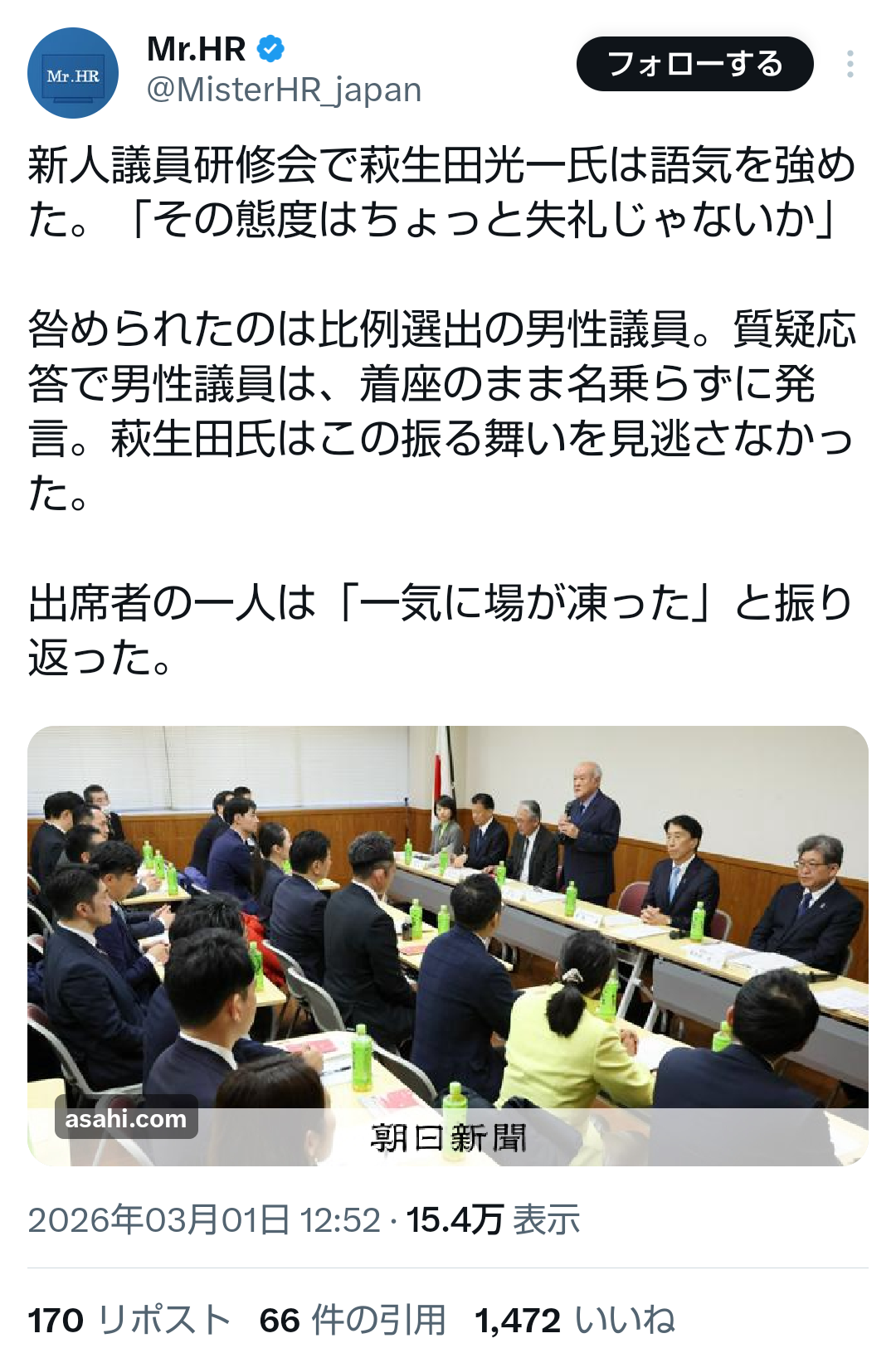 | … | 69無題Name名無し 26/03/01(日)14:47:03No.784227そうだねx2>>>新人議員研修会で萩生田光一氏は語気を強めた。「その態度はちょっと失礼じゃないか」 |