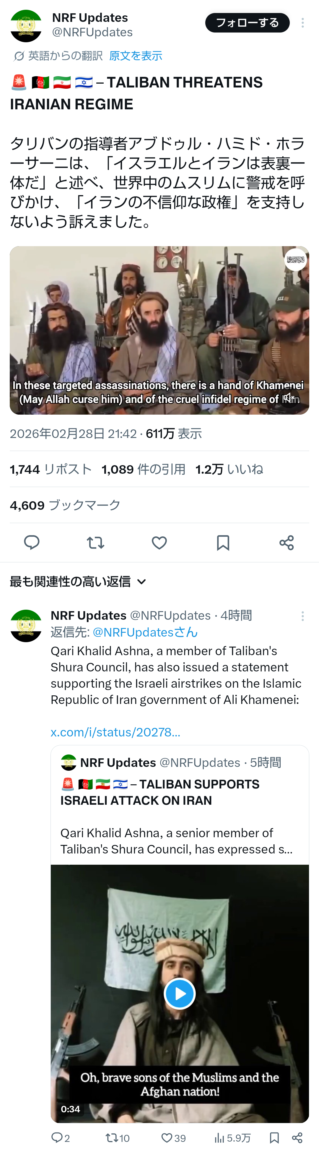 | … | 58無題Name名無し 26/03/01(日)14:27:51No.784216そうだねx1>>タリバンまでアメリカ支持してるのが今回の不思議な所 |