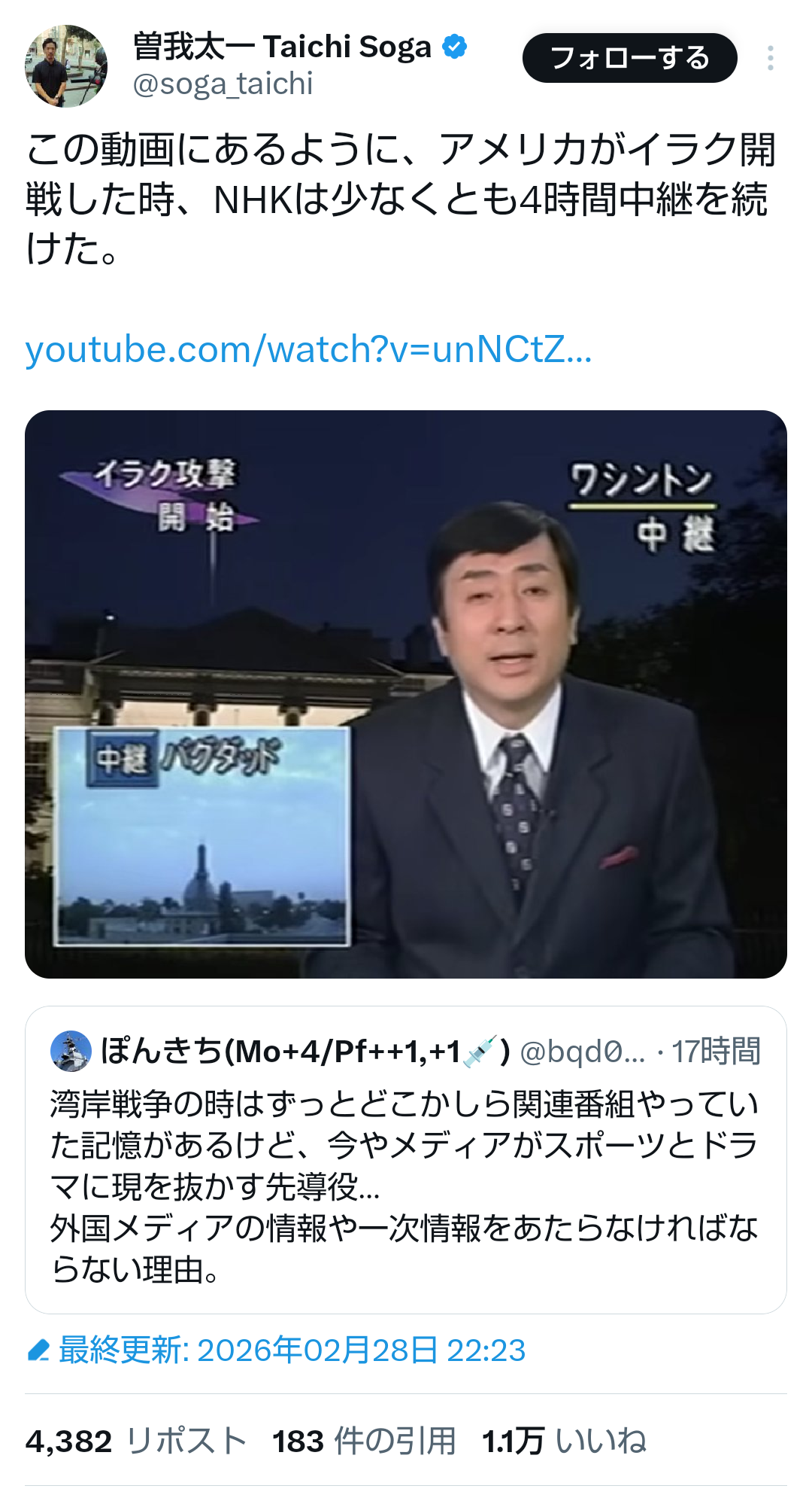 | … | 86無題Name名無し 26/03/01(日)15:35:54No.784245そうだねx3 1772346954293.png-(677226 B) >この動画にあるように、アメリカがイラク開戦した時、NHKは少なくとも4時間中継を続けた。 |