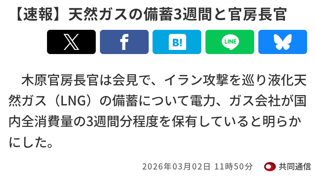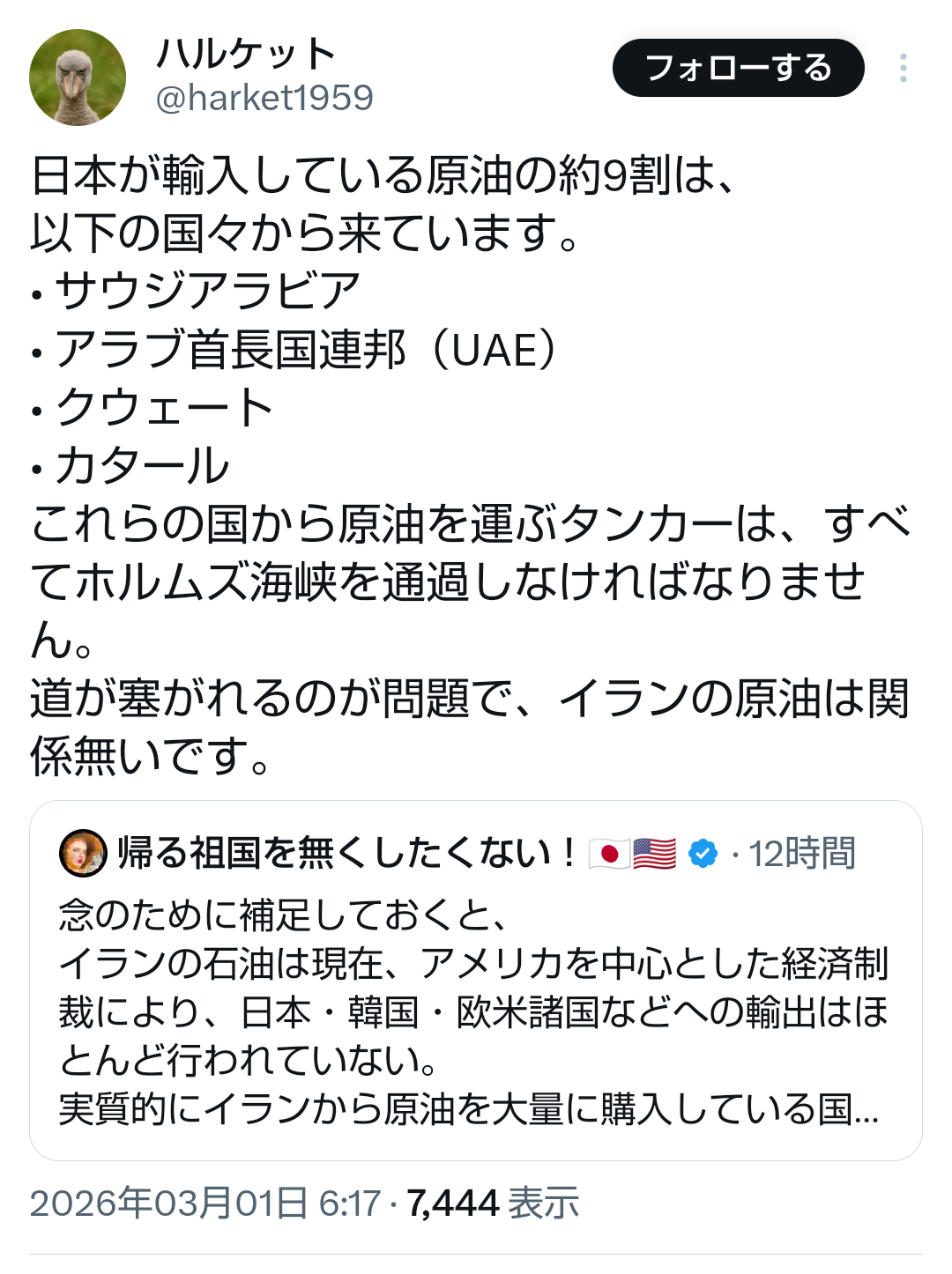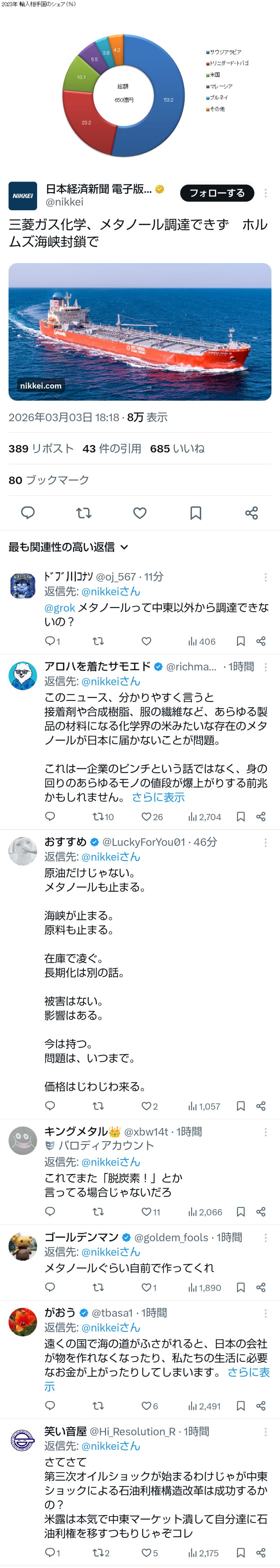 | … | 50無題Name名無し 26/03/01(日)14:09:44No.784207+原油輸入量のざっくり1/7が途切れたと考えるとつまり1週間の内7日フルに使えてたのが6日になるってことだから |