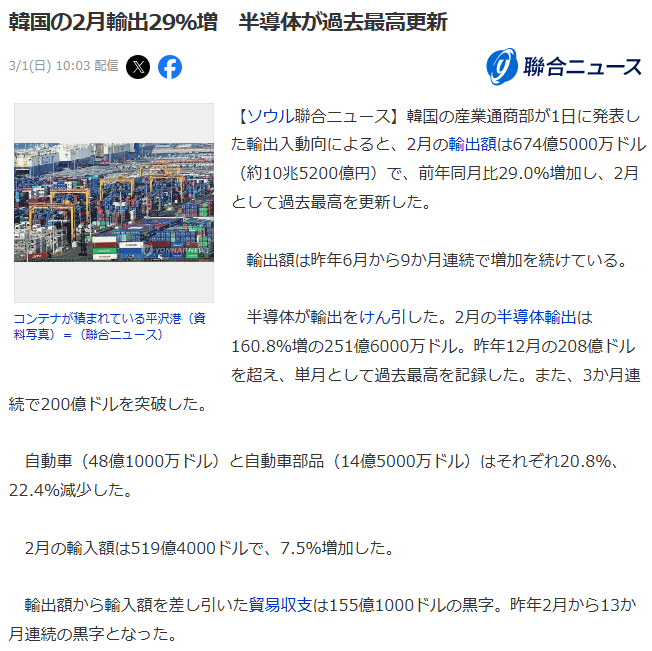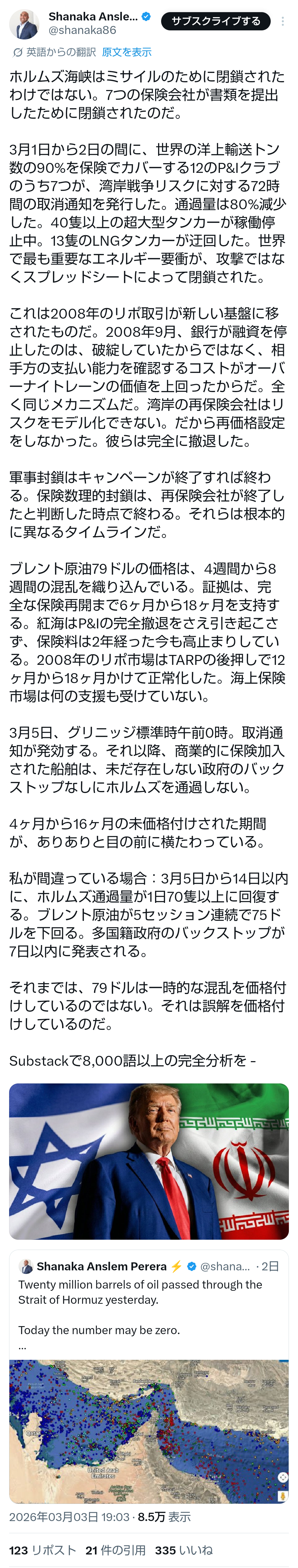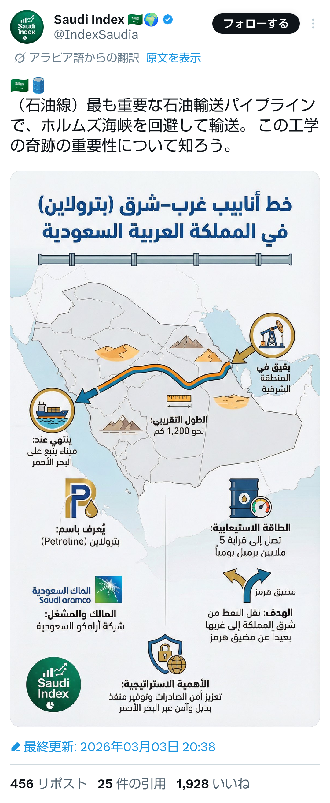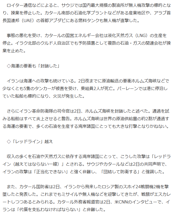 | … | 50無題Name名無し 26/03/01(日)14:09:44No.784207+原油輸入量のざっくり1/7が途切れたと考えるとつまり1週間の内7日フルに使えてたのが6日になるってことだから |