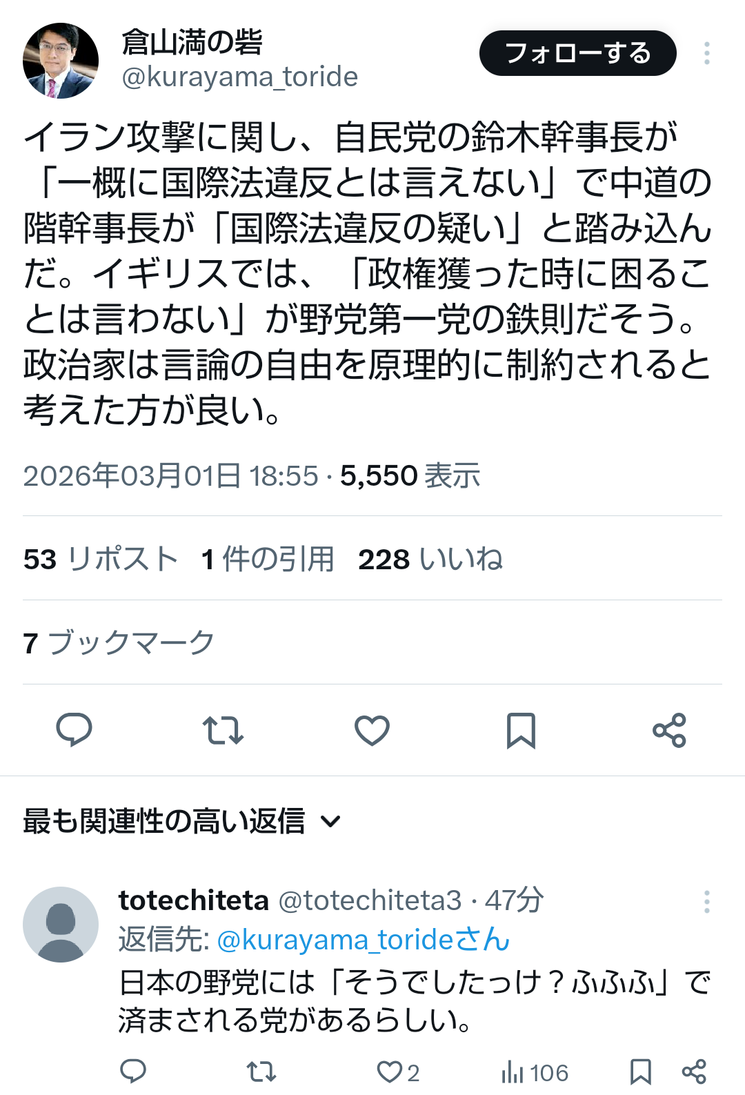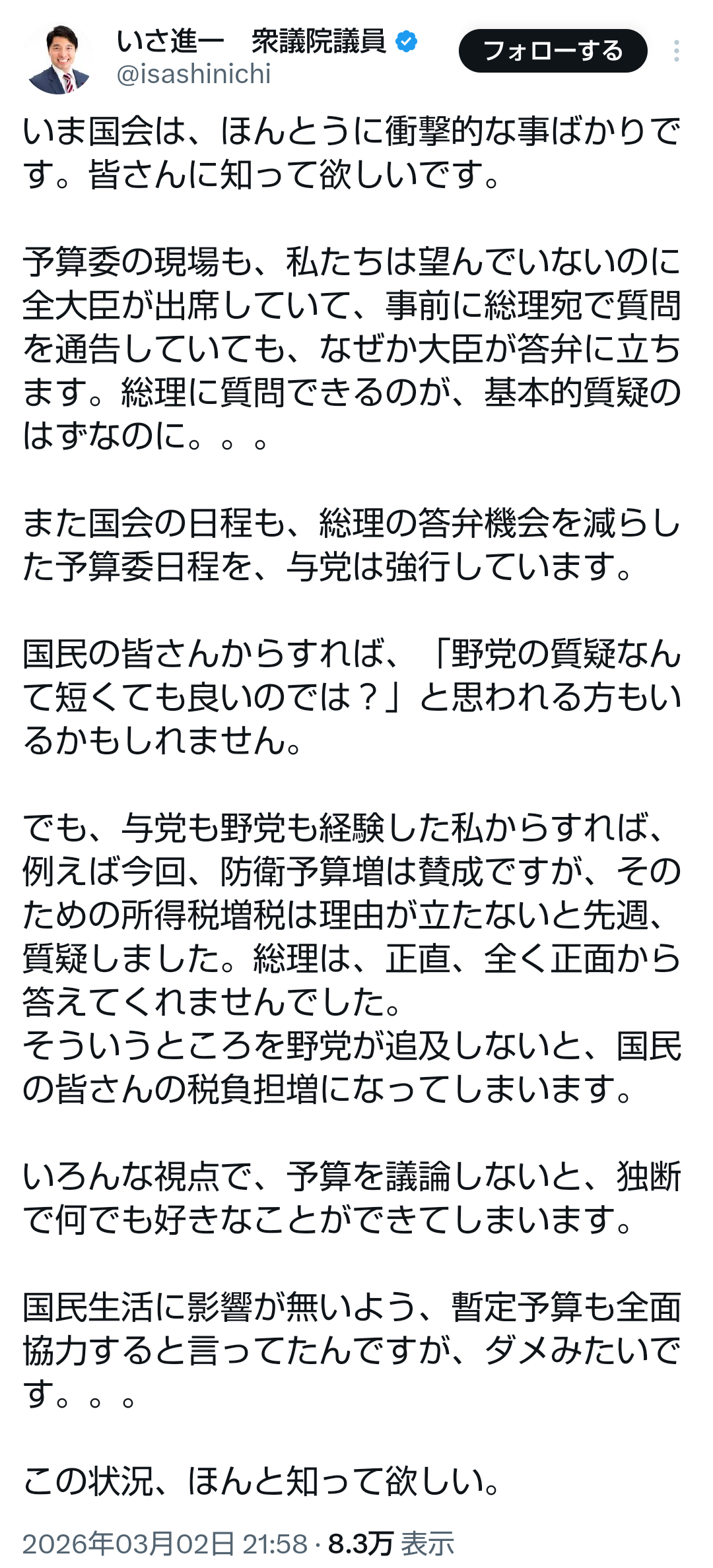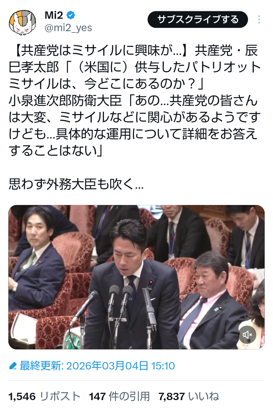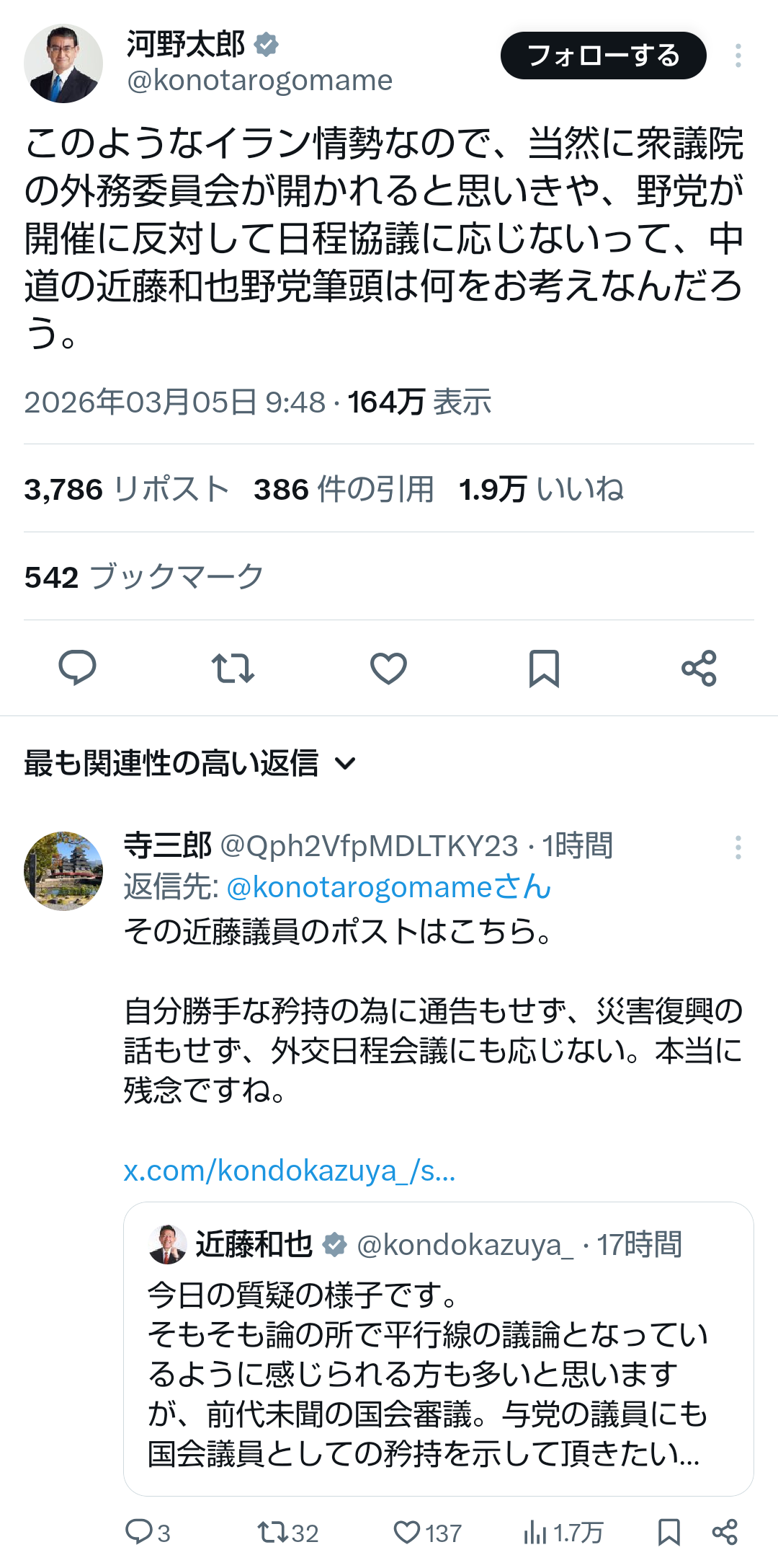 | … | 983無題Name名無し 26/03/05(木)13:30:16No.785310そうだねx1 1772685016587.png-(469887 B) >このようなイラン情勢なので、当然に衆議院の外務委員会が開かれると思いきや、野党が開催に反対して日程協議に応じないって、中道の近藤和也野党筆頭は何をお考えなんだろう。 |