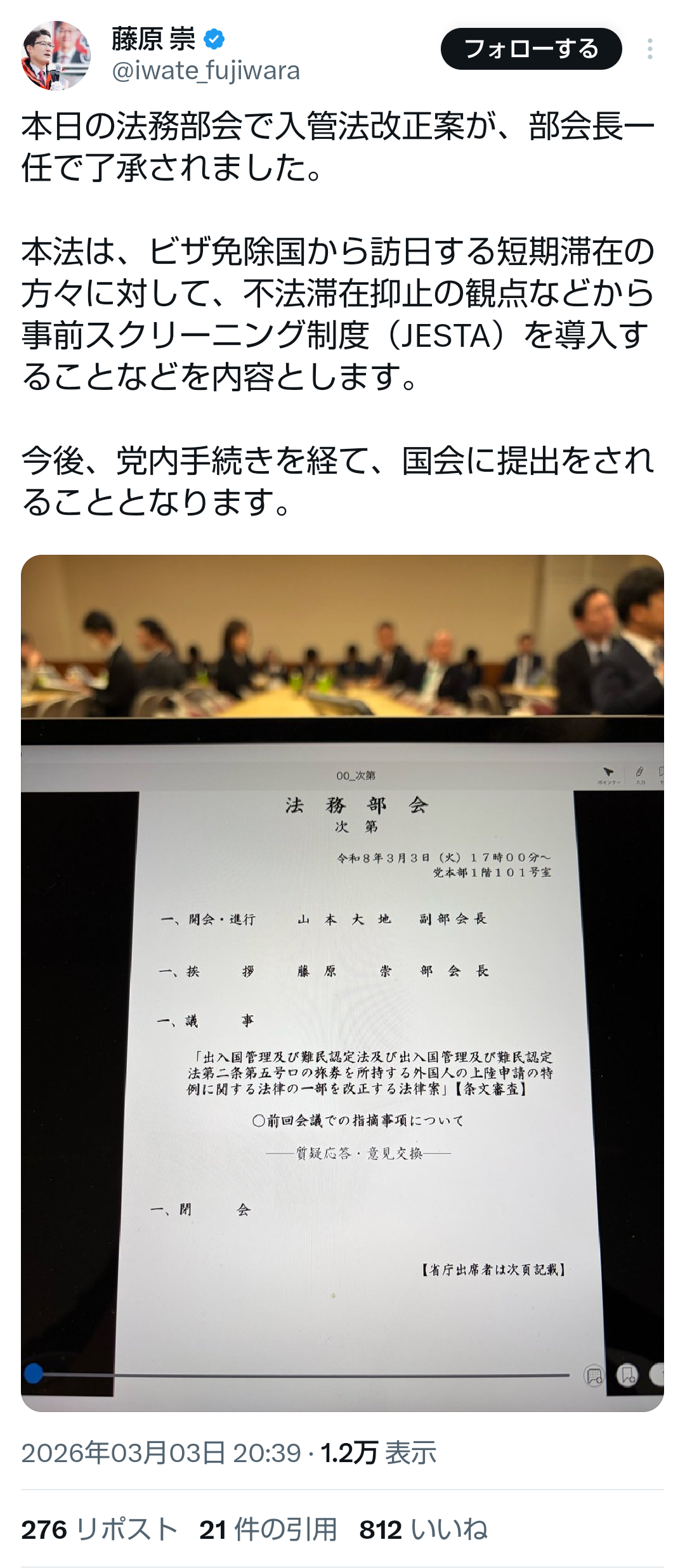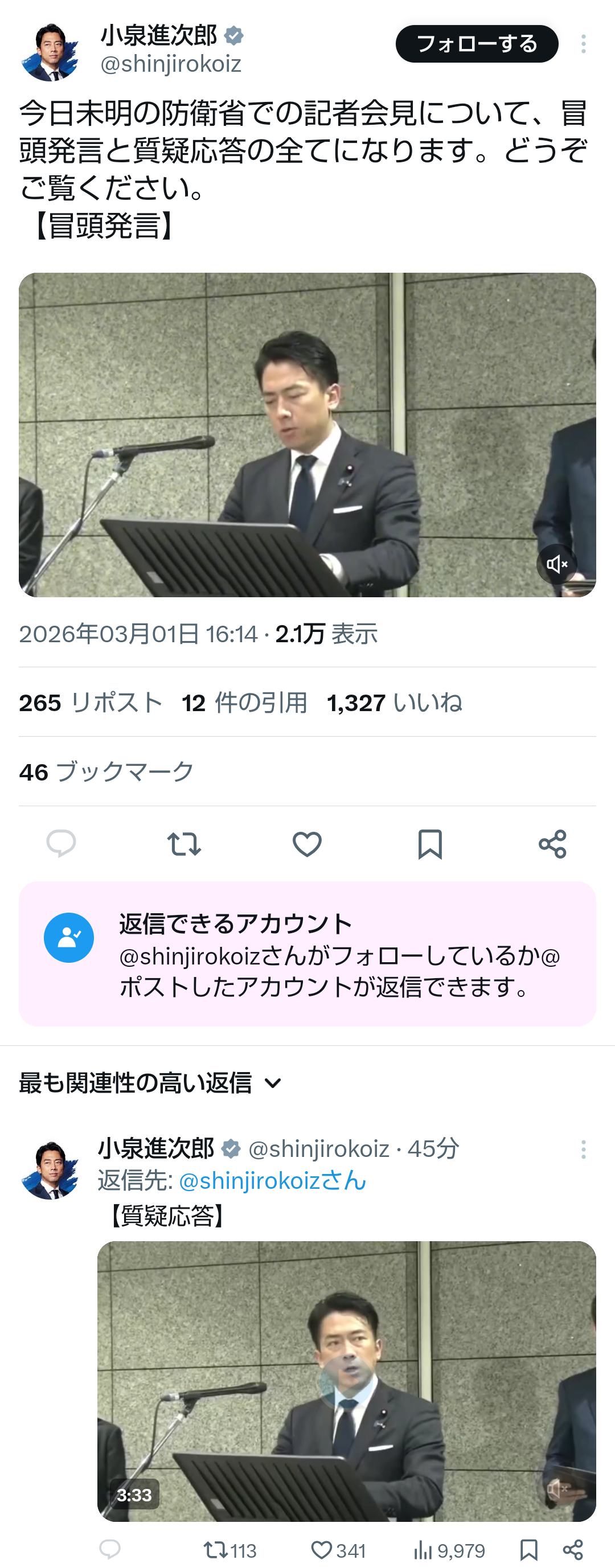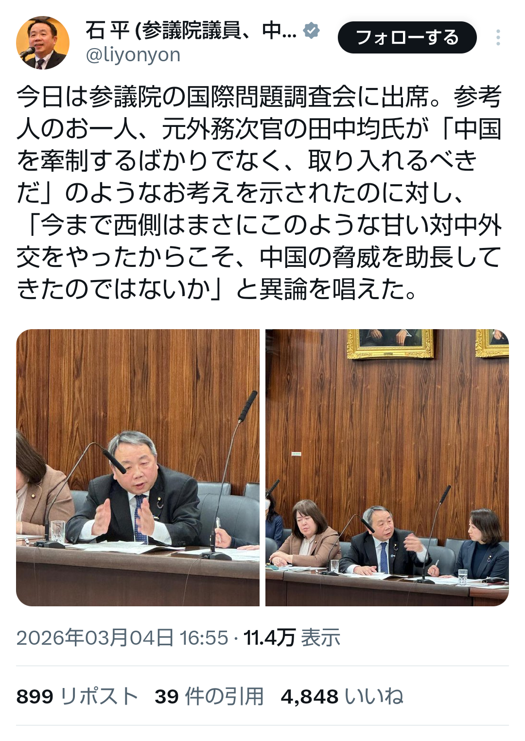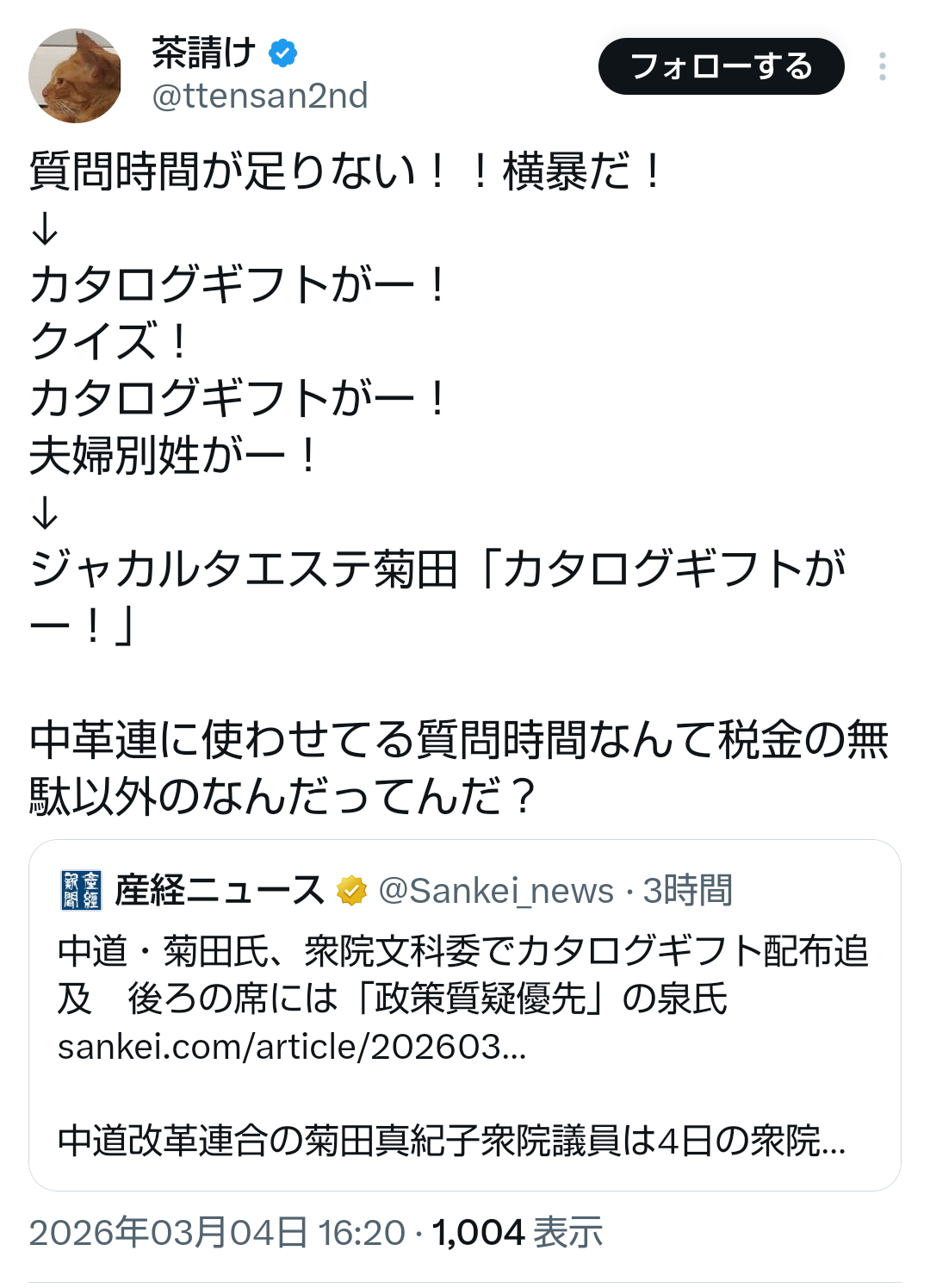 | … | 983無題Name名無し 26/03/05(木)13:30:16No.785310そうだねx1 1772685016587.png-(469887 B) >このようなイラン情勢なので、当然に衆議院の外務委員会が開かれると思いきや、野党が開催に反対して日程協議に応じないって、中道の近藤和也野党筆頭は何をお考えなんだろう。 |