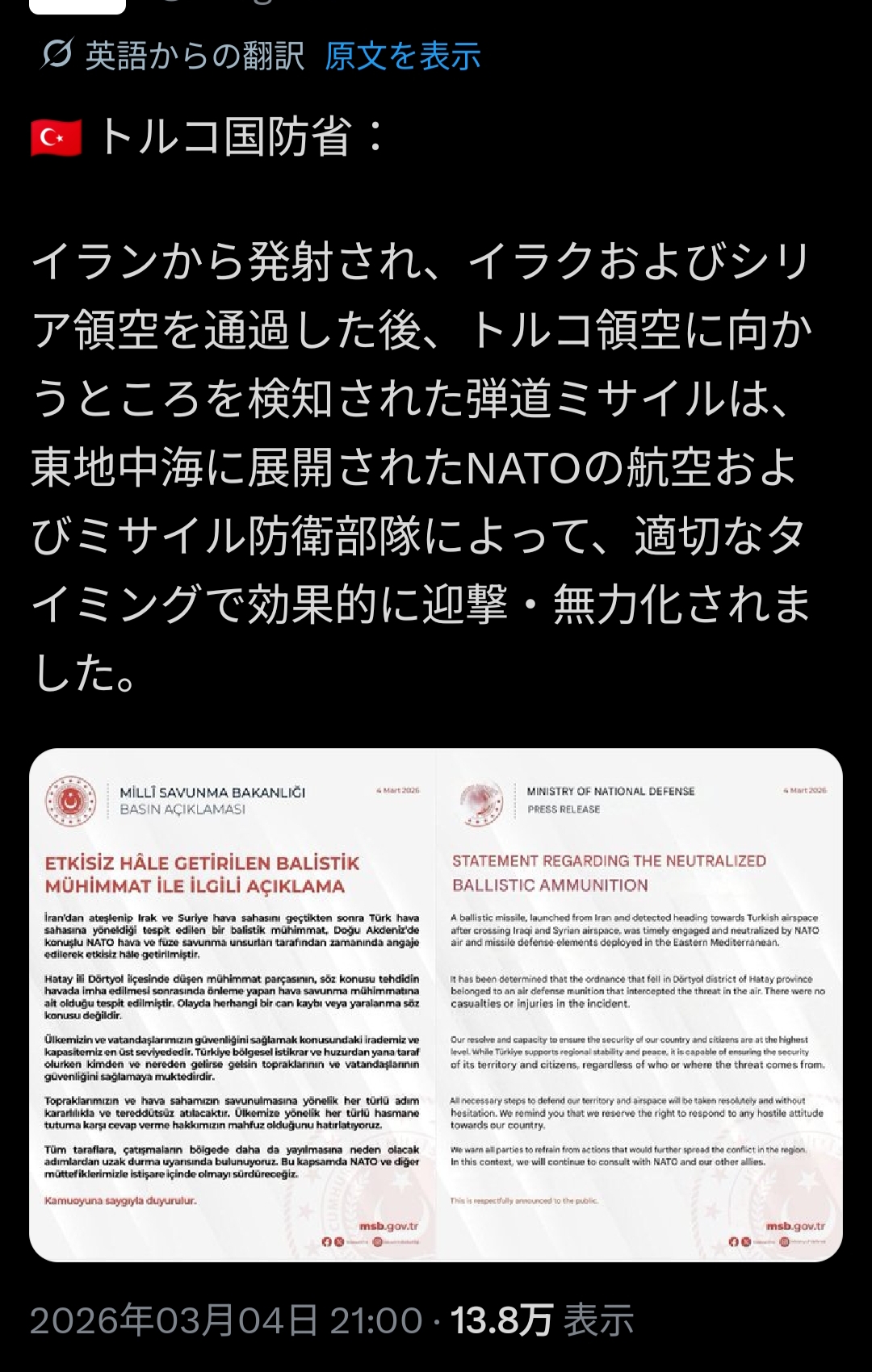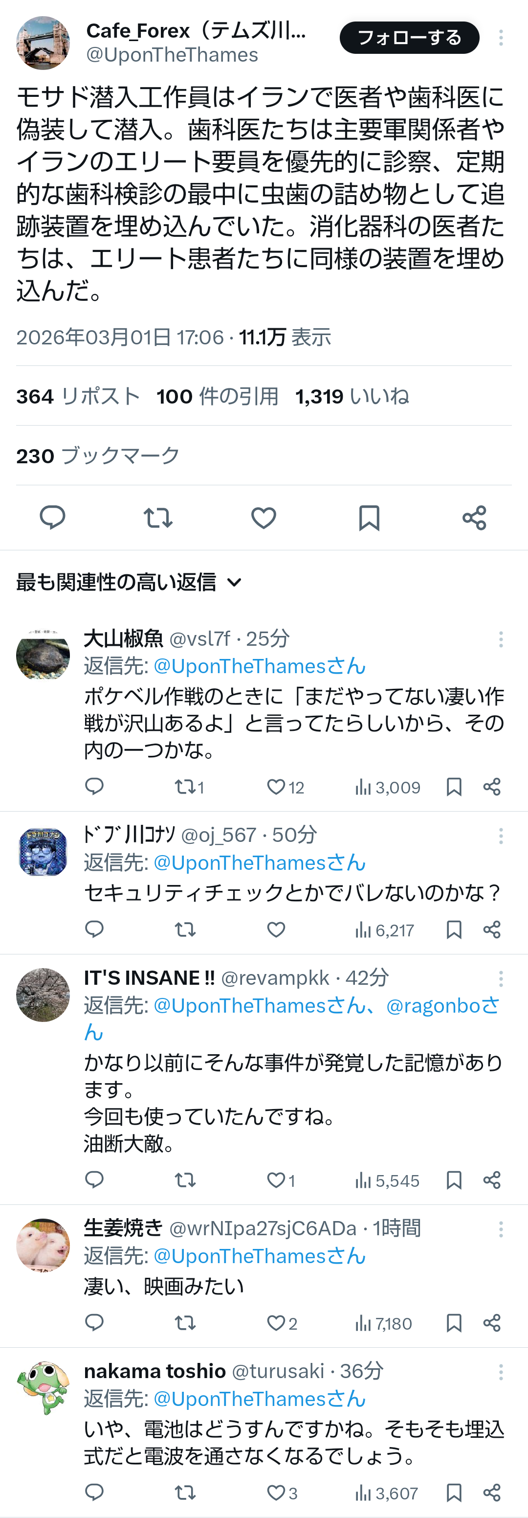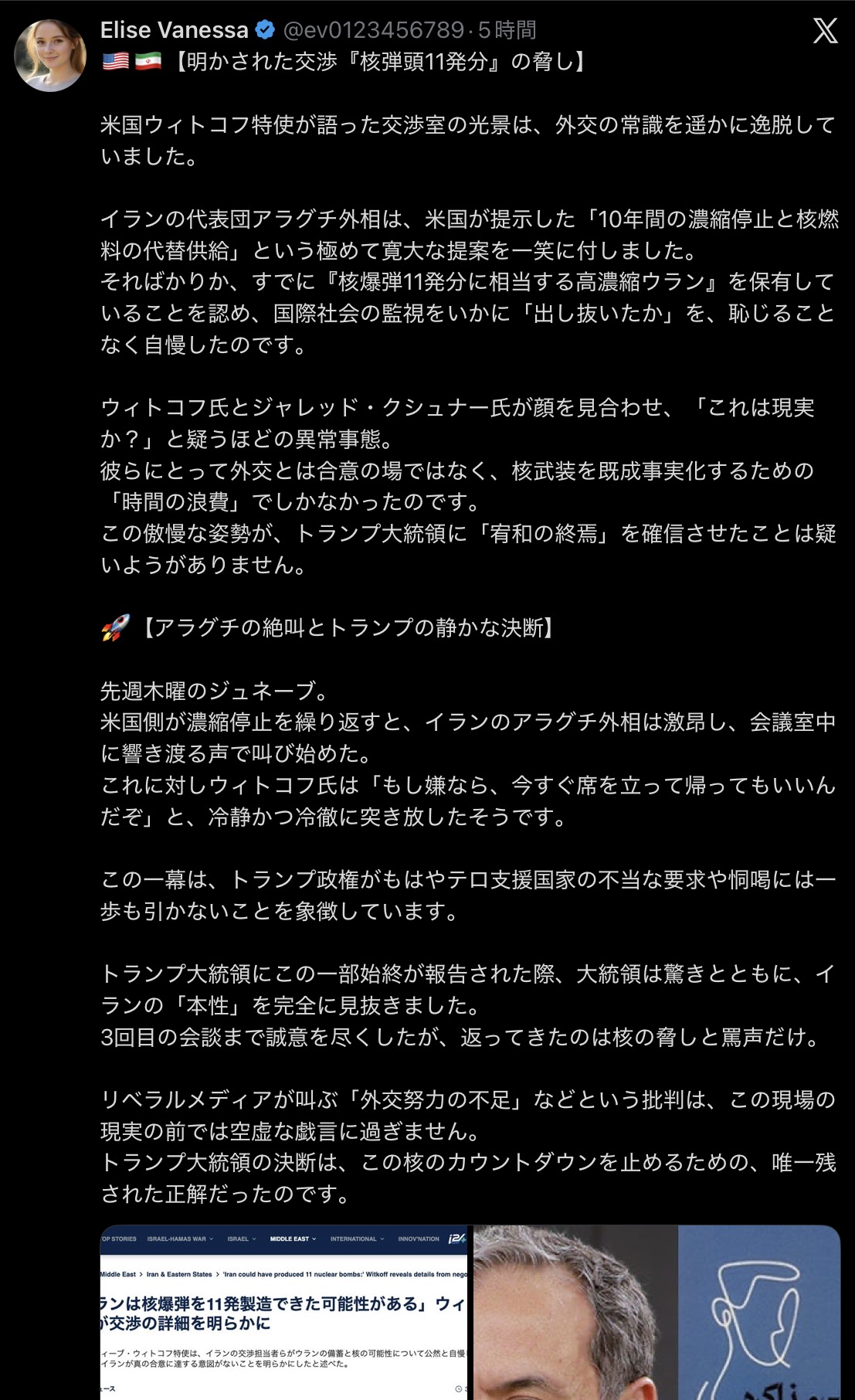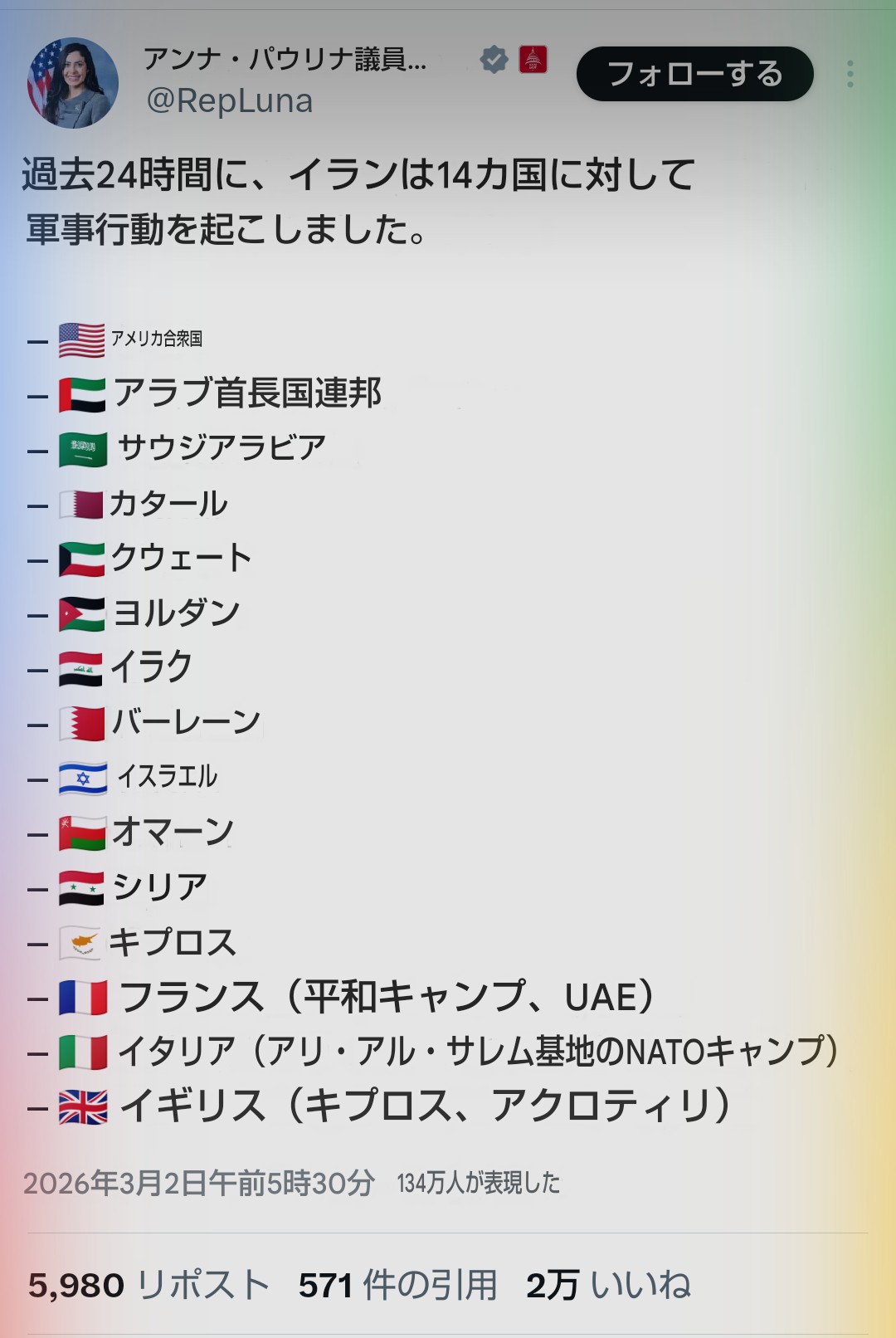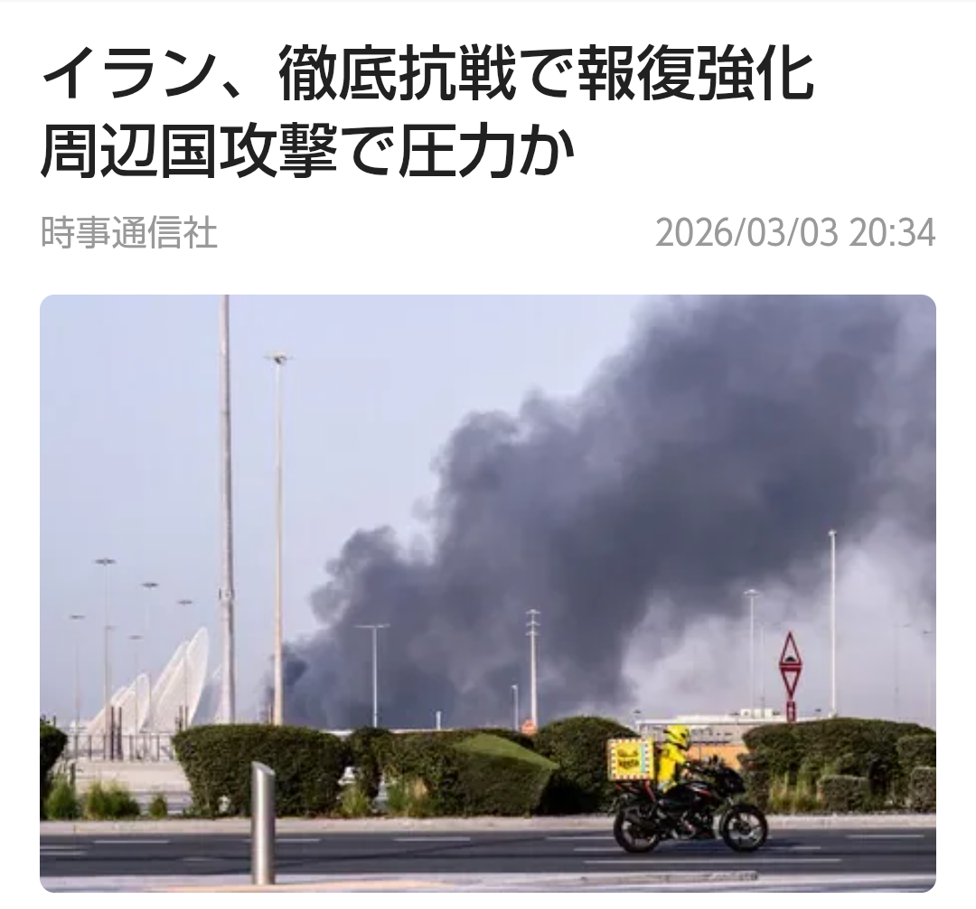 | … | 5無題Name名無し 26/03/01(日)12:47:04No.784156+中東各国にいたであろうイランシンパが口挟んだり妨害する機会全部吹っ飛ばしたのはなぜなんだろうね |