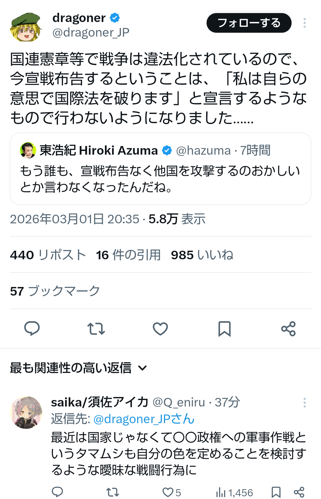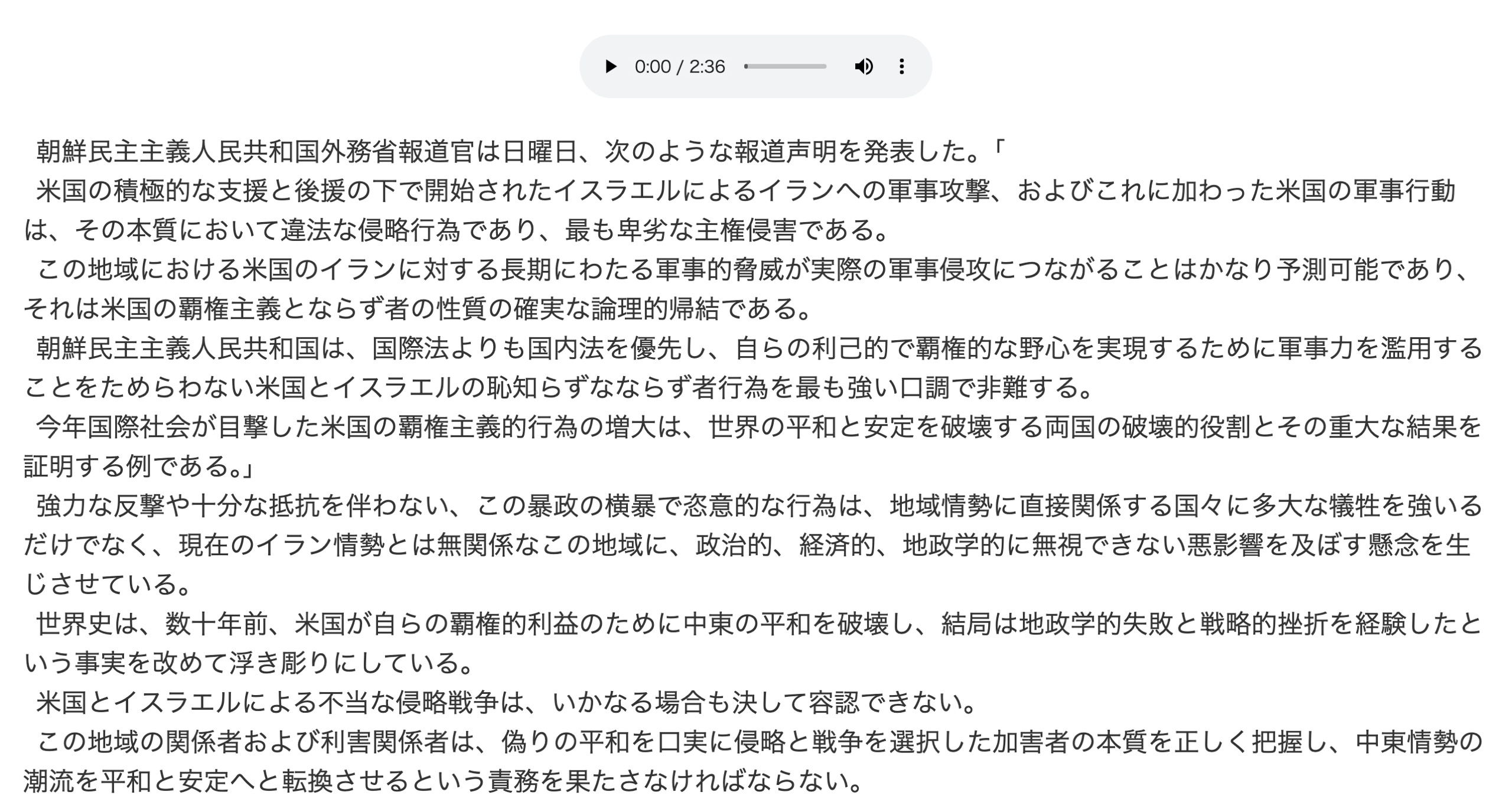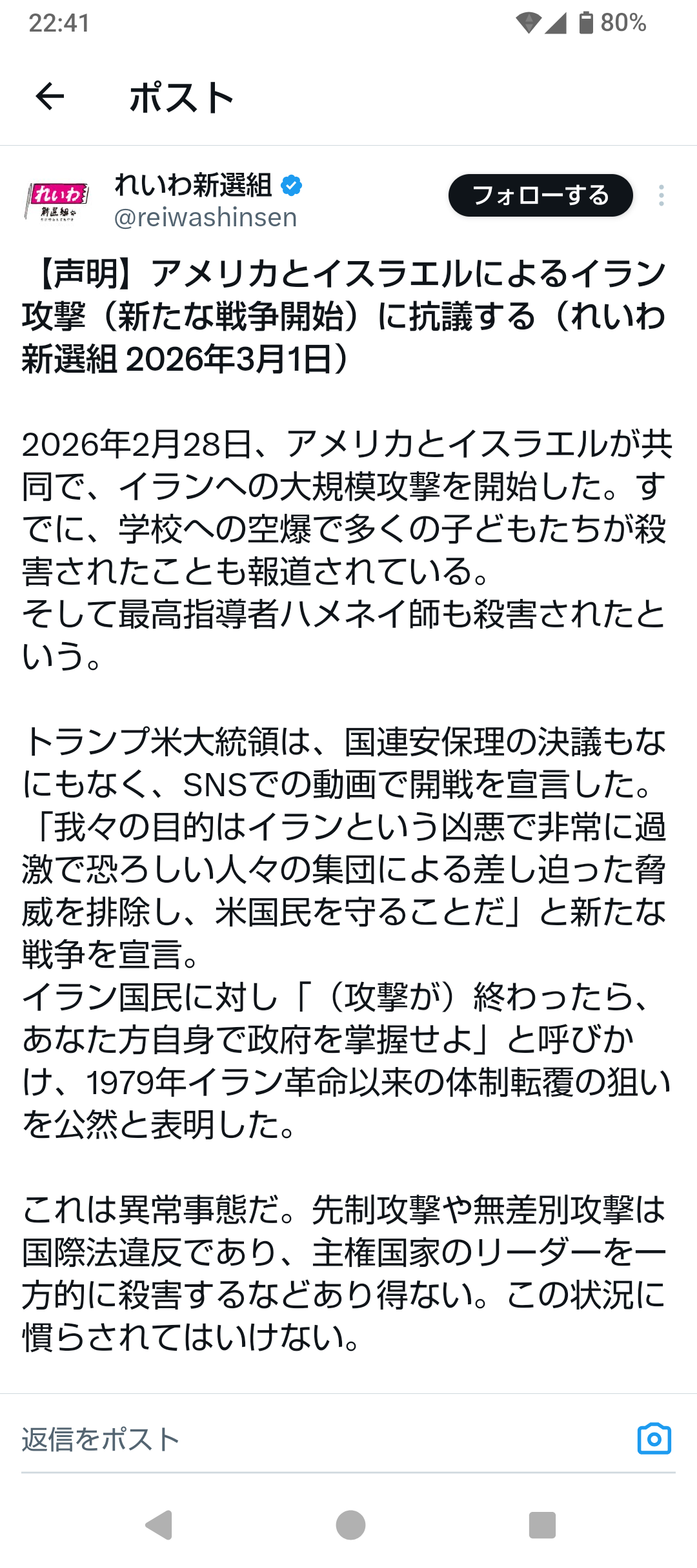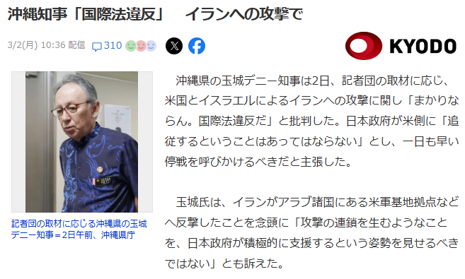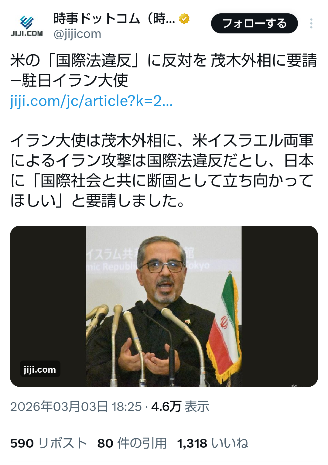 | … | 39無題Name名無し 26/03/01(日)13:51:26No.784190+ 1772340686978.png-(2161296 B) >トランプ米政権とイスラエルは28日、イランに対する大規模な攻撃を開始した。これは国連憲章と国際法を乱暴に蹂躙する無法な先制攻撃であり、断固糾弾する。 |