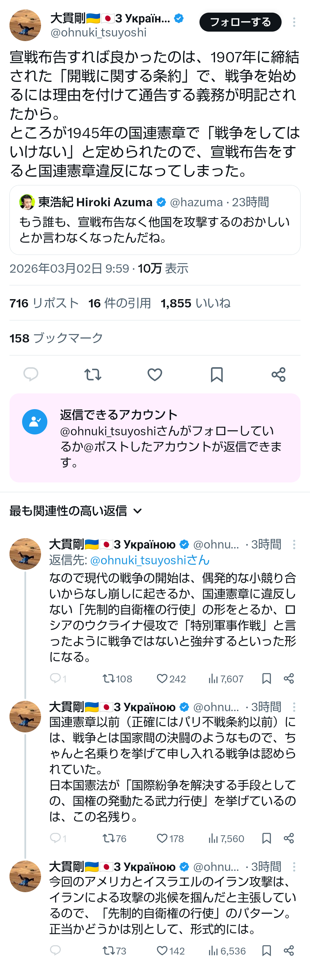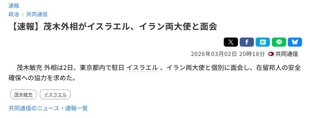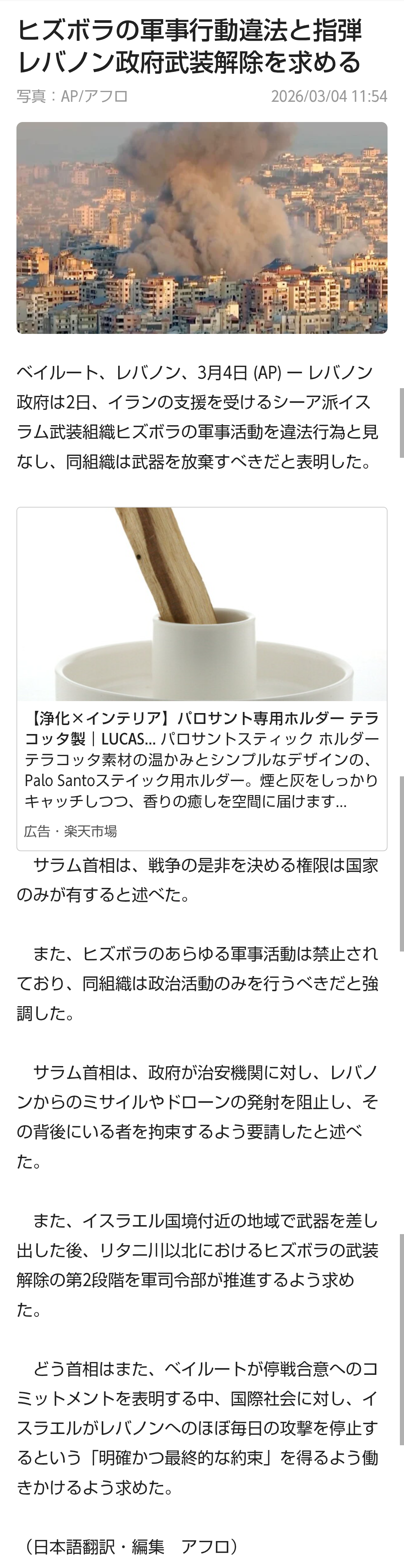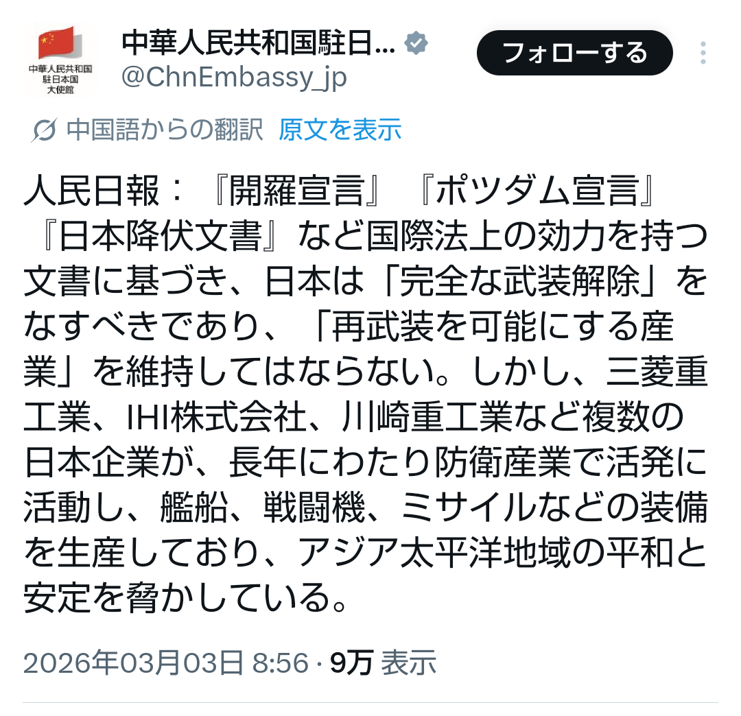 | … | 39無題Name名無し 26/03/01(日)13:51:26No.784190+ 1772340686978.png-(2161296 B) >トランプ米政権とイスラエルは28日、イランに対する大規模な攻撃を開始した。これは国連憲章と国際法を乱暴に蹂躙する無法な先制攻撃であり、断固糾弾する。 |