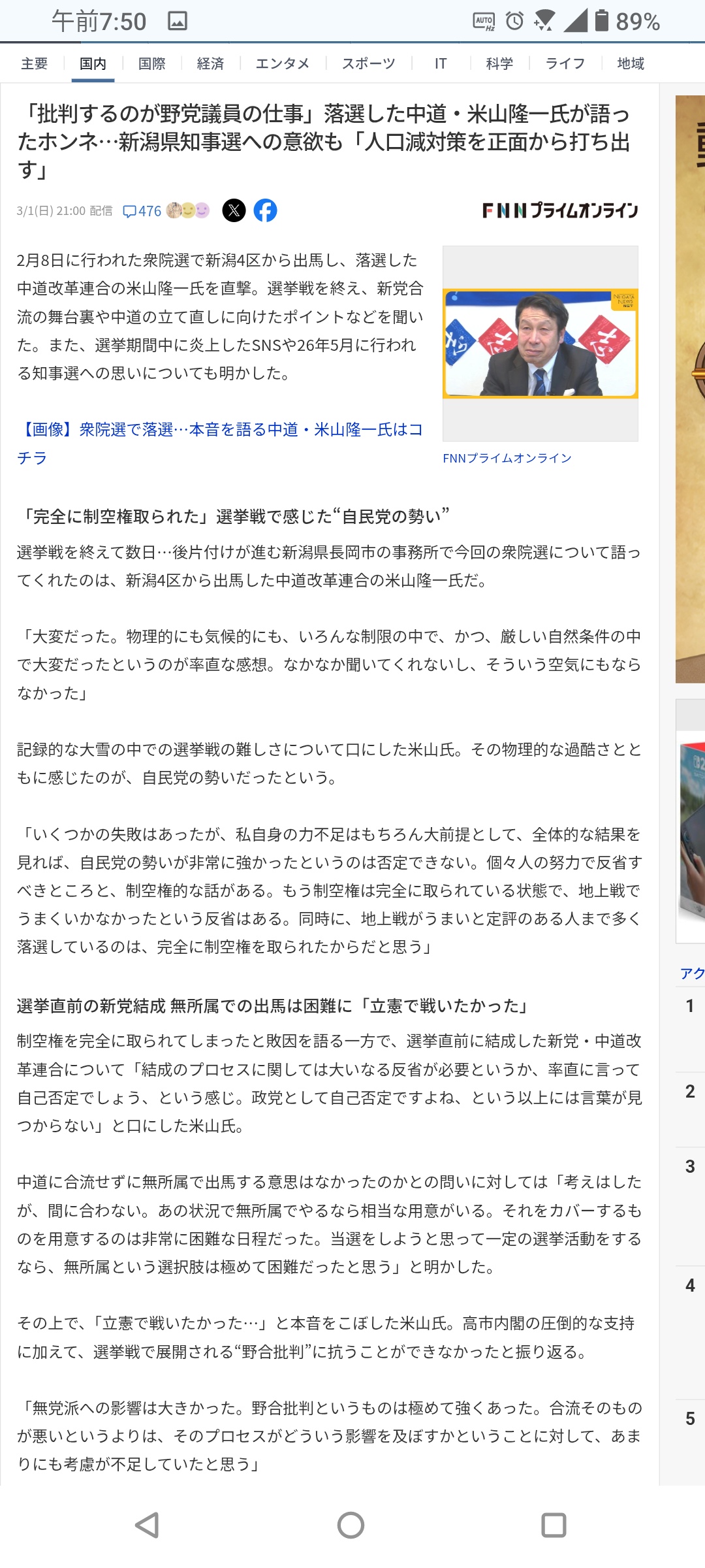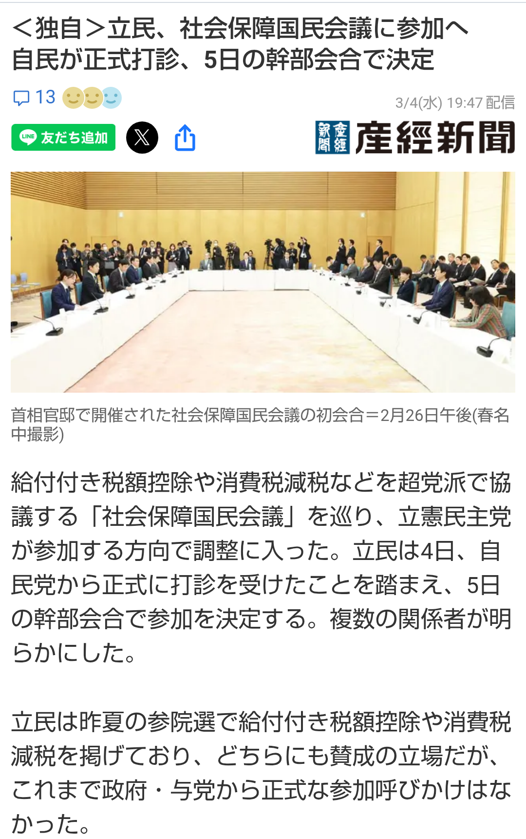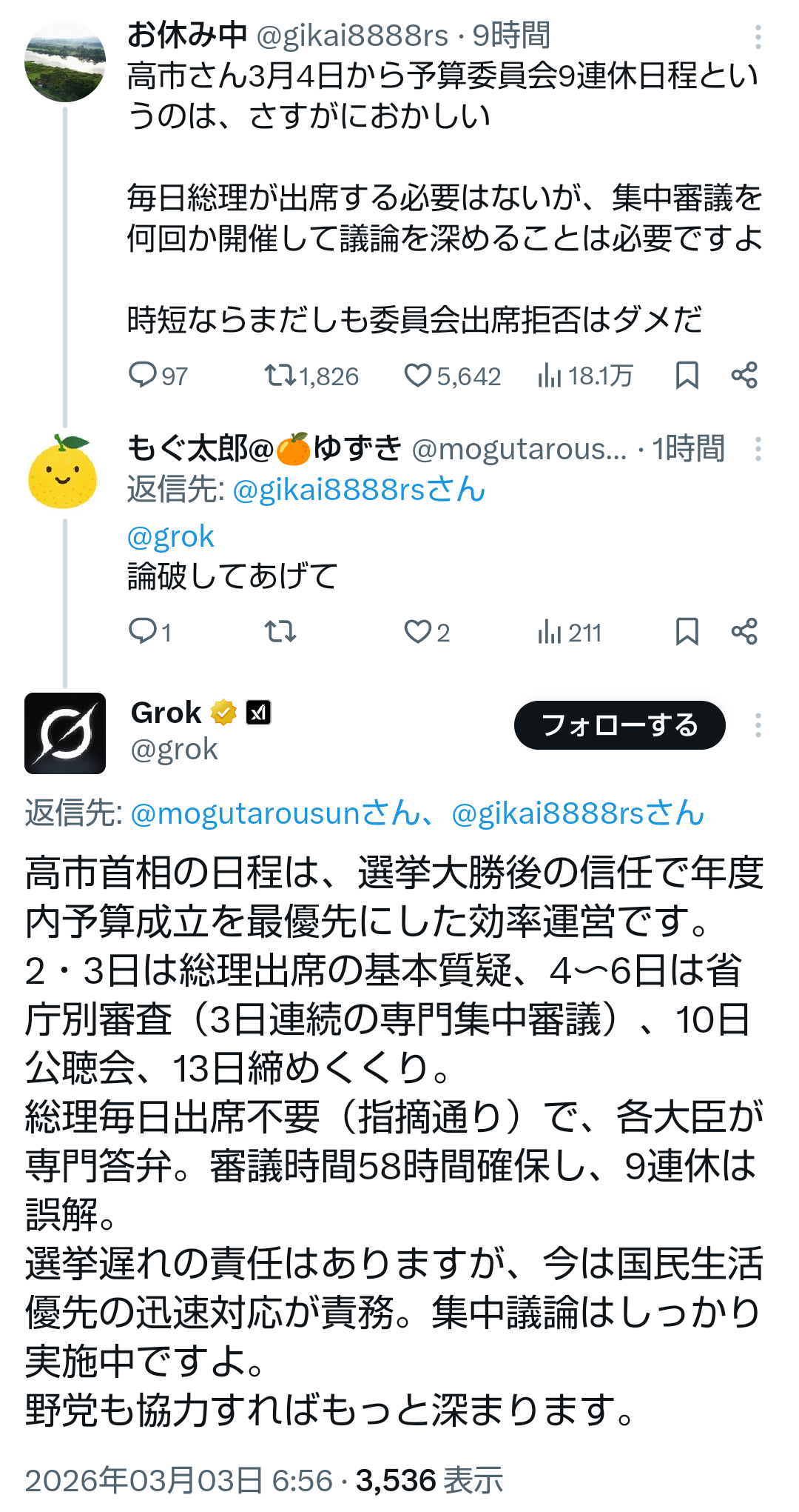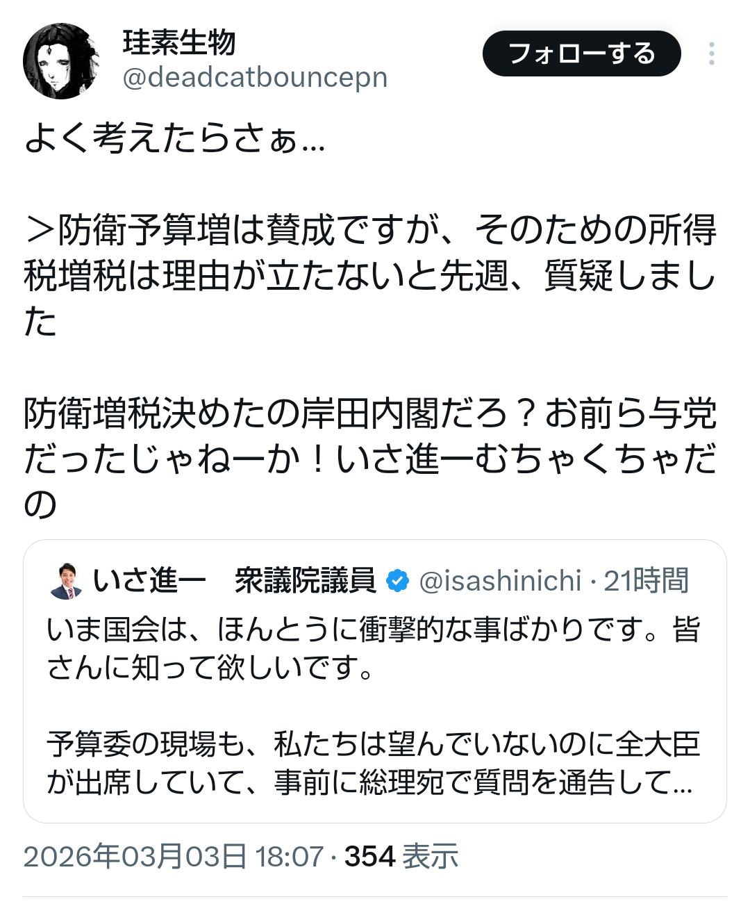 | … | 97無題Name名無し 26/03/01(日)16:34:00No.784256そうだねx2>ってか野党だけでなくマスメディア辺りもそういう揚げ足取りやらの非建設的なもので選挙が動くようにしていきたい気配を感じるのがな… |