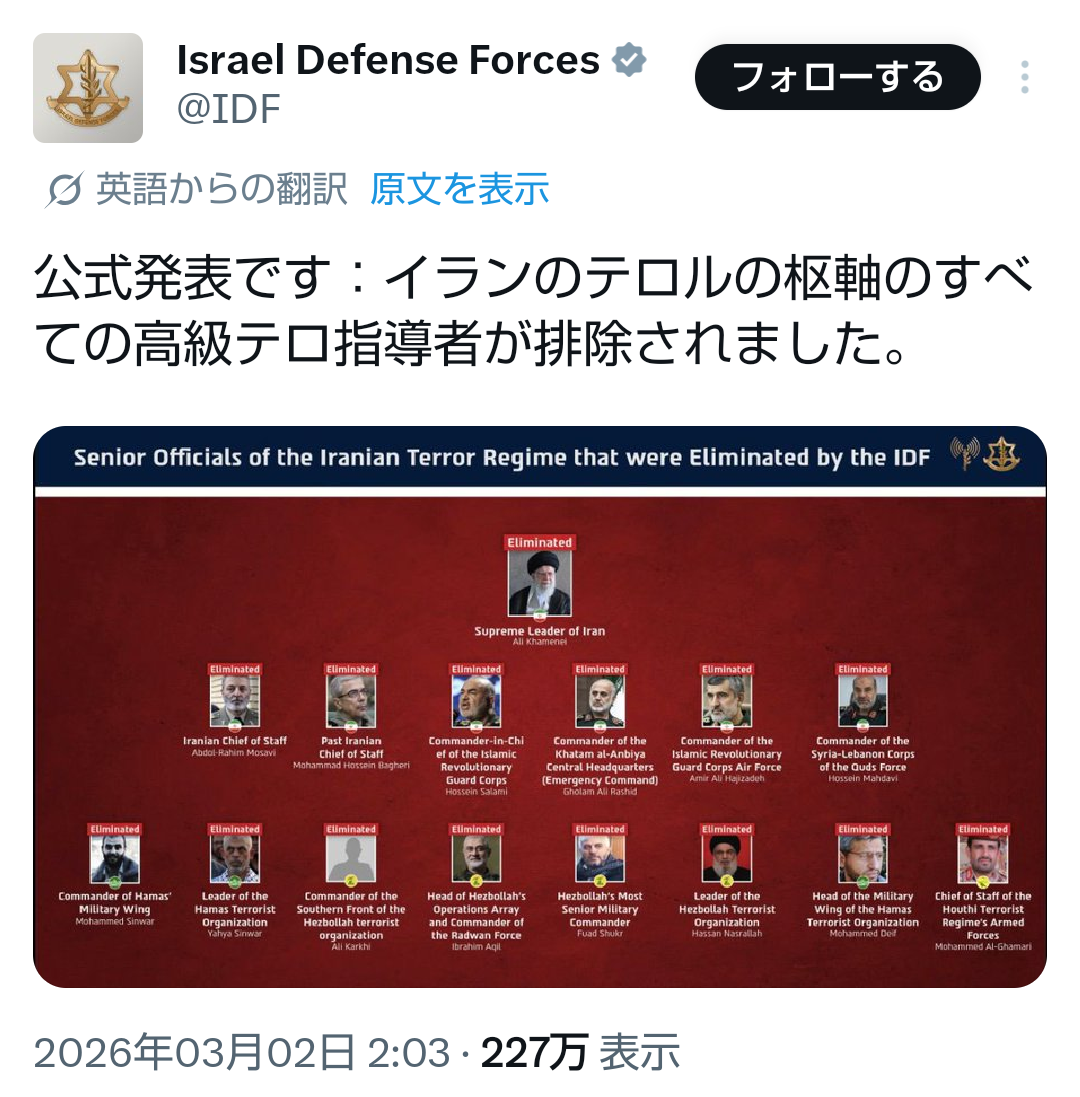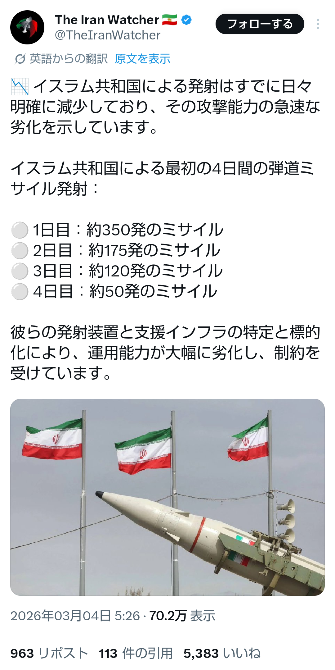 | … | 82無題Name名無し 26/03/01(日)15:21:54No.784241+>イラン指導部は**「国民の幸せ」や「国家の繁栄」よりも、「イスラム体制の継続」と「自分たちの地位」を最優先**しました。 |