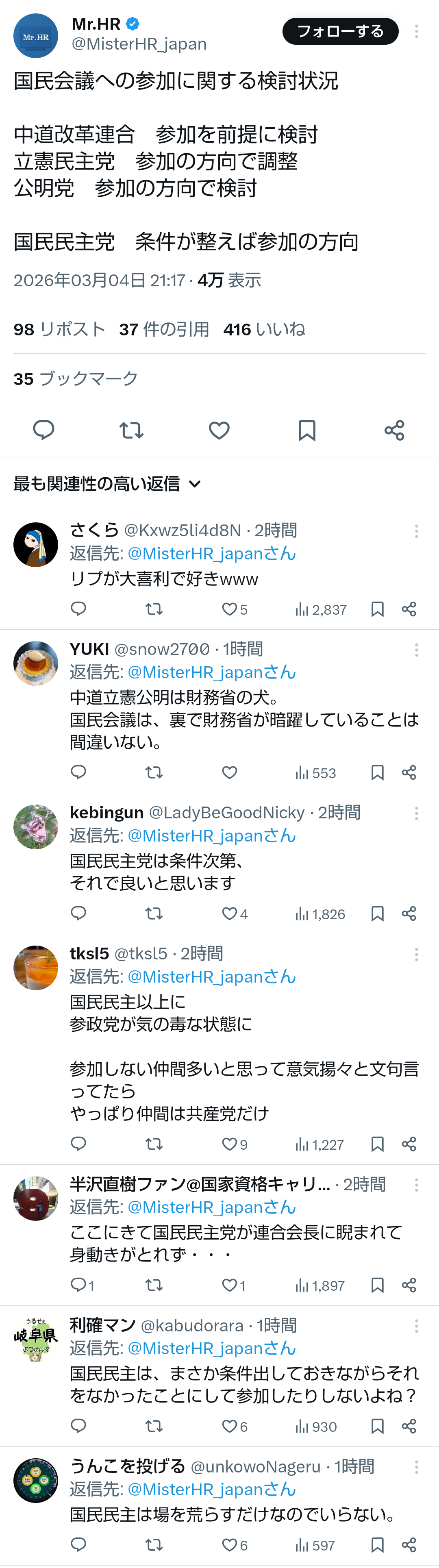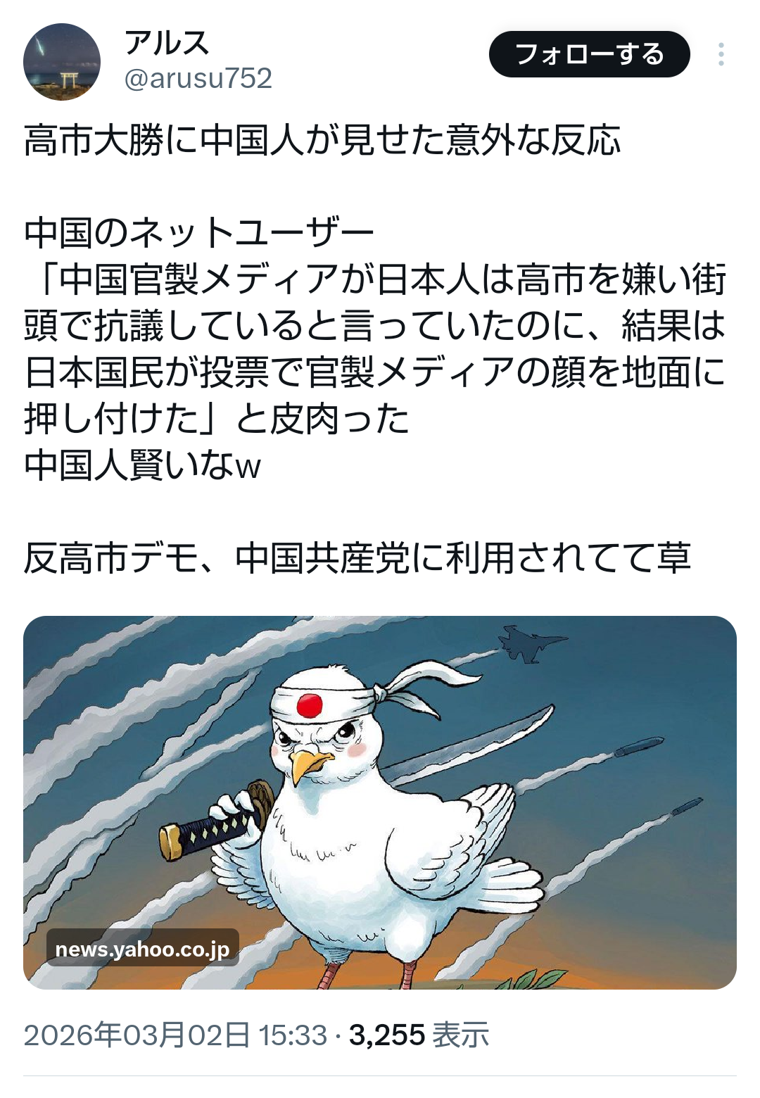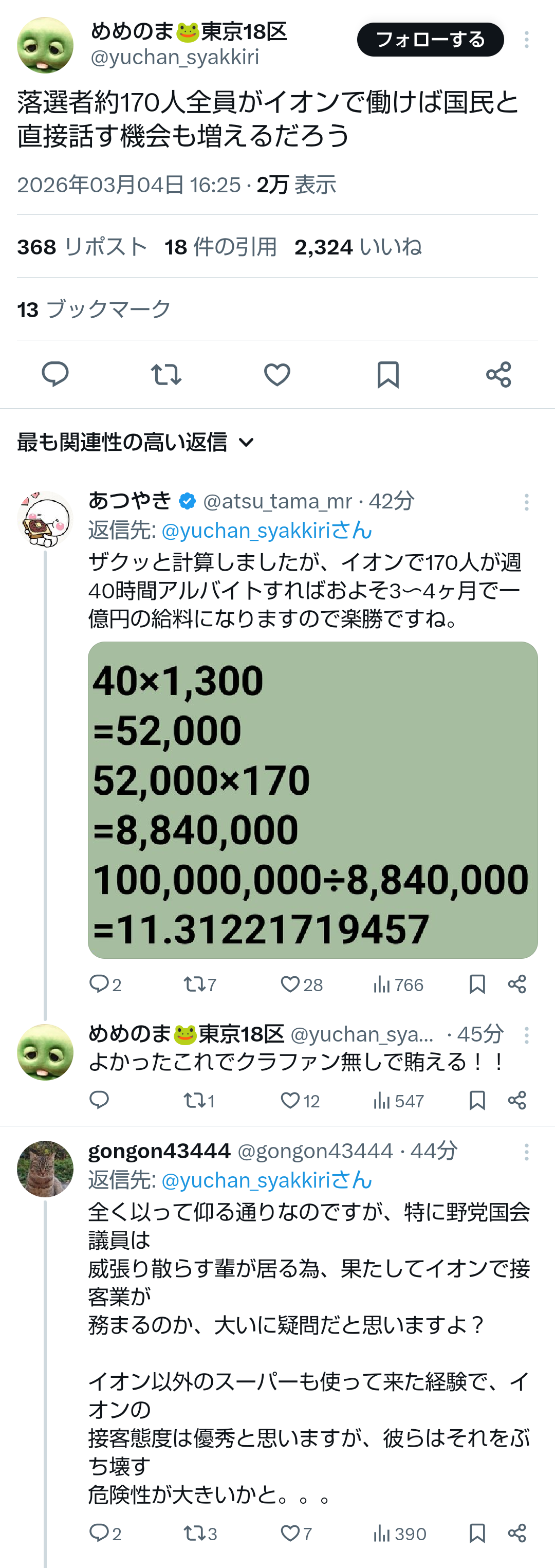 | … | 95無題Name名無し 26/03/01(日)16:22:30No.784254+ってか野党だけでなくマスメディア辺りもそういう揚げ足取りやらの非建設的なもので選挙が動くようにしていきたい気配を感じるのがな… |