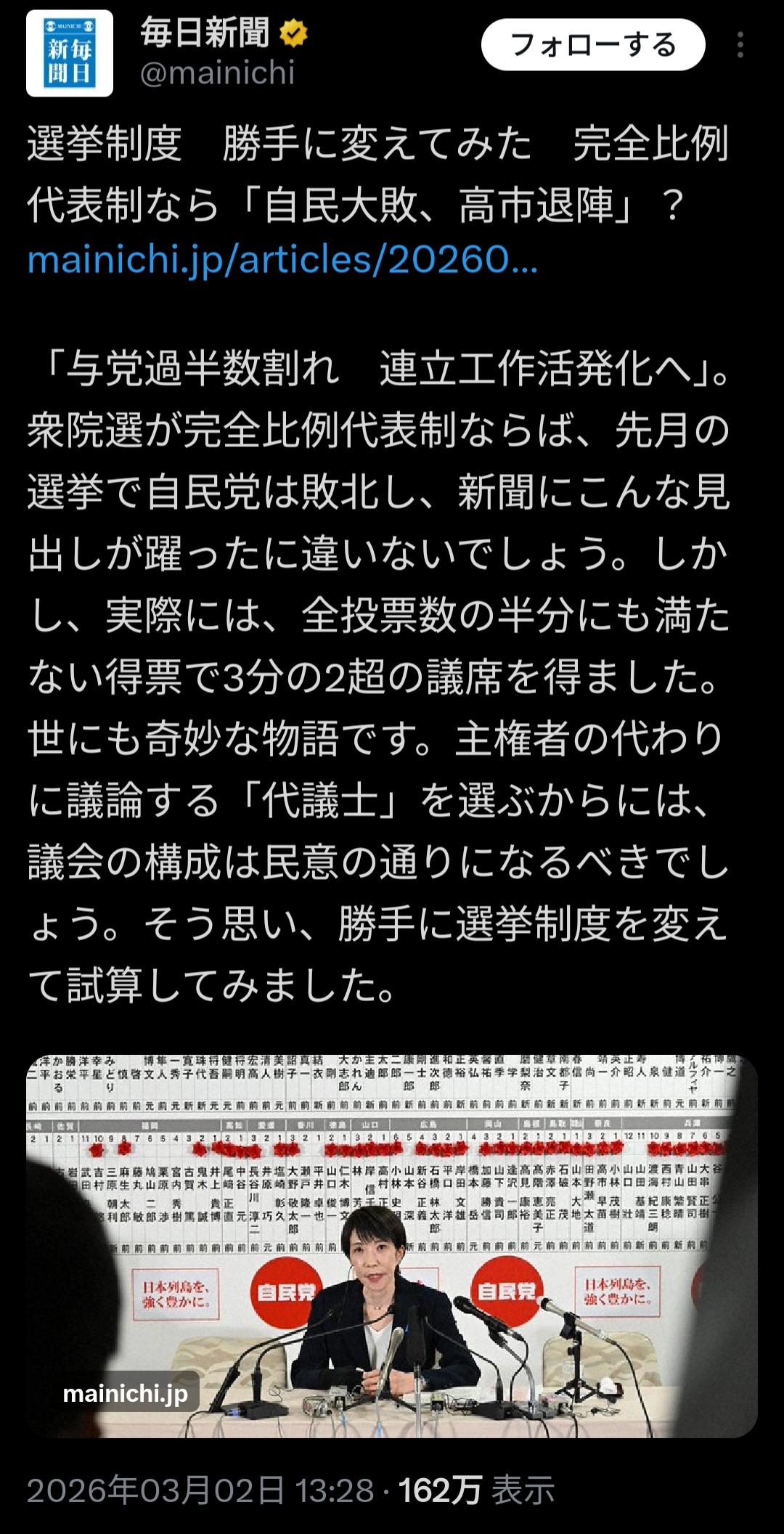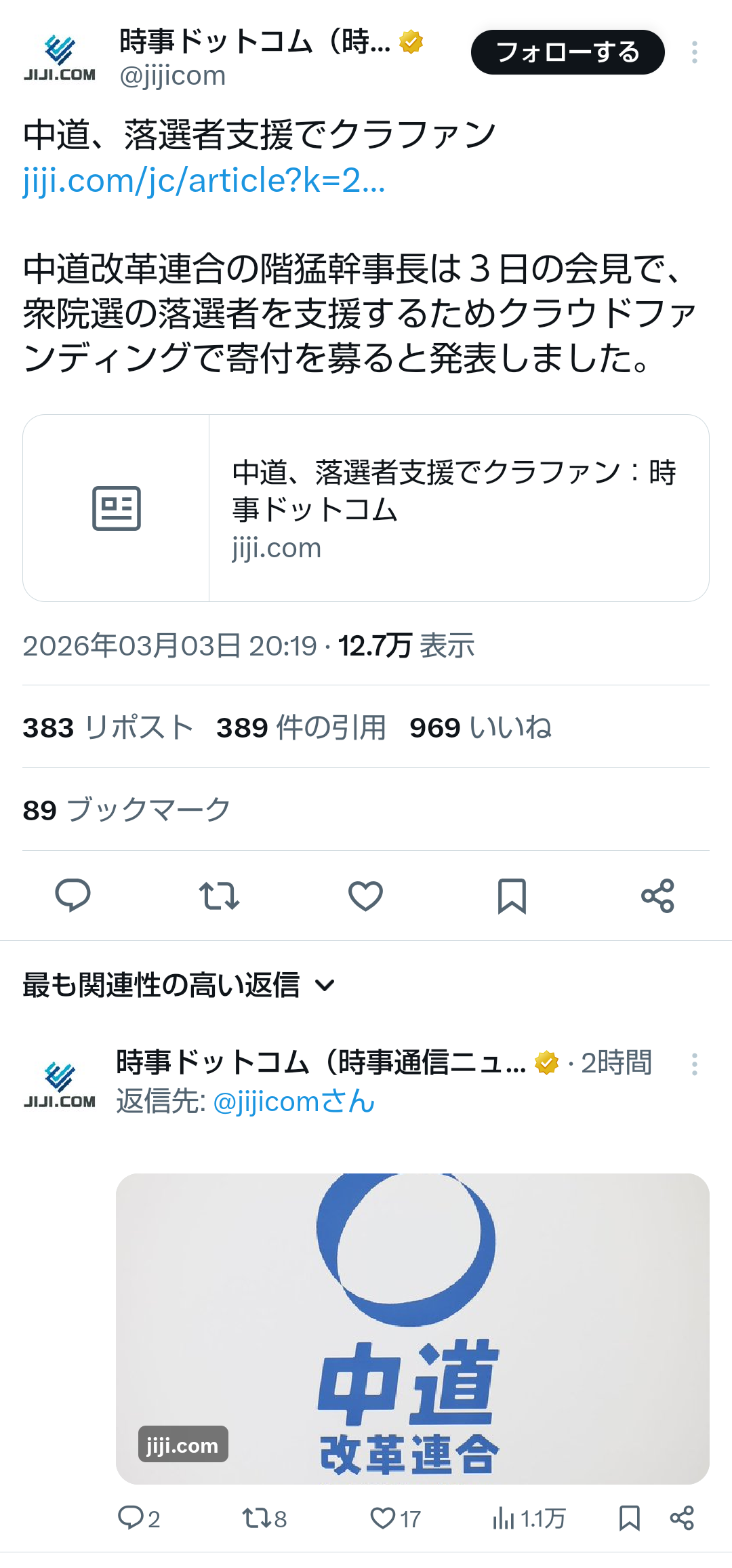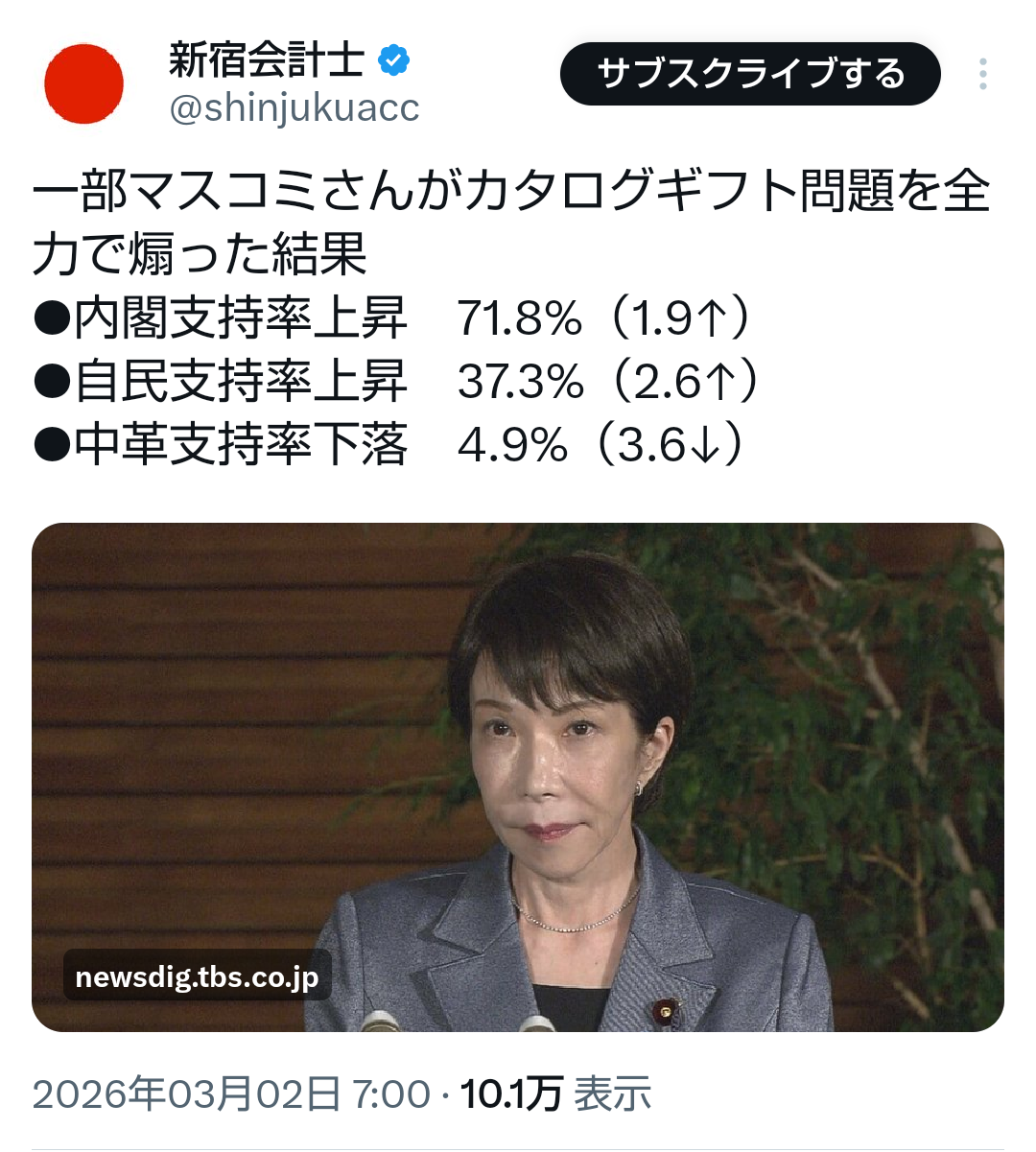 | … | 95無題Name名無し 26/03/01(日)16:22:30No.784254+ってか野党だけでなくマスメディア辺りもそういう揚げ足取りやらの非建設的なもので選挙が動くようにしていきたい気配を感じるのがな… |