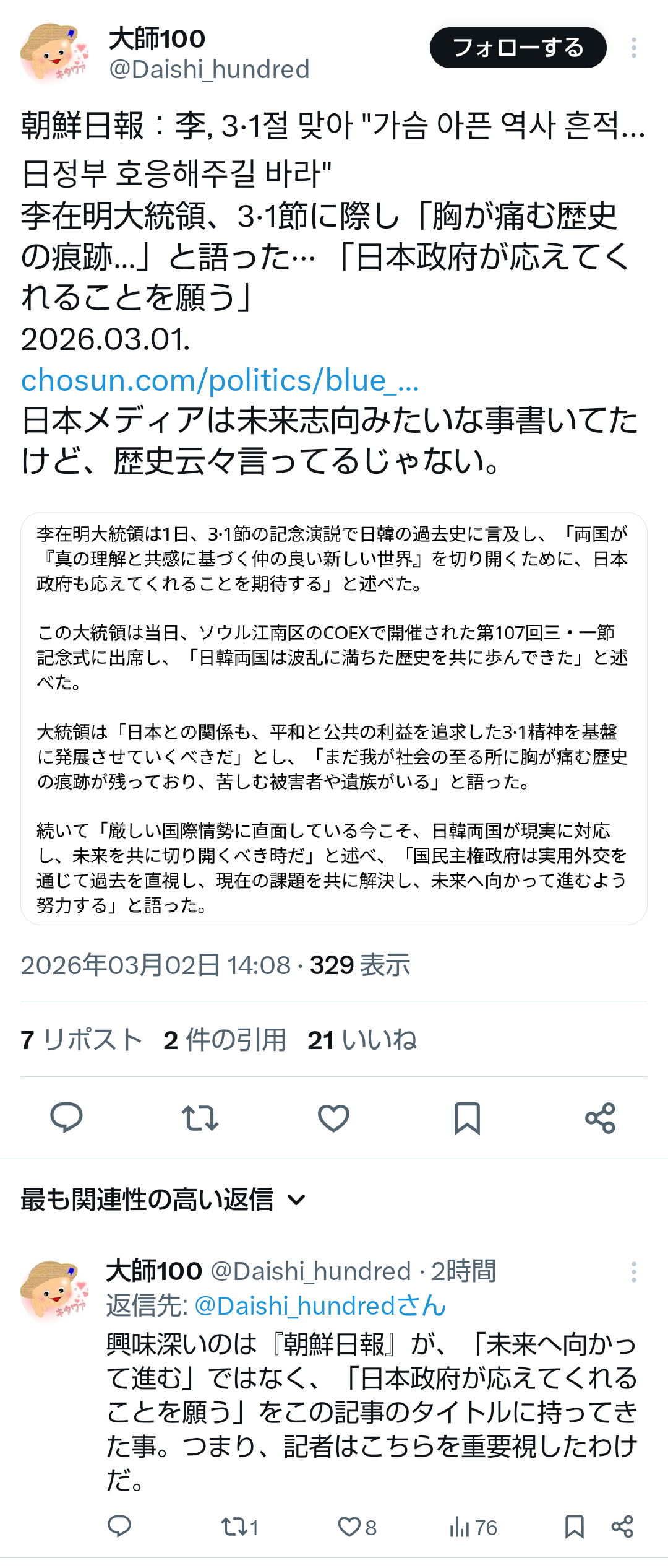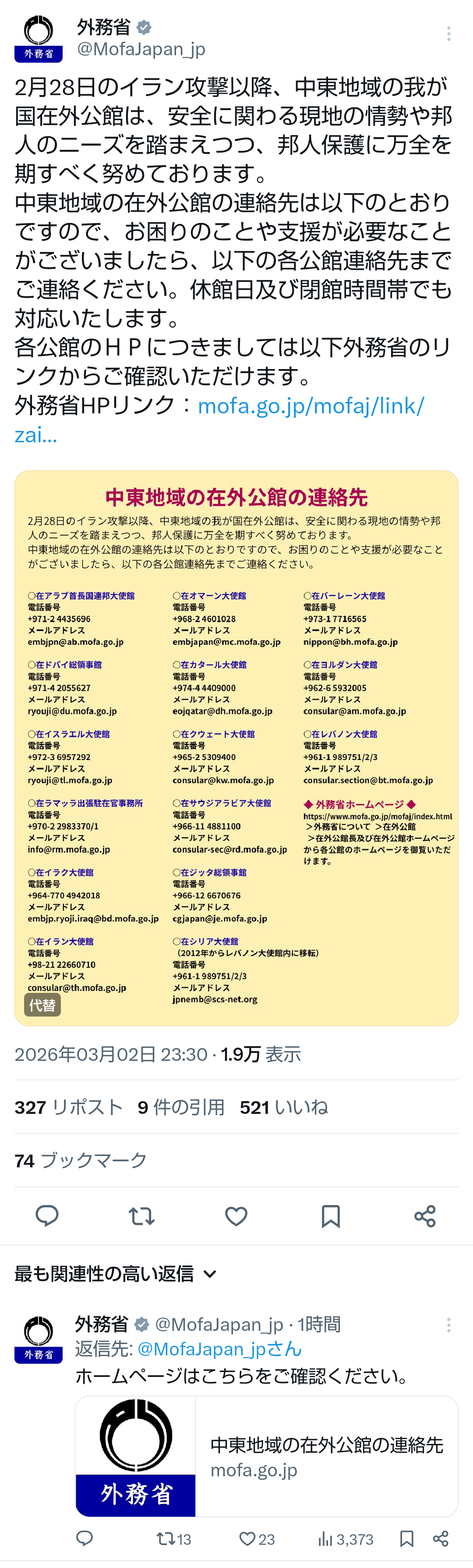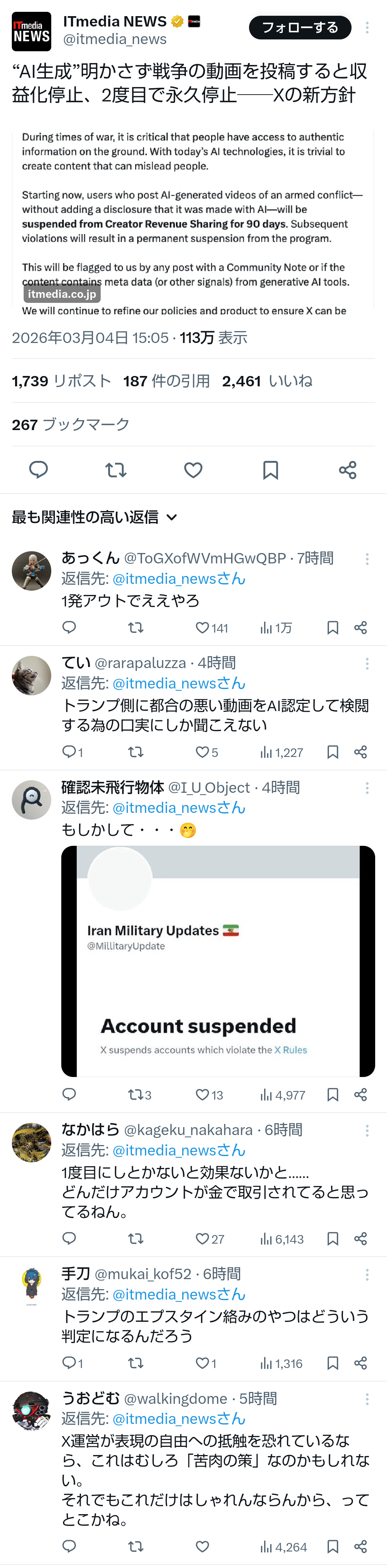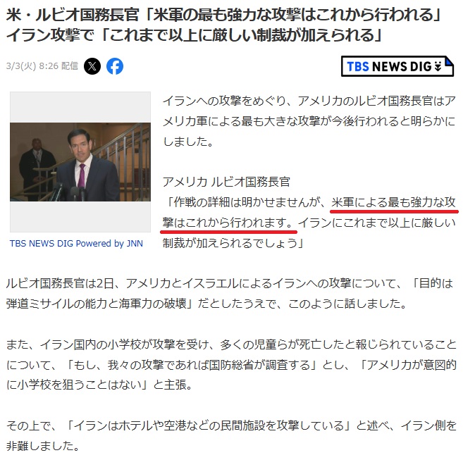 | … | 89無題Name名無し 26/03/01(日)15:51:39No.784248+日本の各局はそら開戦だって無計画に飛びつくんじゃなくてこの報道で世論にどういう影響を与えるかを |