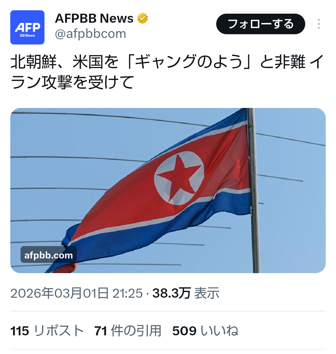 | … | 923無題Name名無し 26/03/05(木)09:13:45No.785248そうだねx9日本のメディアがあまりにもアメリカからの言をニュースにしないもんで |