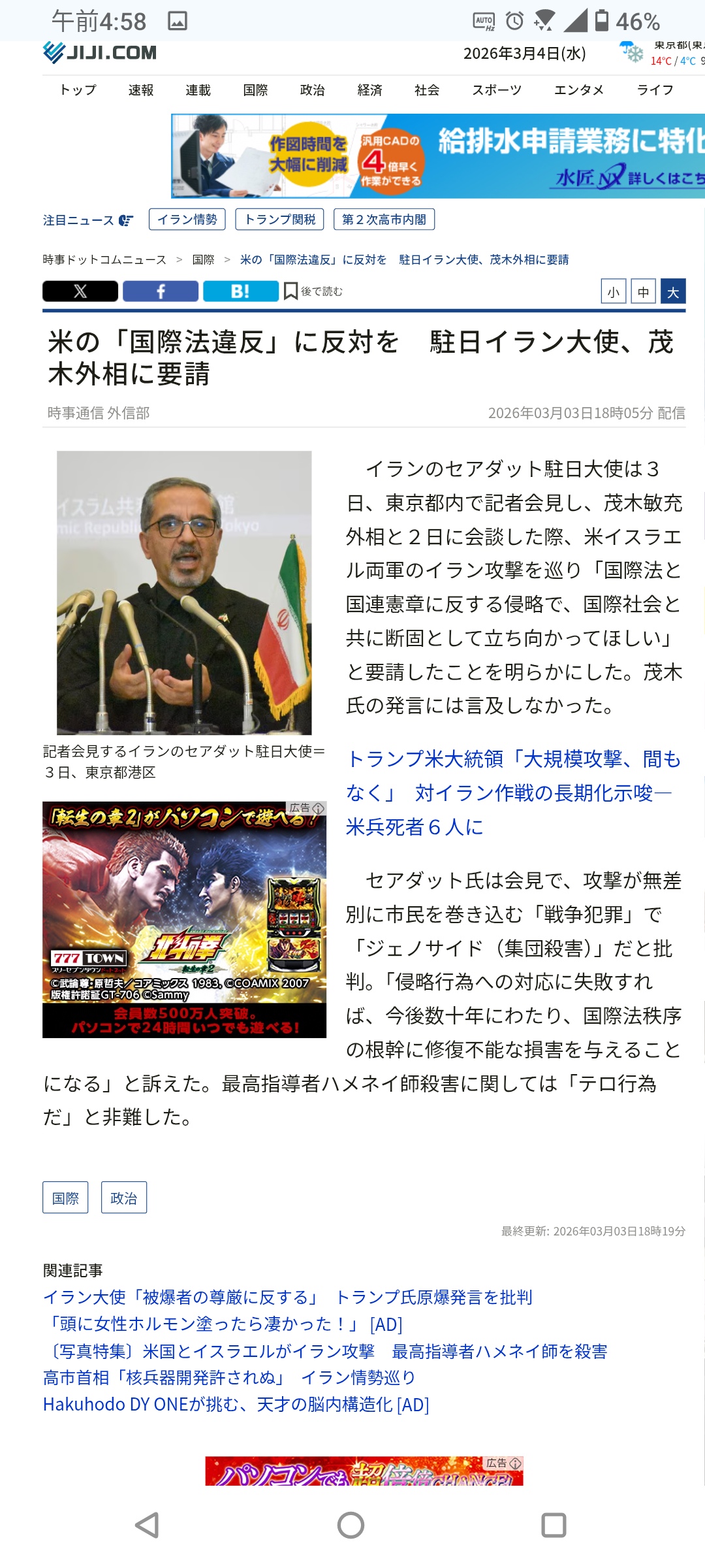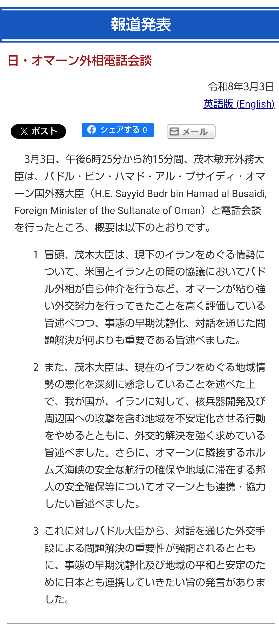 | … | 10無題Name名無し 26/03/01(日)12:56:24No.784161+>中東諸国と電話会談 イラン外相、報復の正当性訴え |