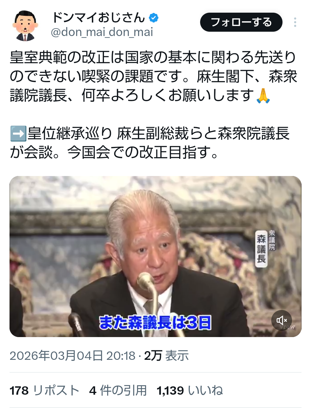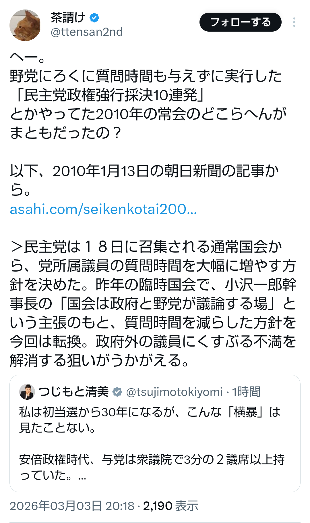 | … | 903無題Name名無し 26/03/05(木)02:26:10No.785226そうだねx1まあ自民単独で衆議院の2/3議席を確保出来てるから予算は確実に通すんだけどな… |