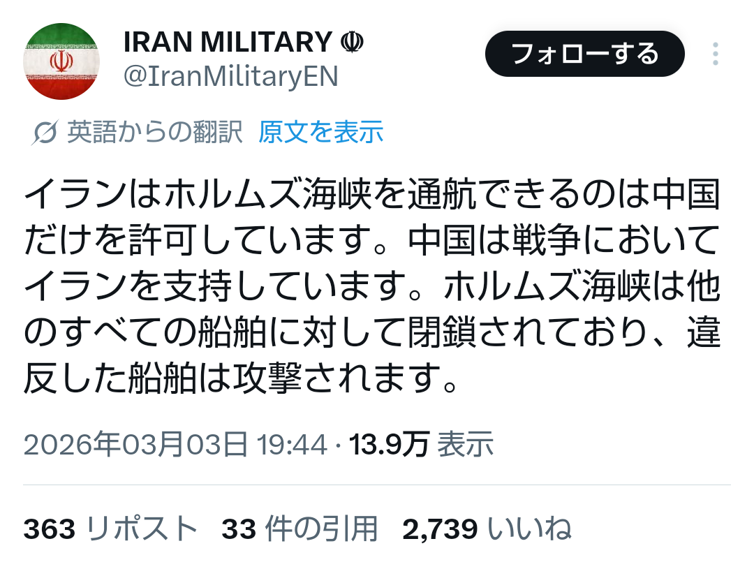 | … | 22無題Name名無し 26/03/01(日)13:11:47No.784173そうだねx5>イランの原油輸出先の89%は、中国向け。1月にトランプ政権が攻撃したベネズエラは85%が中国向けで、構図は同じです。 |