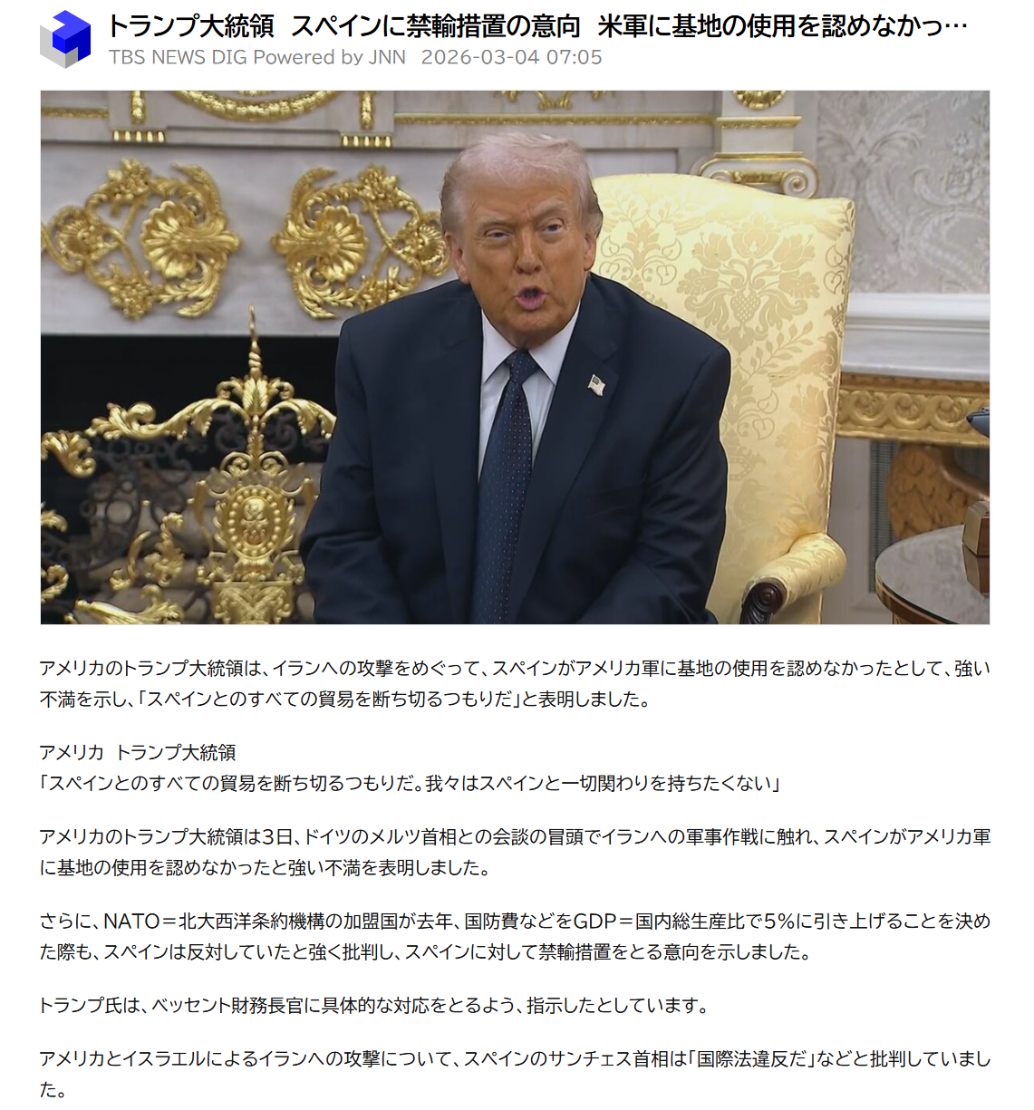 | … | 991無題Name名無し 26/03/05(木)14:06:23No.785318+>スペインはアメリカの今回の軍事作戦については非協力的だし |